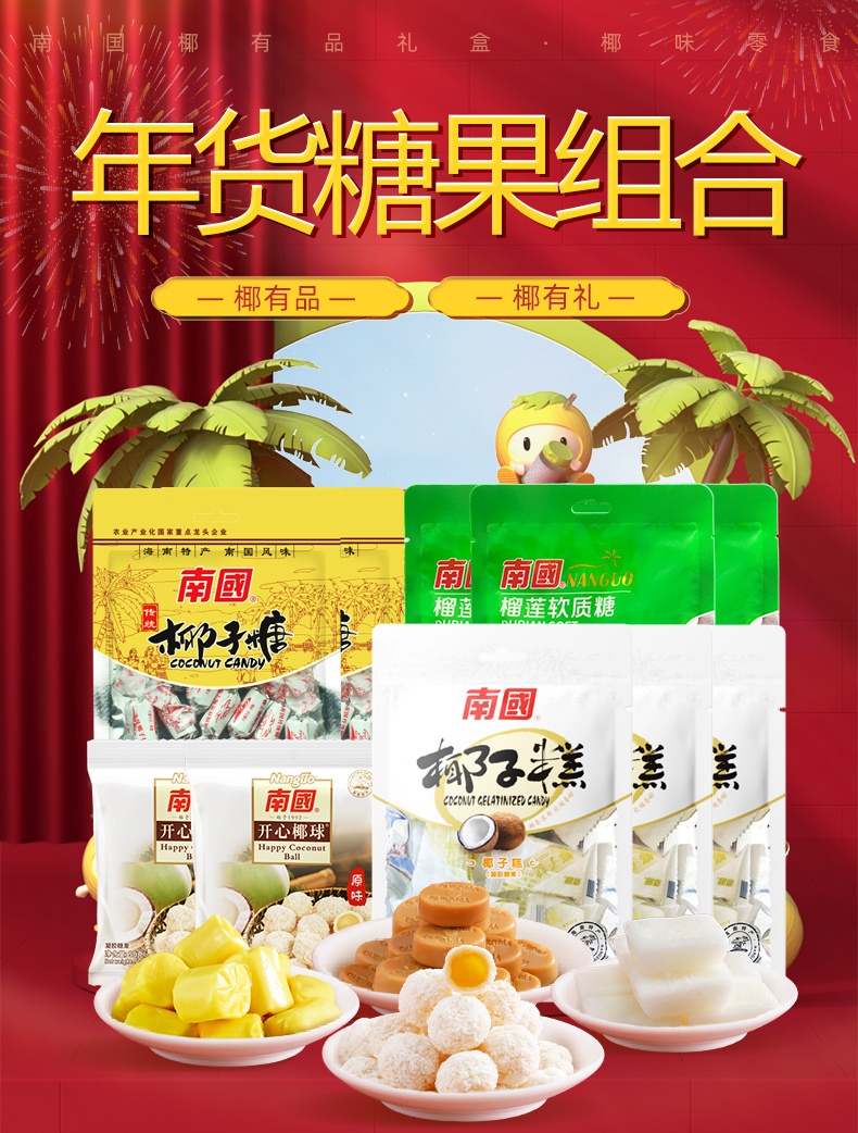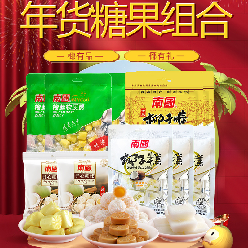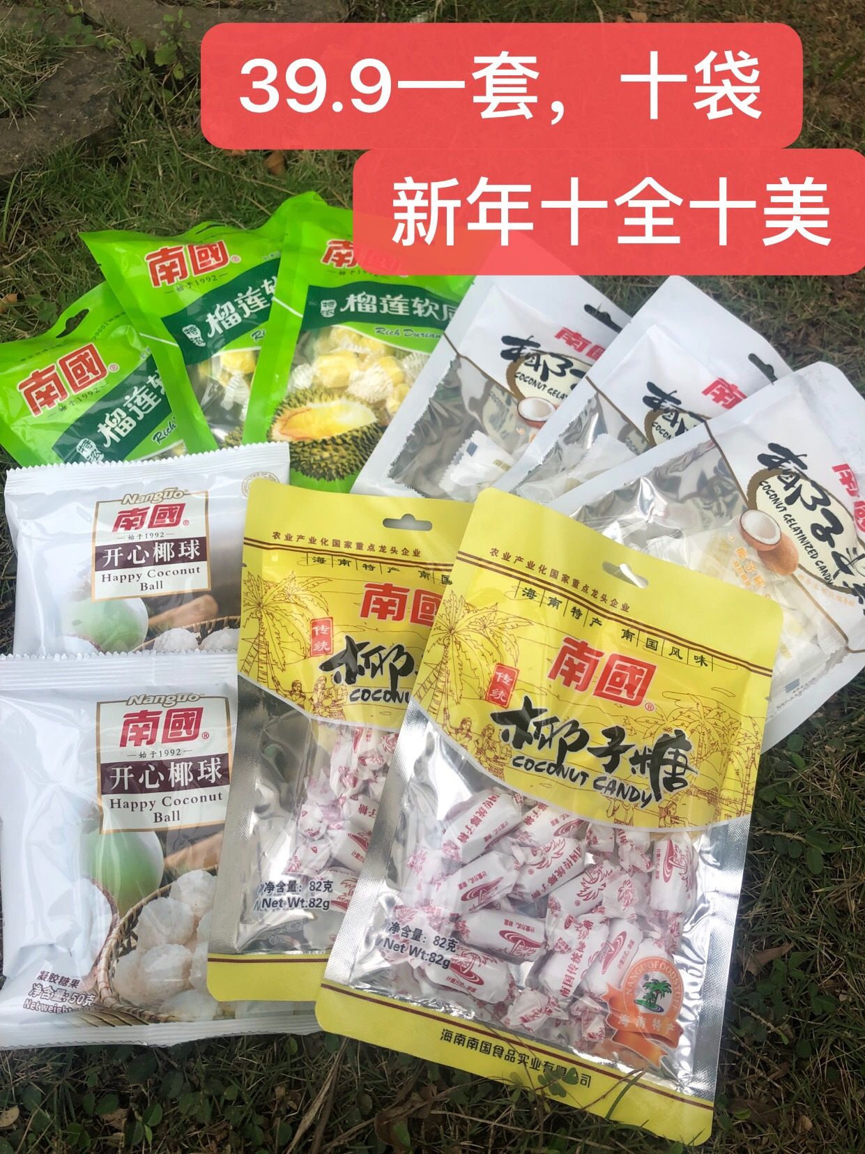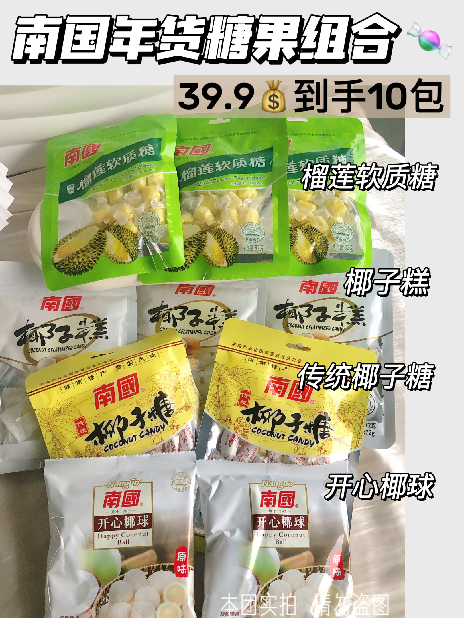 【2024南国新年糖果组合】 4个口味,39.9💰10袋 十全十美❤️椰香十足哦🥥 🧨南国年糖组合包含: 1️⃣82g传统椰子糖*2袋【新年一口椰香,甜甜蜜蜜】