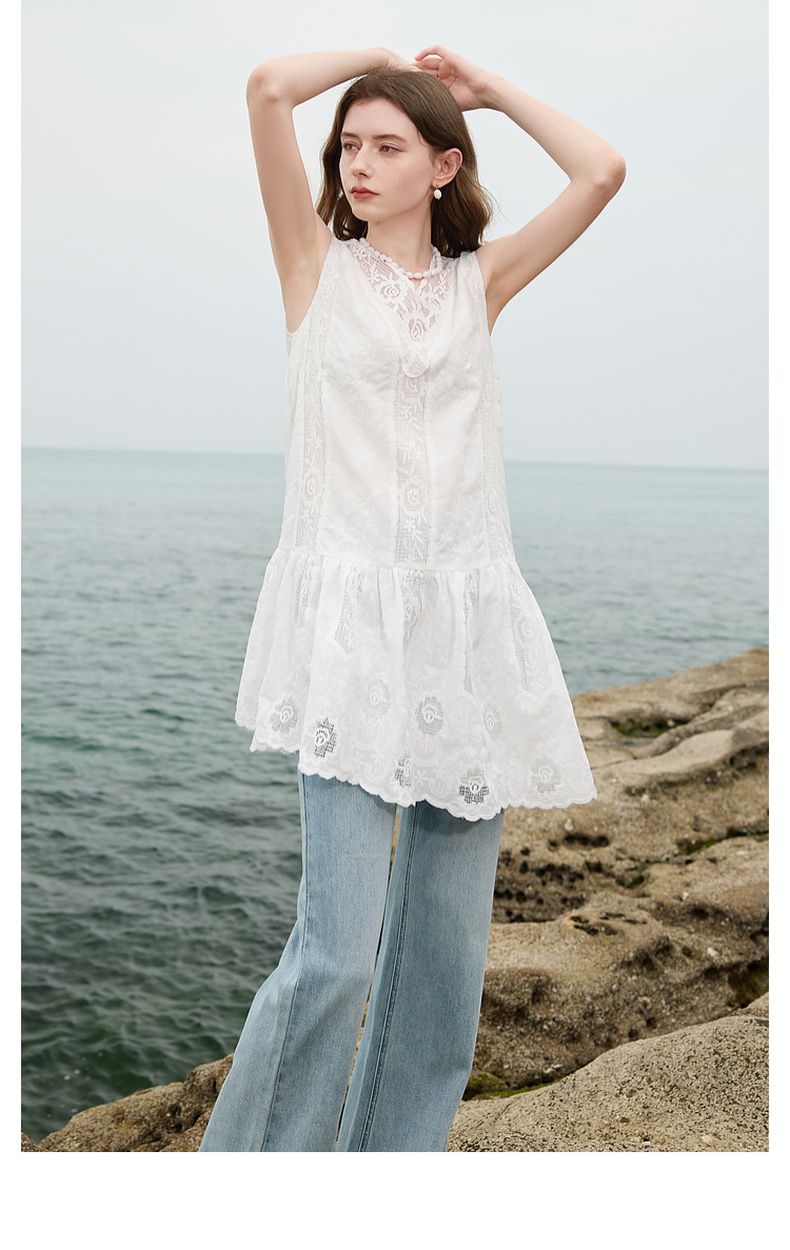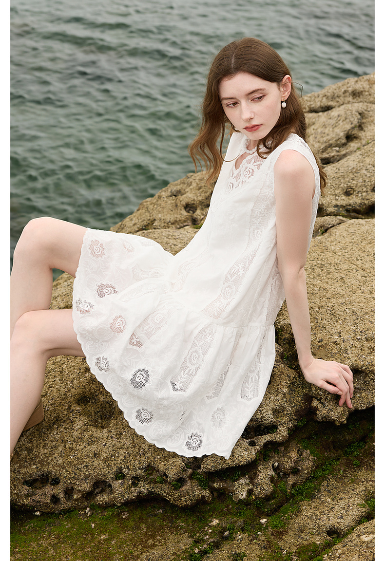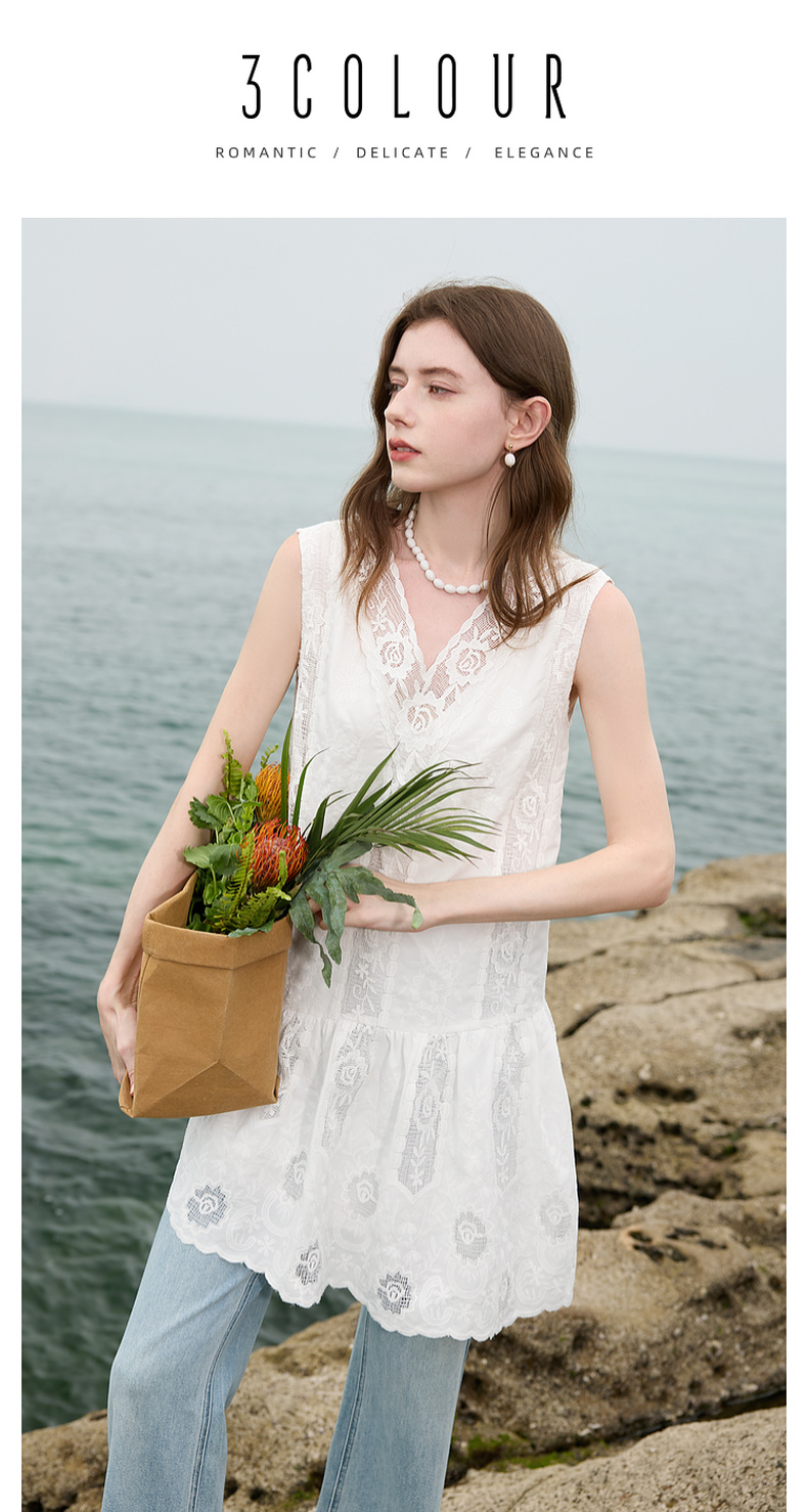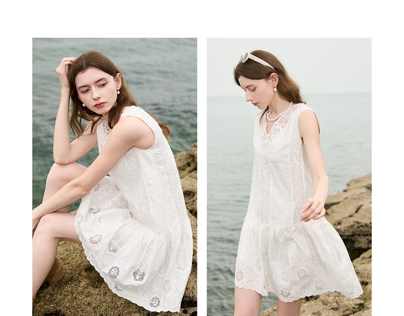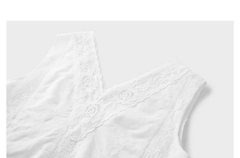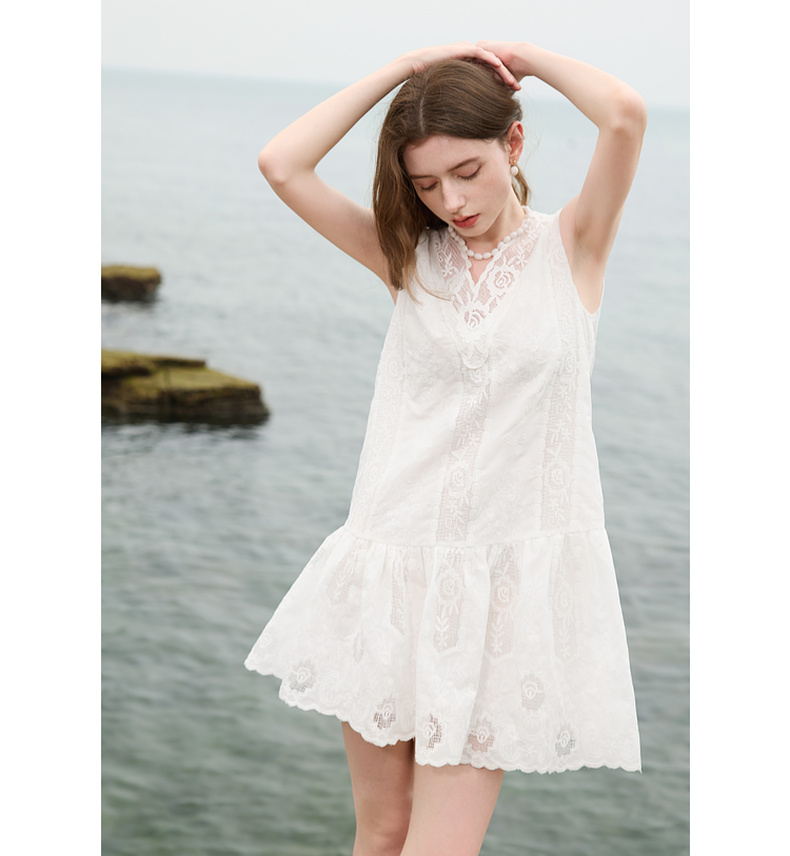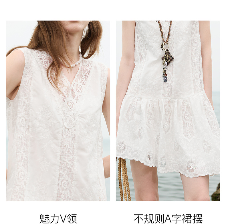 三彩2025夏季新款蕾丝小白裙连衣裙无袖V领A字裙短裙浪漫度假M