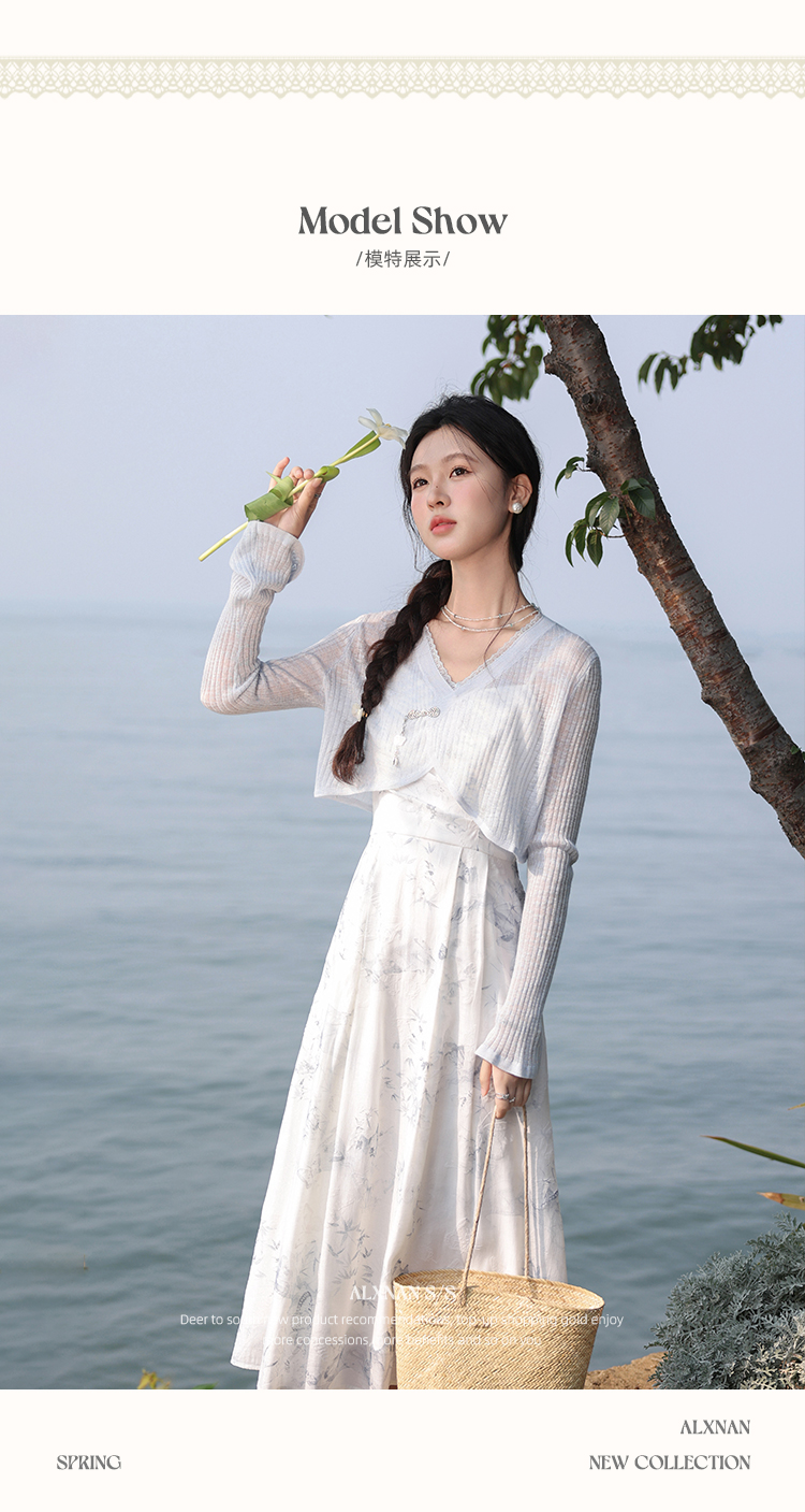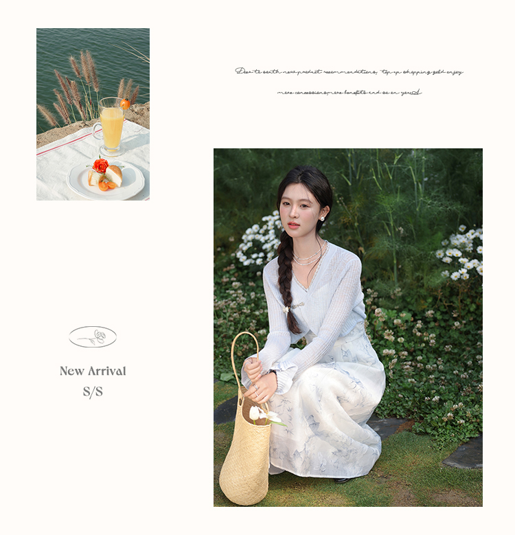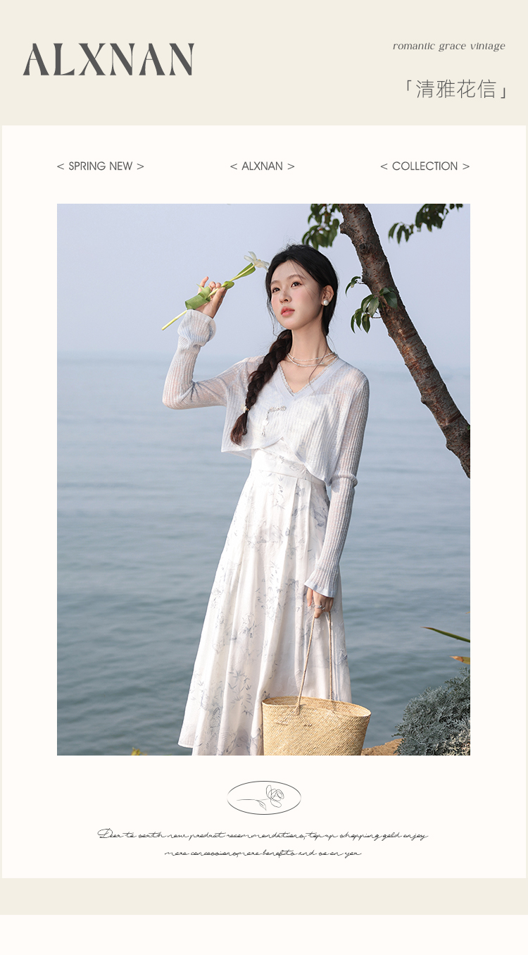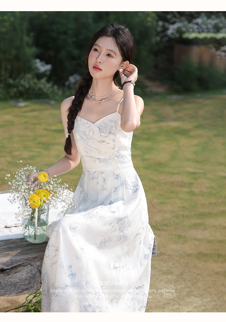 鹿向南「清雅花信」法式气质甜美印花吊带连衣裙女夏花朵收腰长裙