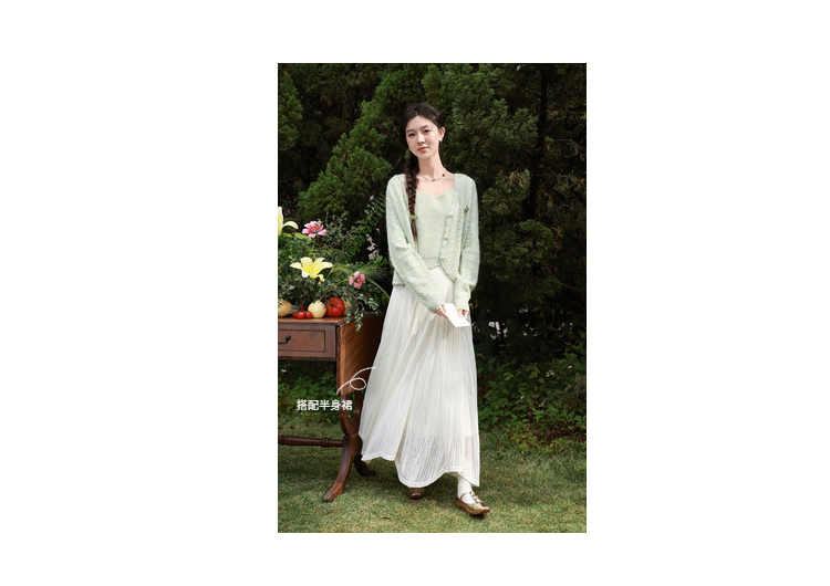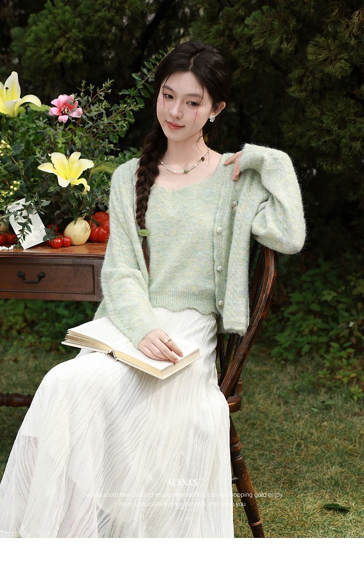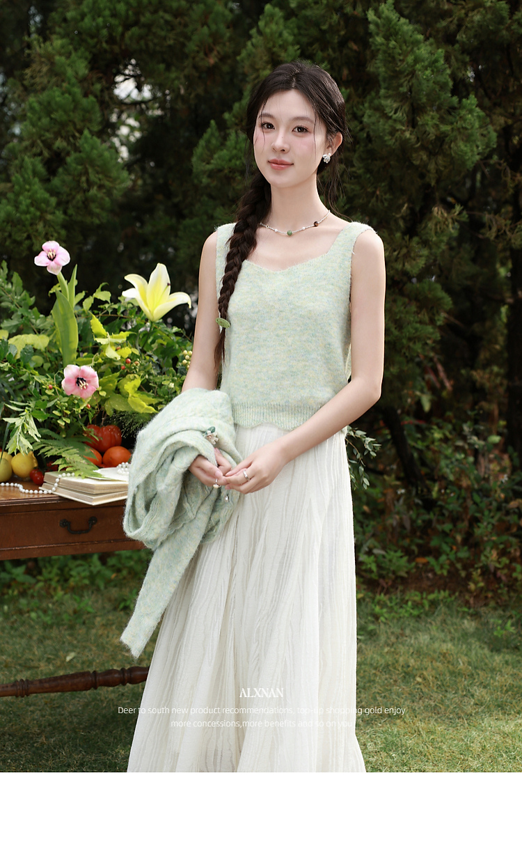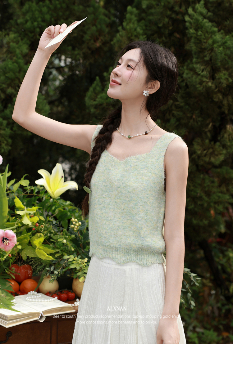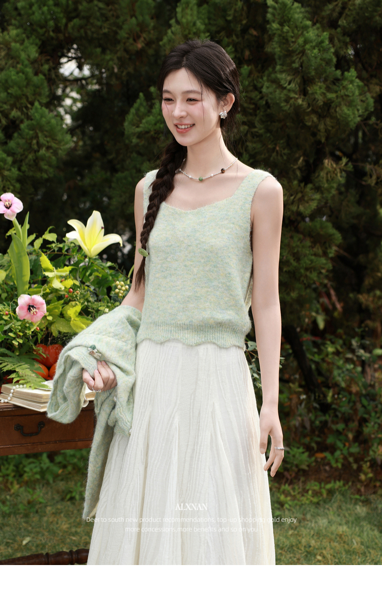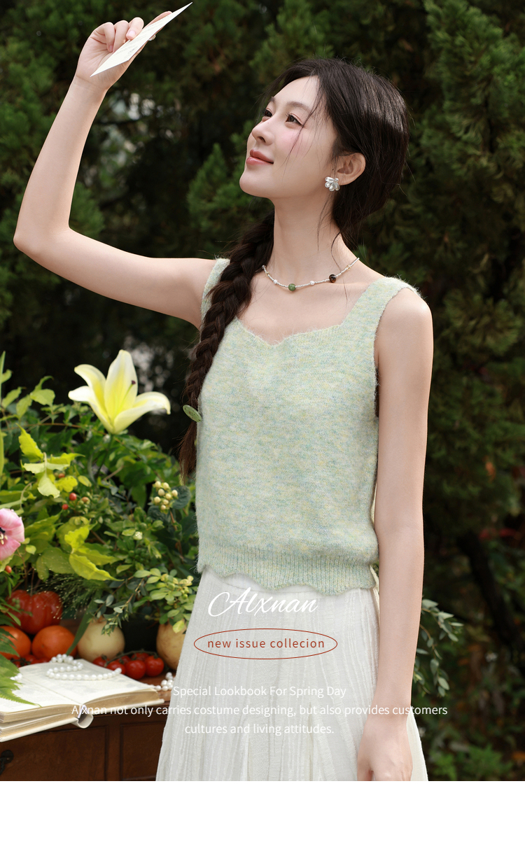 鹿向南「绿森花间」豆绿色针织吊带背心女春新款别致叠穿打底上衣