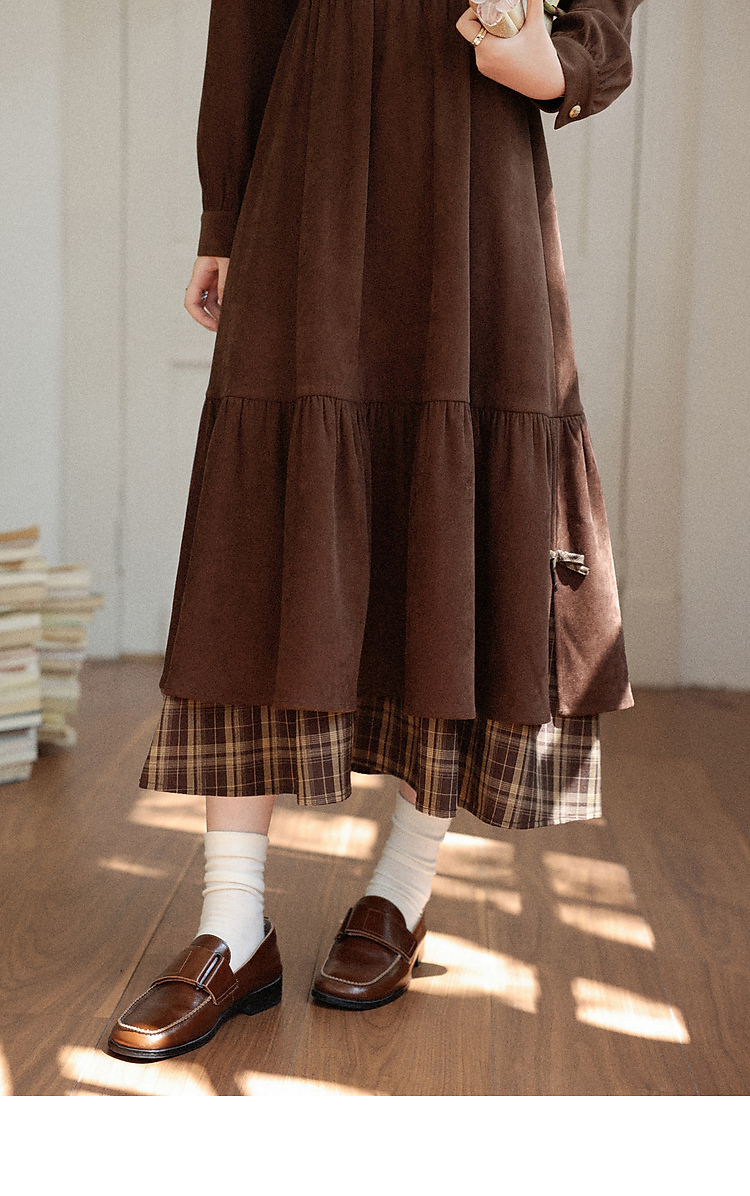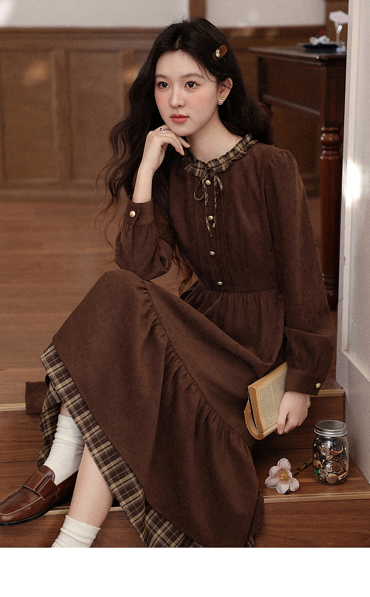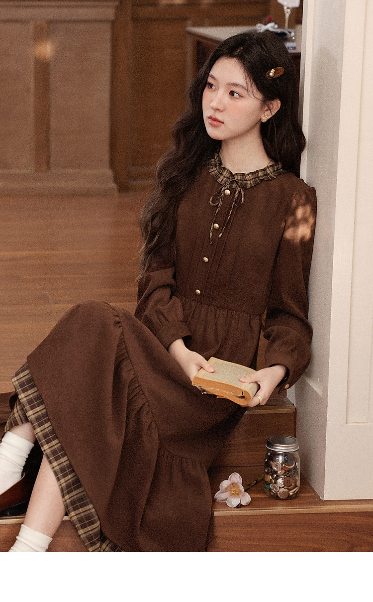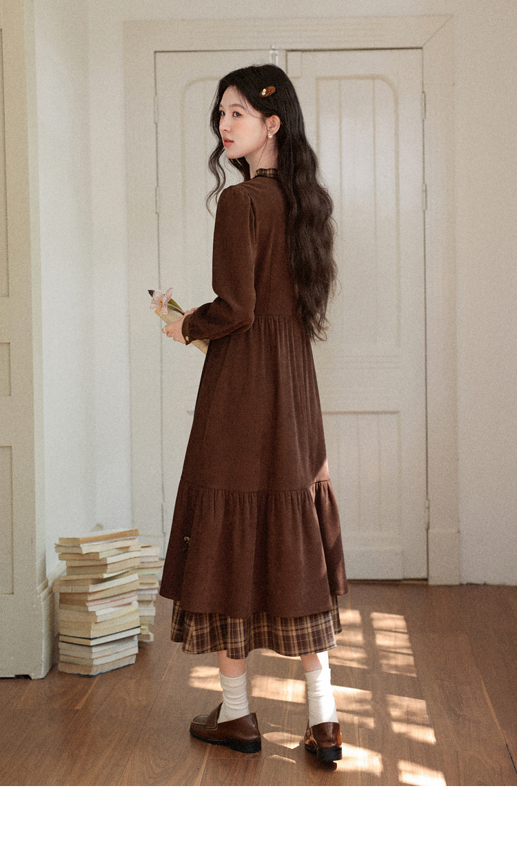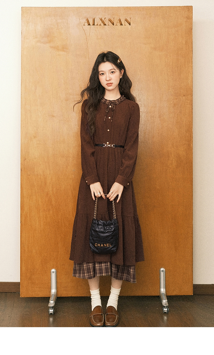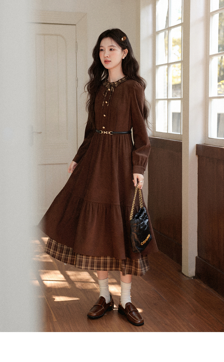 鹿向南「静匿港湾」棕色复古拼接连衣裙女秋冬收腰显瘦长袖裙子女