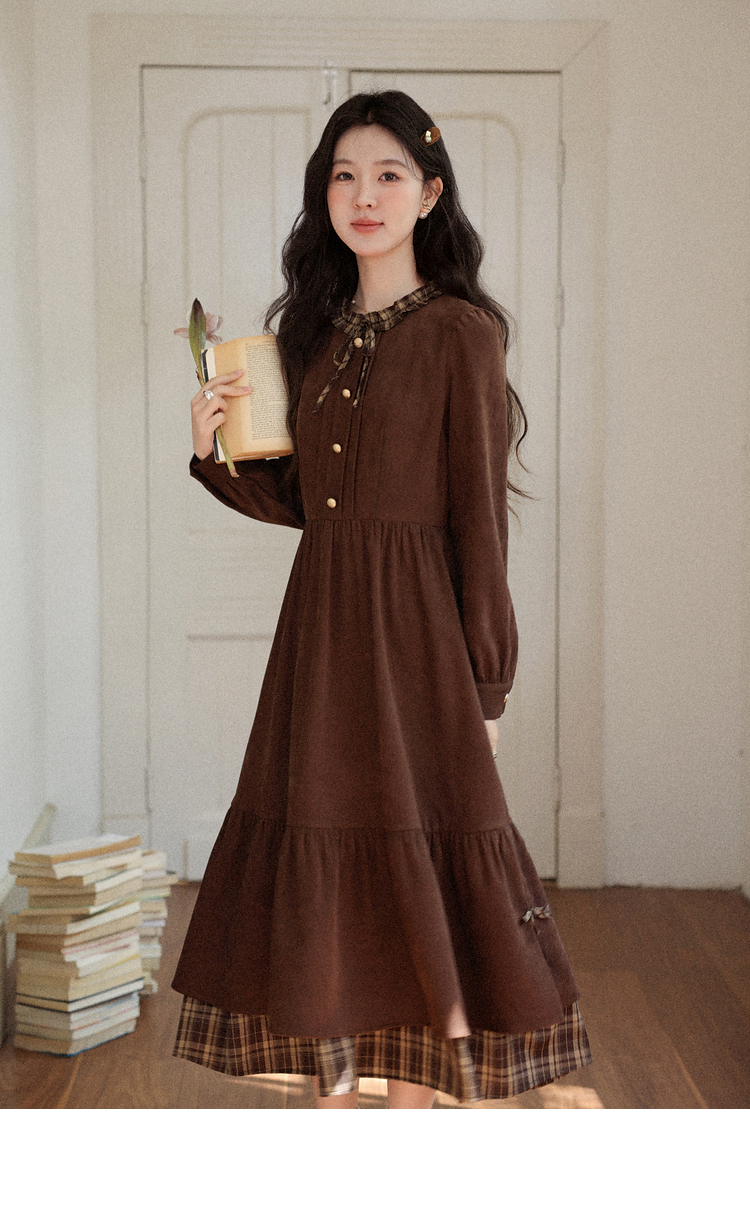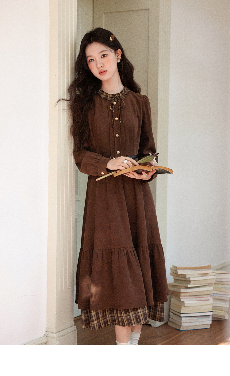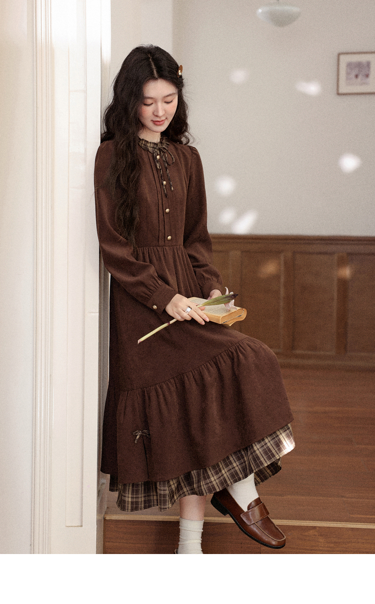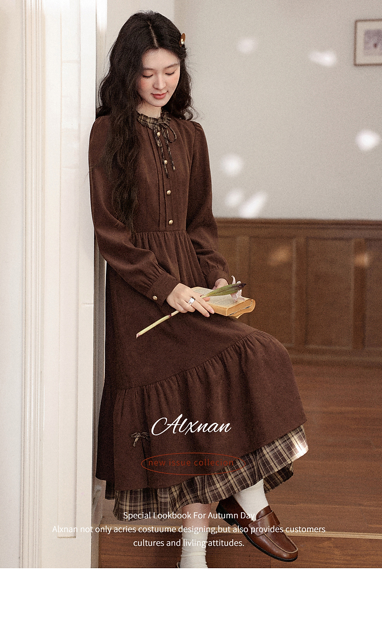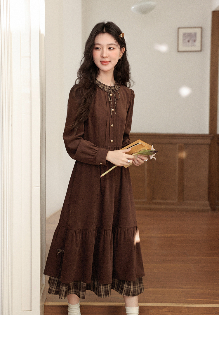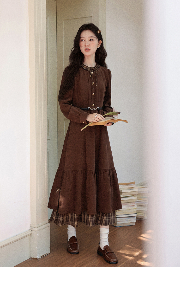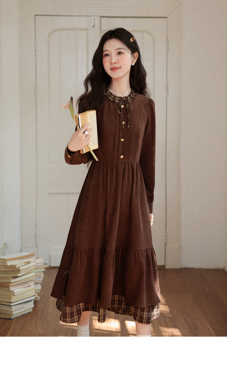 鹿向南「静匿港湾」棕色复古拼接连衣裙女秋冬收腰显瘦长袖裙子女