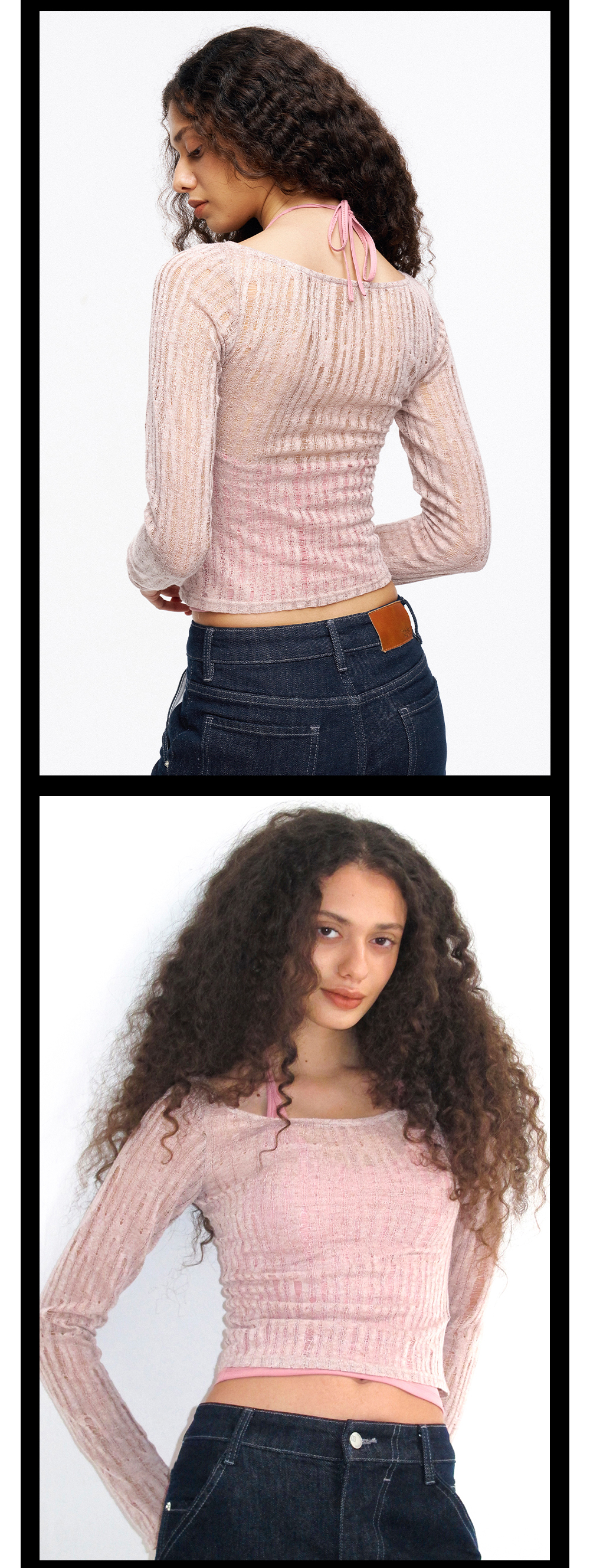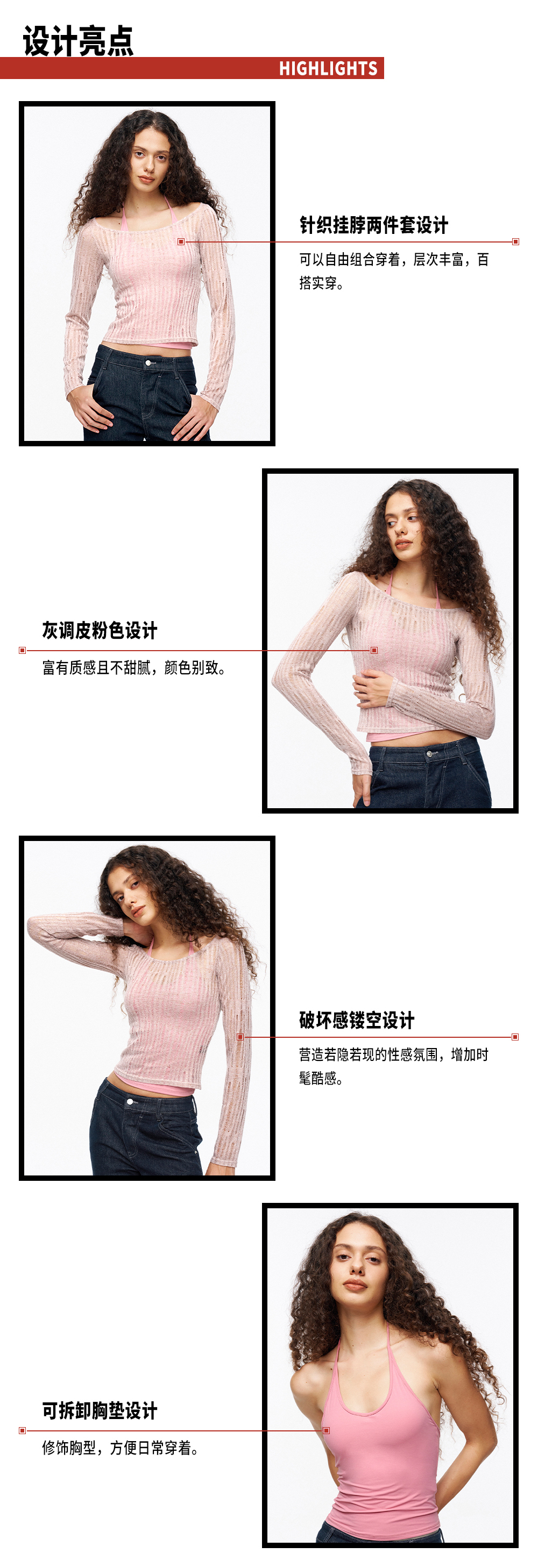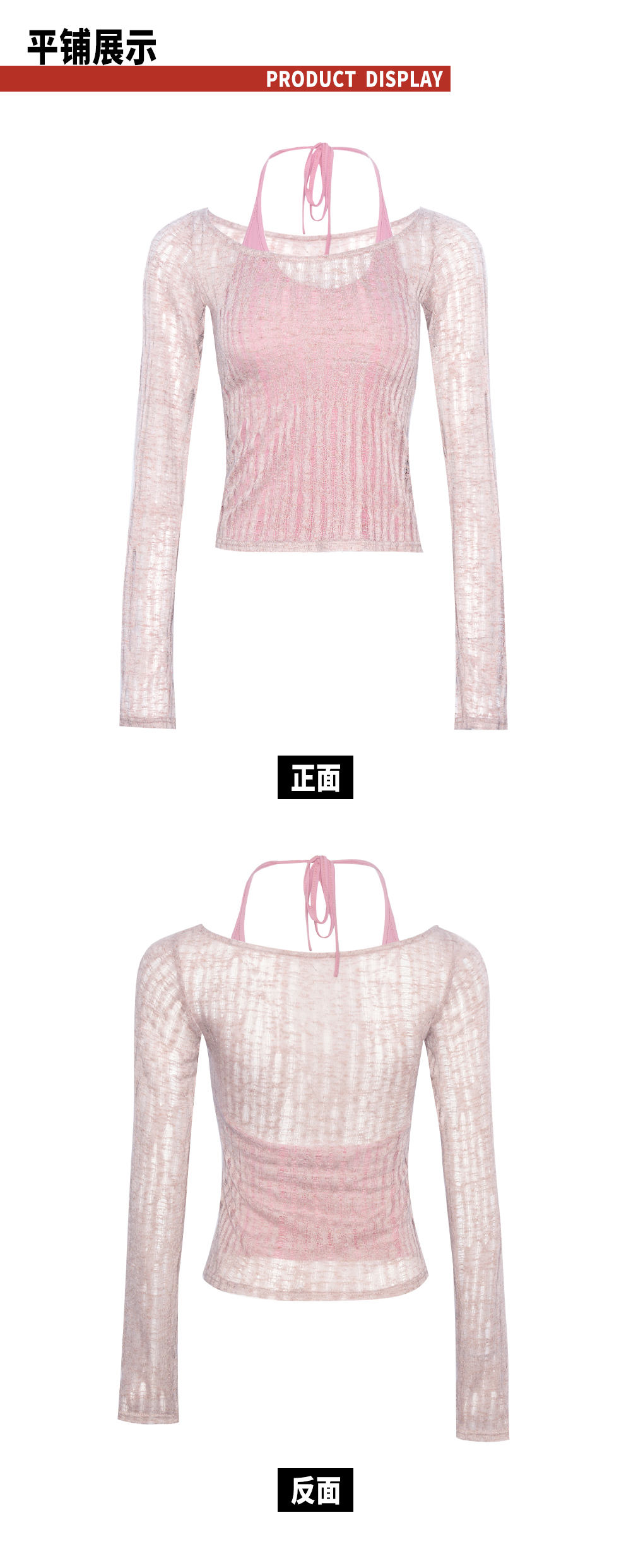 TR她热 蜜桃雾蕾 皮粉色针织镂空设计感两件套挂脖胸垫背心打底衫