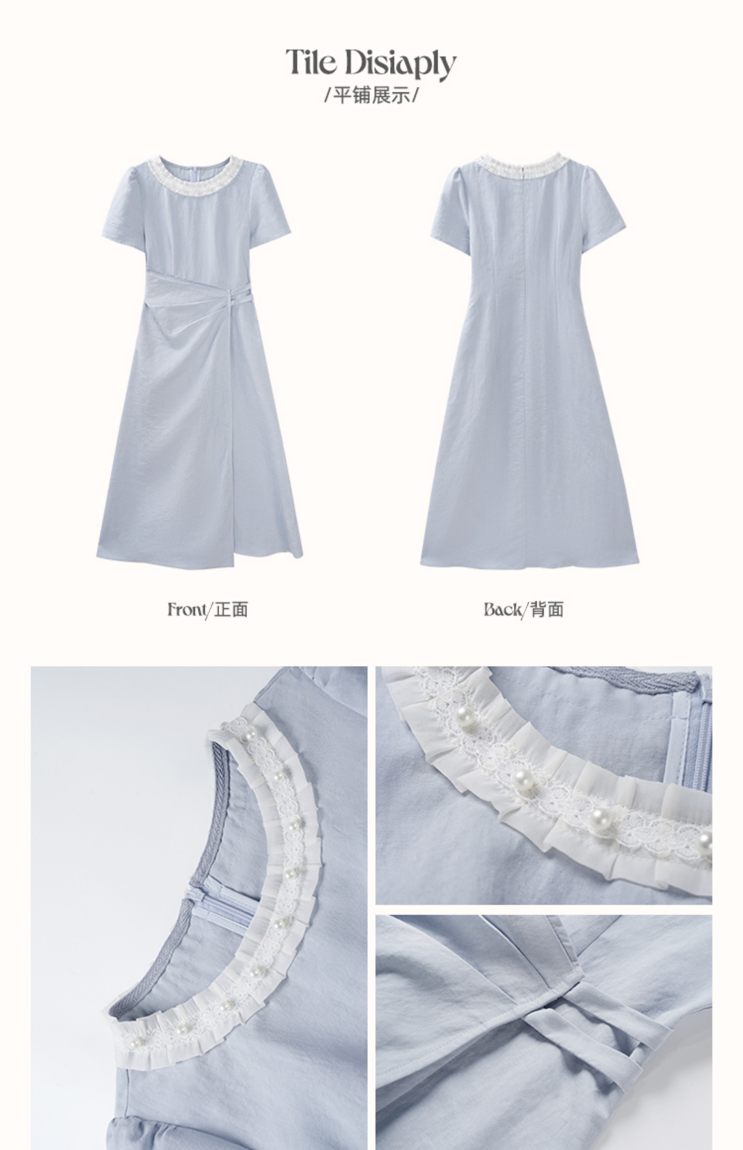 鹿向南「氧气奶蓝」法式气质短袖连衣裙女夏季收腰蓝色长款裙子潮