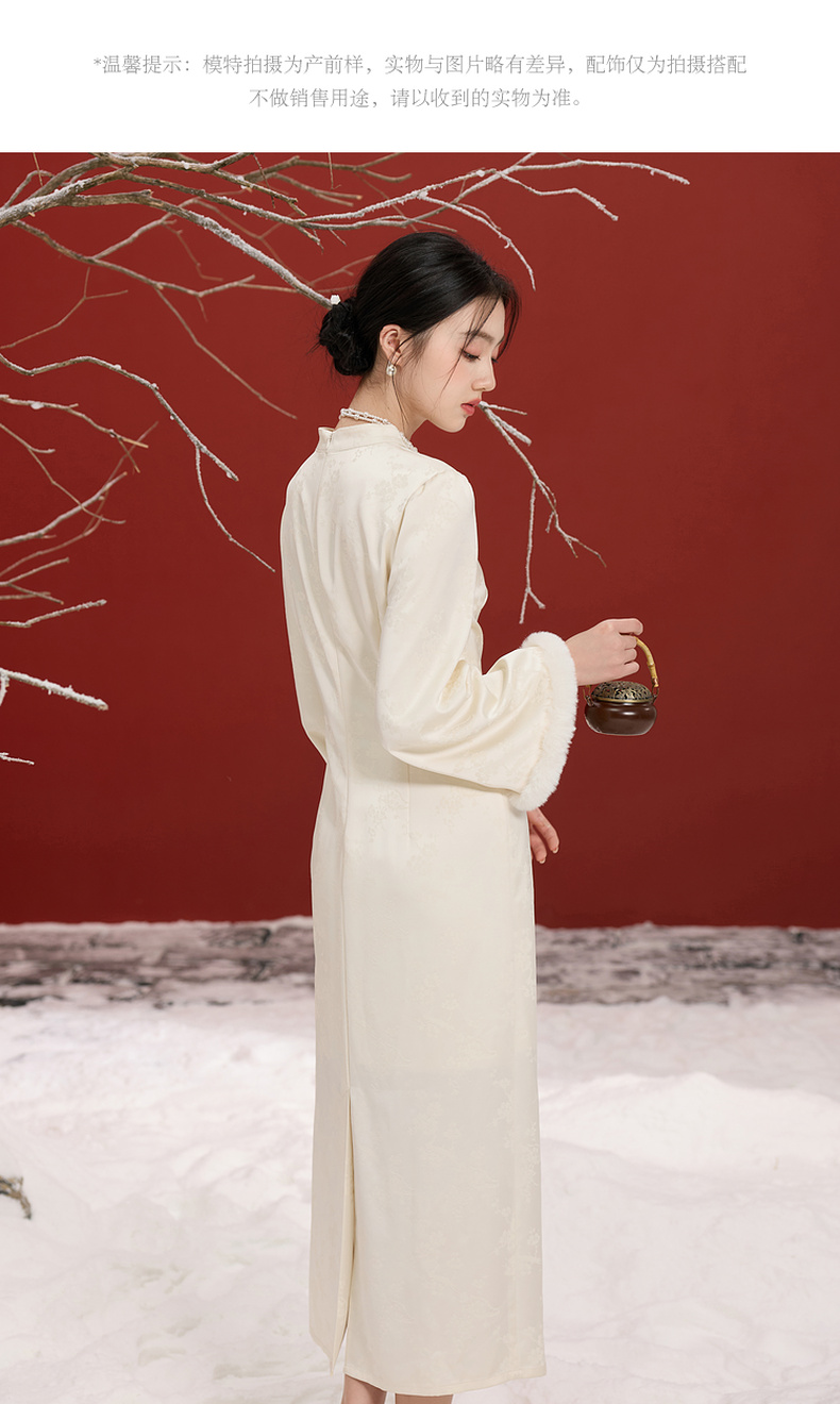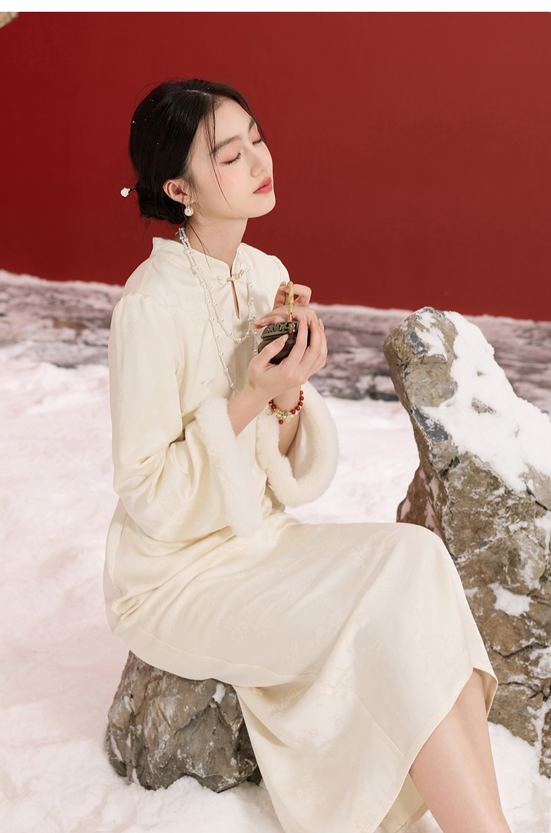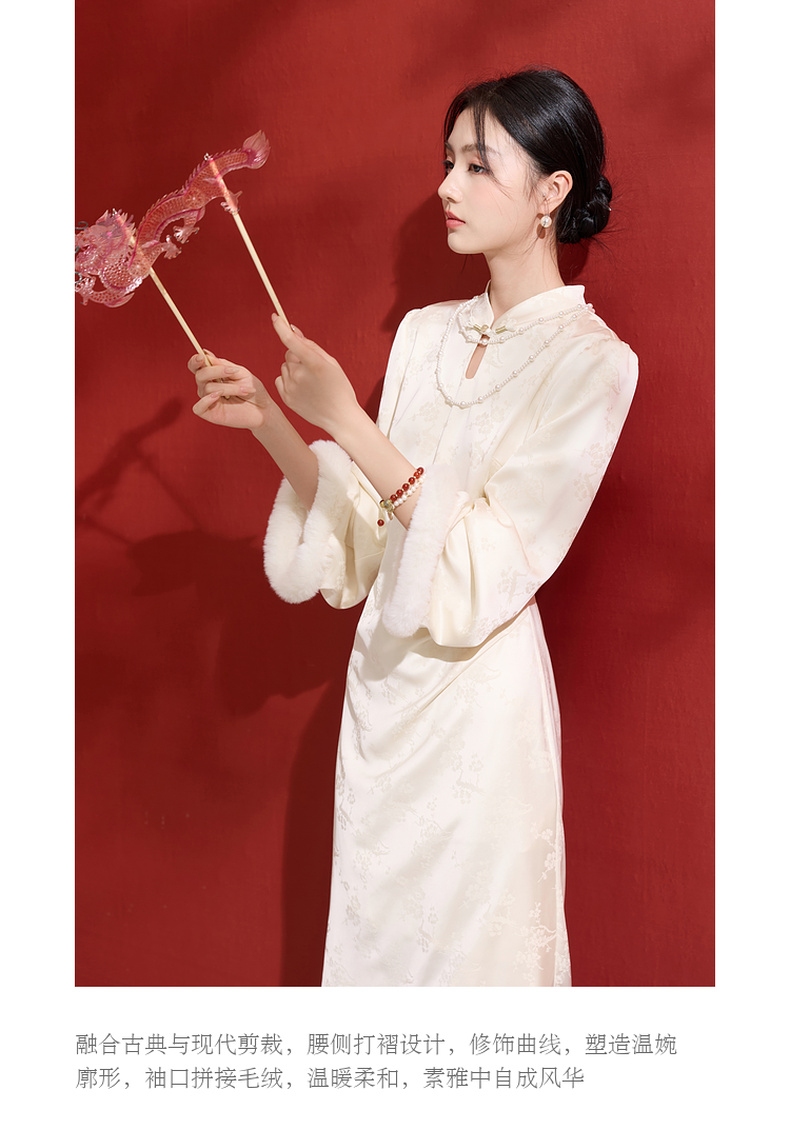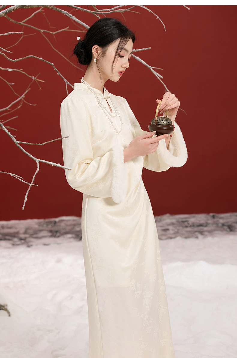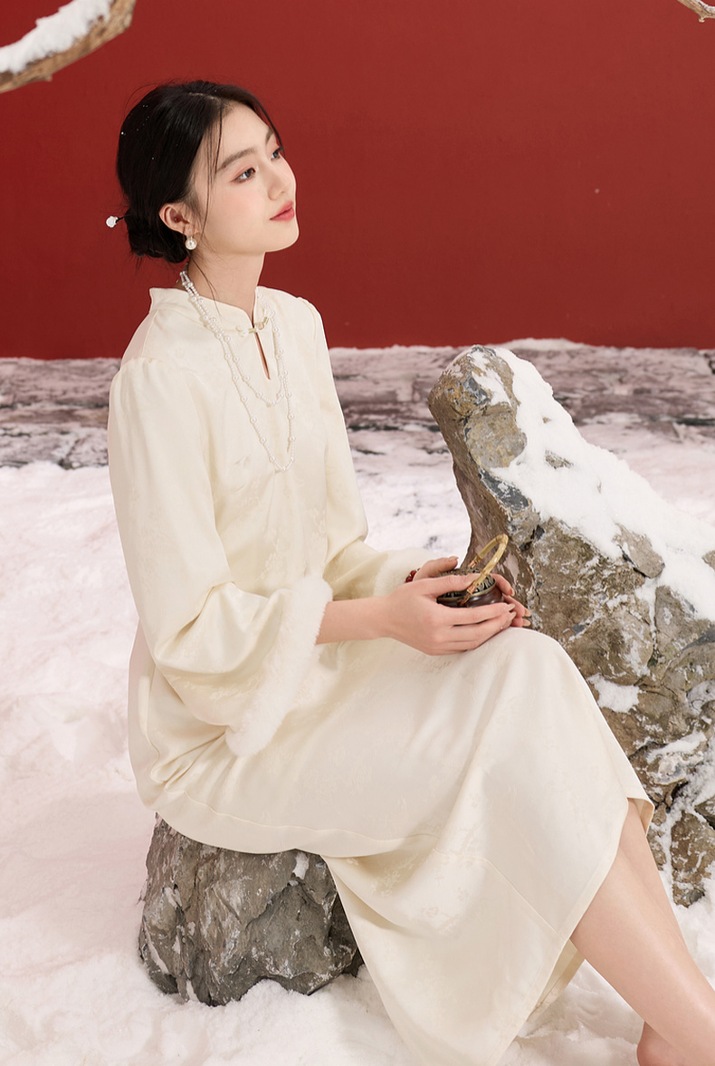 三彩【花影吹笙】2025冬季新款提花连衣裙盘扣打褶长裙C