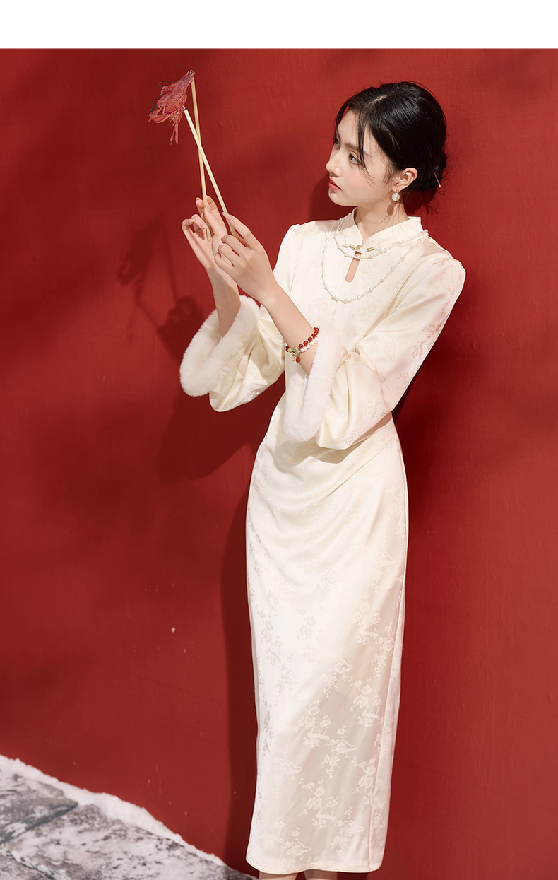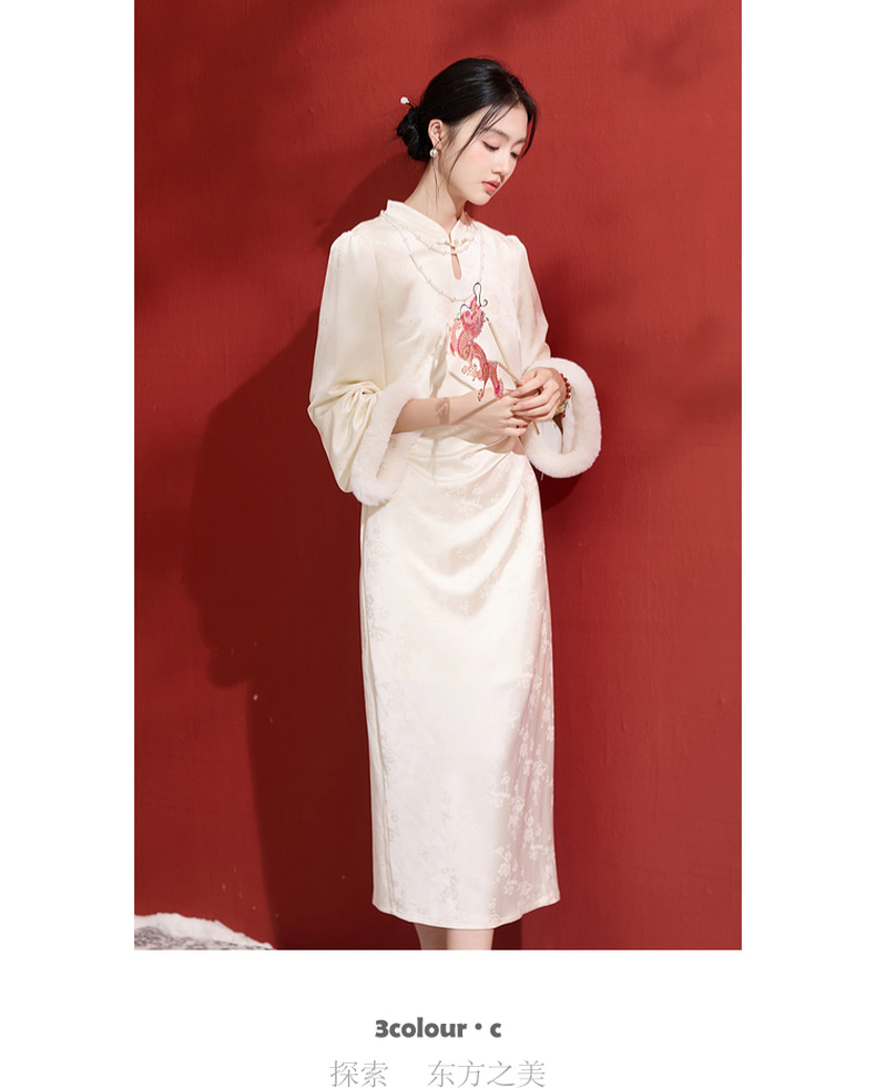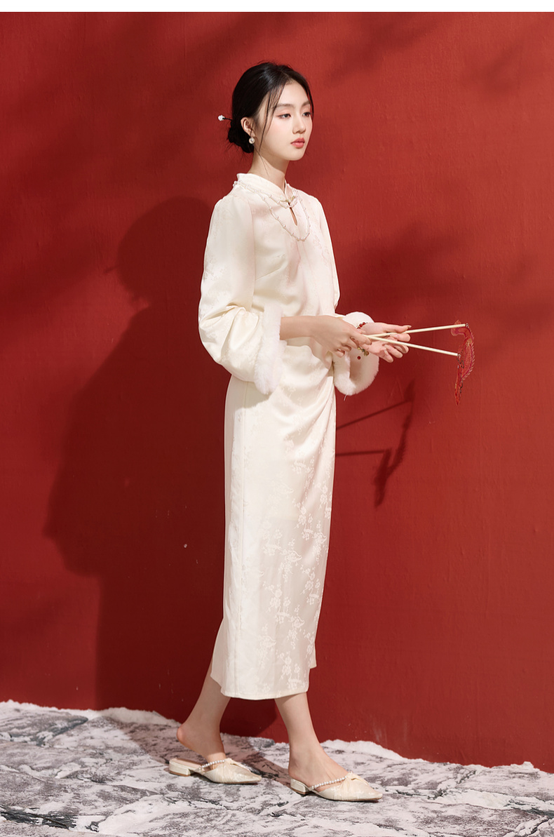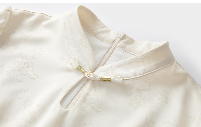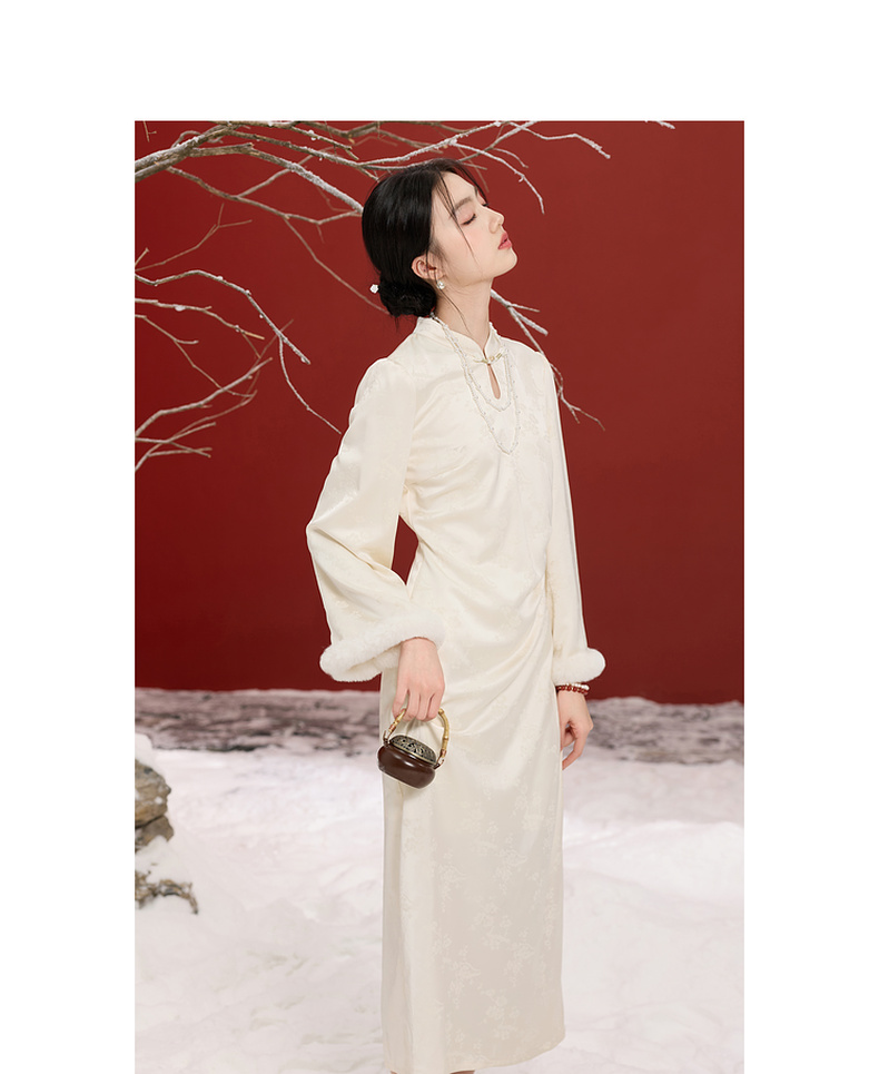 三彩【花影吹笙】2025冬季新款提花连衣裙盘扣打褶长裙C