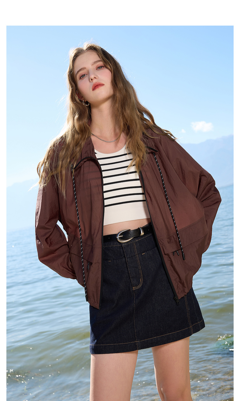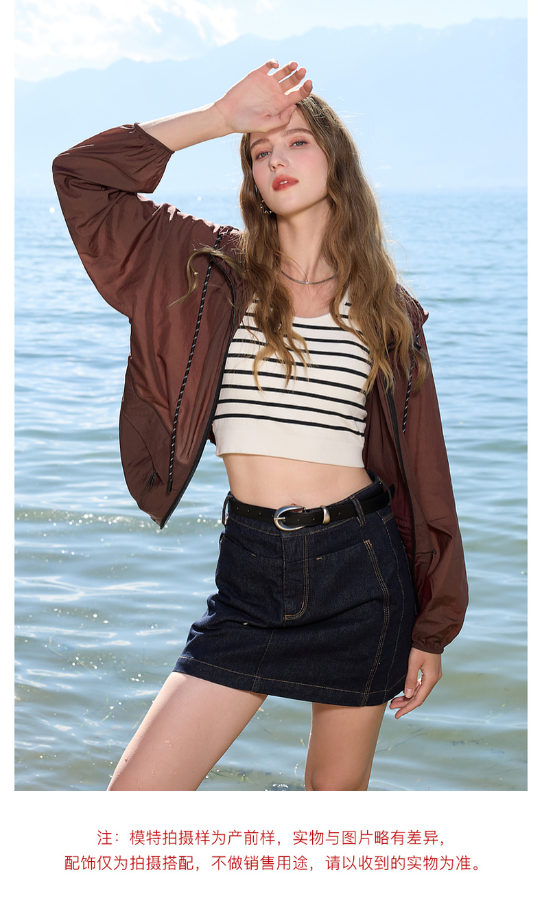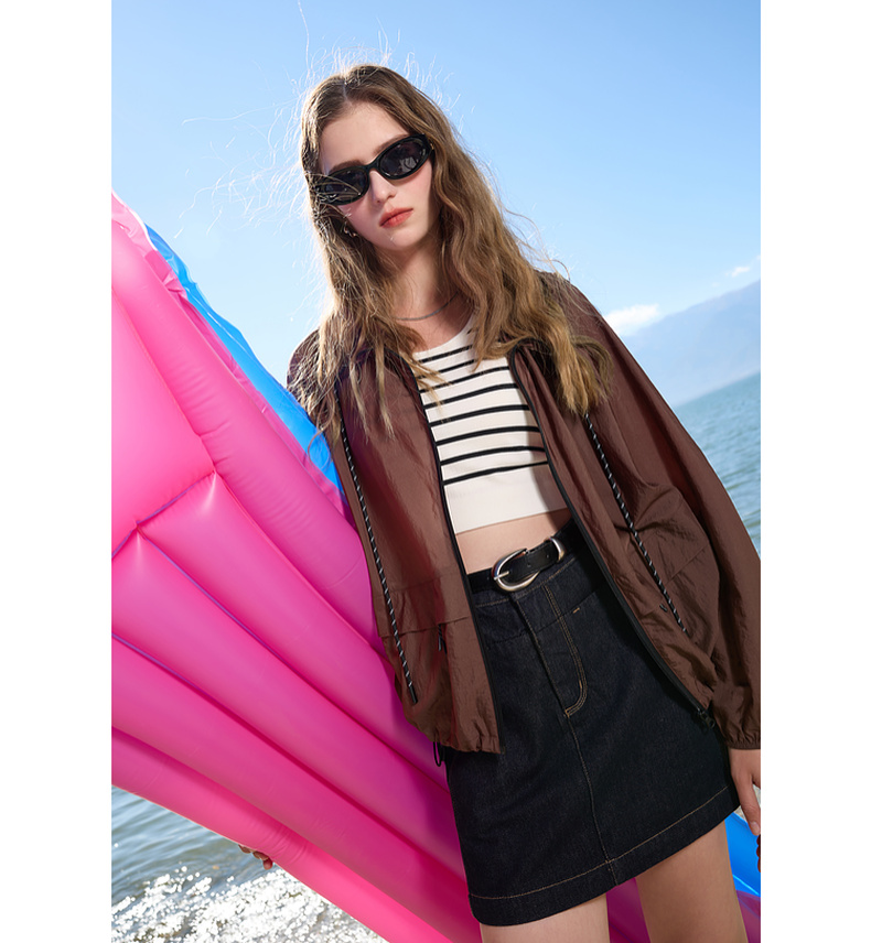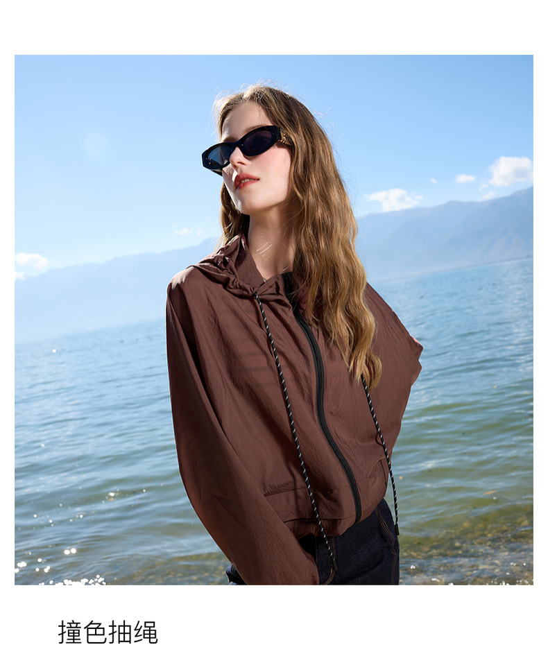 三彩2025春季新款宽松撞色抽绳连帽防晒衫休闲外套轻薄防紫外线M