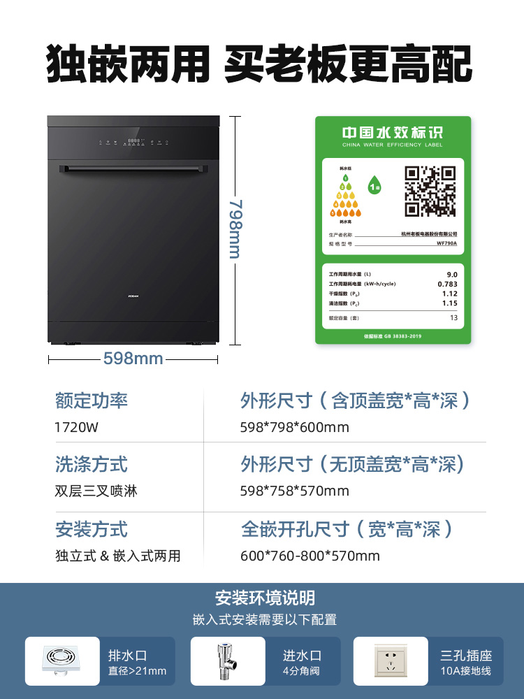 老板洗碗机台式WF790A全自动智能一体家用13套消毒烘干嵌入式套机