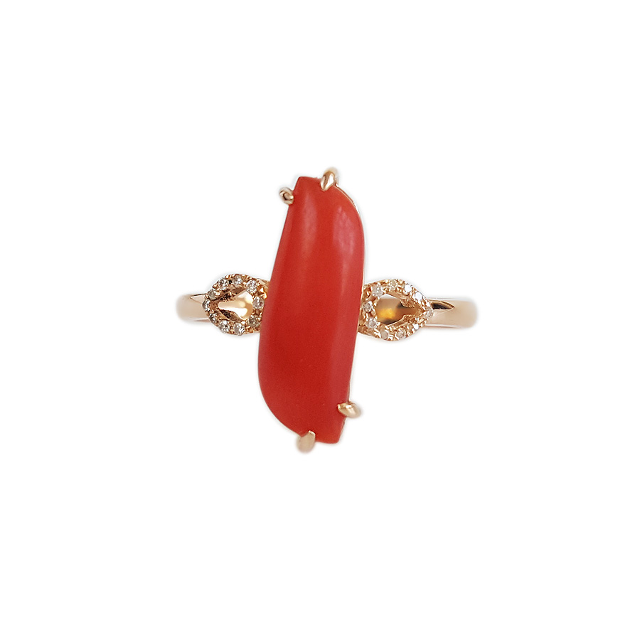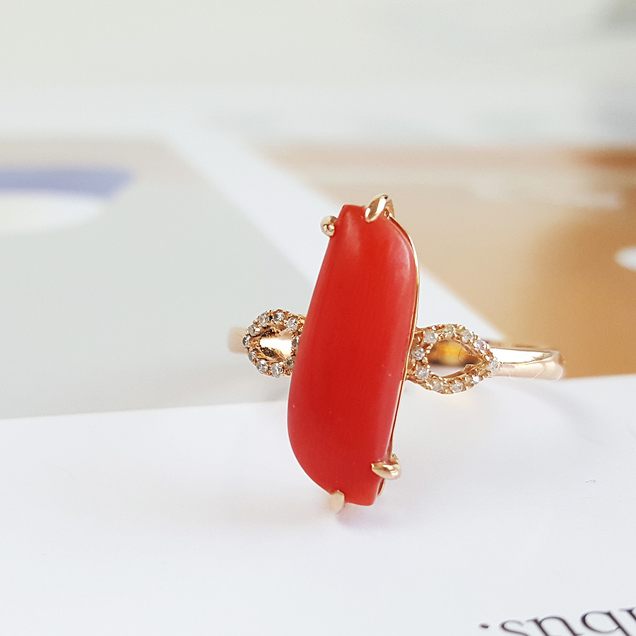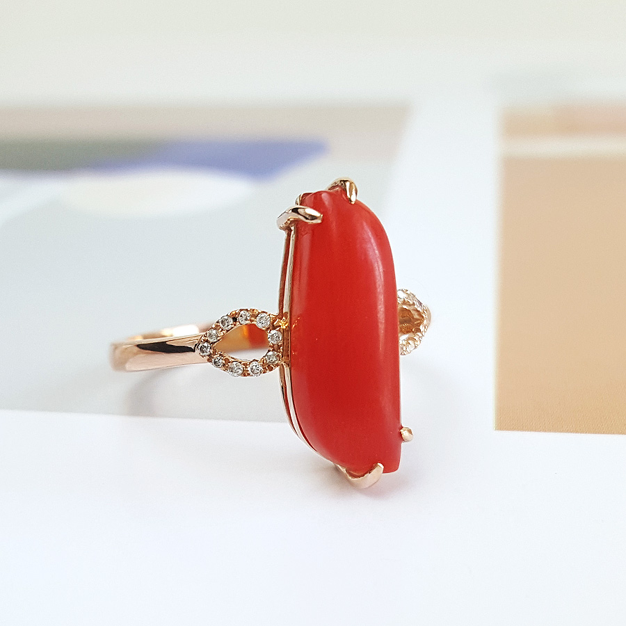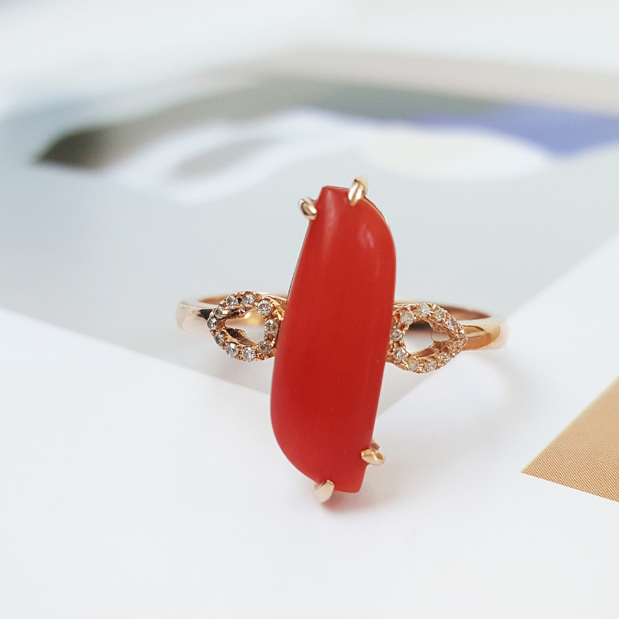 【天然正品】天然随形沙丁级红珊珊AU750玫瑰金镶钻戒指13.5号(戒圈可改)现售价:2480!100324NJS27