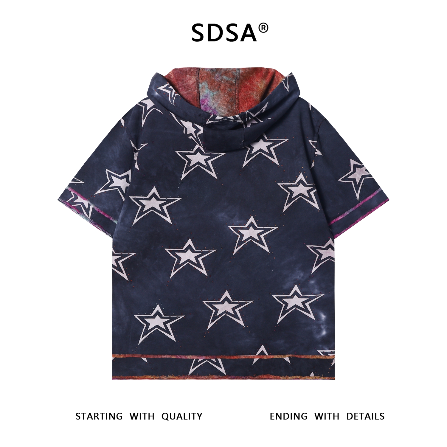 T3521夏季高级感新款男士撞色磨破星星设计连帽短袖T恤高街痞帅上衣
