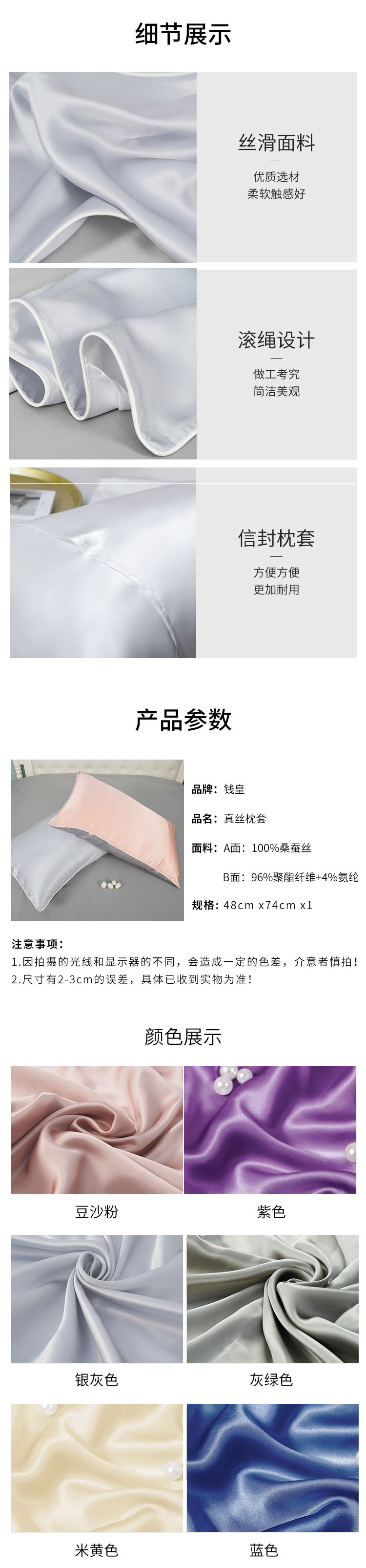 品牌:钱皇 品名:100%桑蚕丝AB面19姆米重磅真丝枕套 规格:一个装、一对装 颜色: A面:灰色、粉色、灰绿色、紫色、蓝色、米黄色 B面:白色 面料: A面:100%桑蚕丝 B面:96%聚酯纤维+4%氨纶 尺寸:48x74cm 产地:江西/桐乡 发货地:浙江桐乡 发货时间:下单一般72小时内发货(周末、节假日除外) 发货快递:圆通、顺丰、邮政随机发货(暂不支持指定) 运费模板:该商品全国部分地区包邮(新疆、西藏需补差运费10元/单,港澳台不发货,请知悉) 售后政策:本品包装配件完整、未水洗、不影响二次销售支持7天无理由退换货(无运费险),请知悉 注意事项: |
