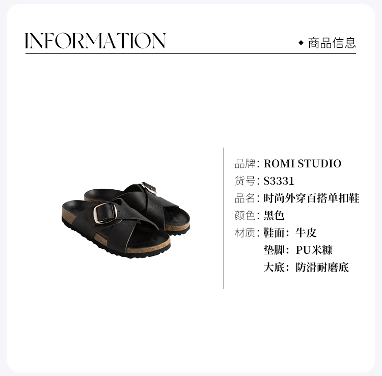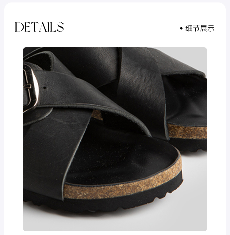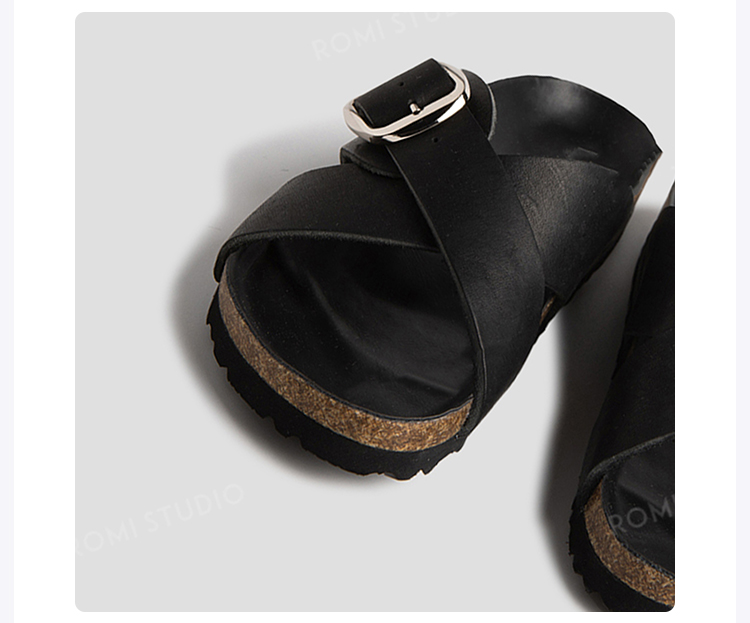 ROMI STUDIO休闲百搭 时尚外穿交叉单扣平底黑色软木拖鞋 S3331