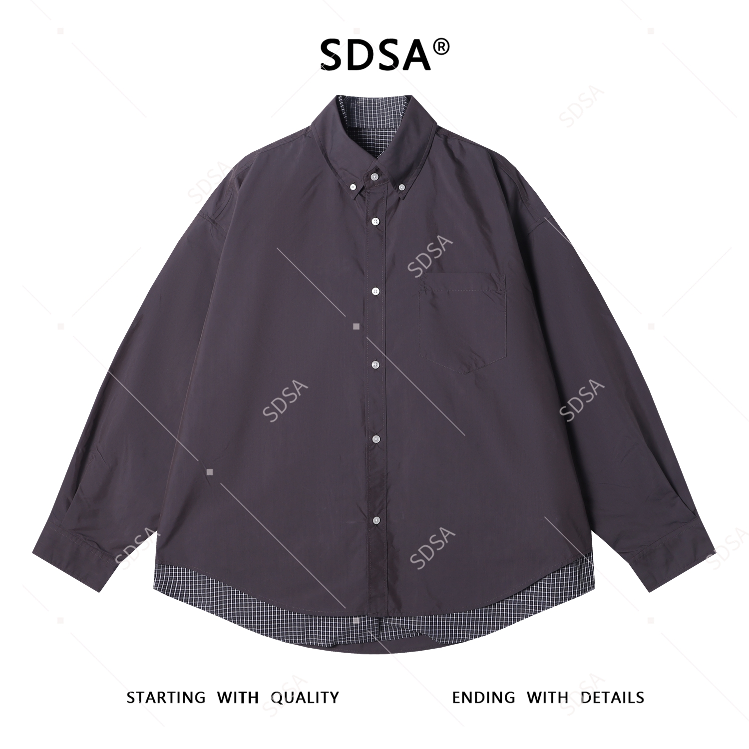 SDSA秋冬新款痞帅男装潮牌拼接格子翻领假两件衬衫时尚简约衬衣