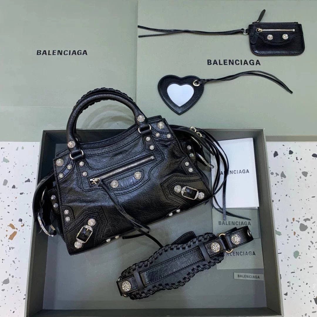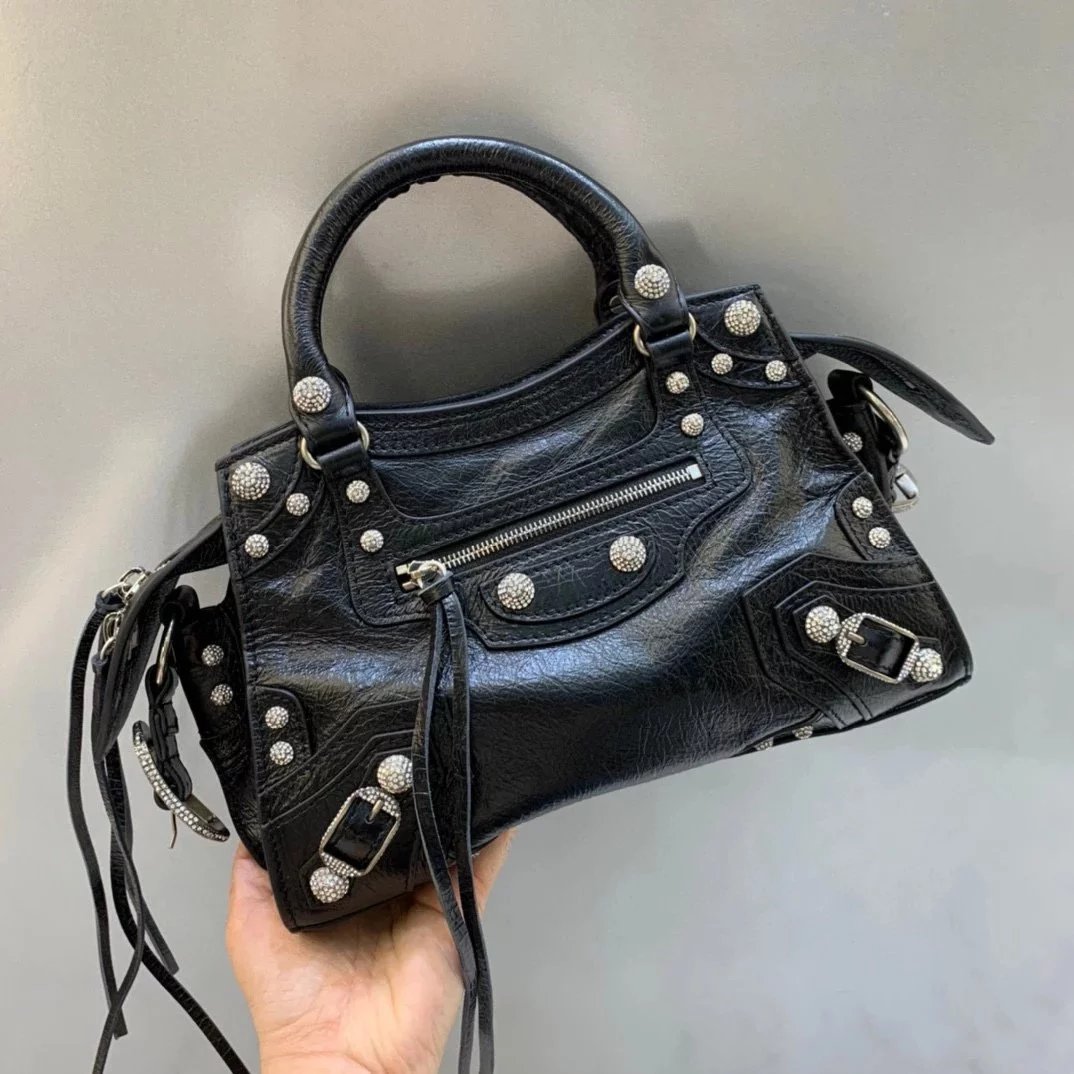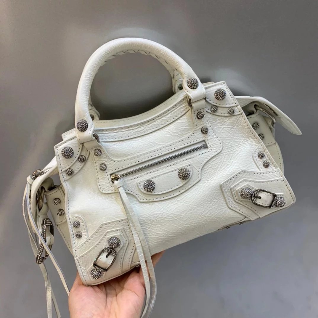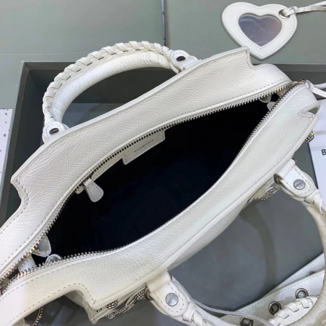 巴黎|巴黎新款Neo cagole机车包|JM <油蜡白带钻> Balenciag 巴黎新款Neo cagole机车包 这次配备了爱心小镜子,酷飒的外表下是一颗甜心 拎上就能整个气场,轻而易举的帅一地呀,甜心辣妹必入 尺寸:26x13x18cm