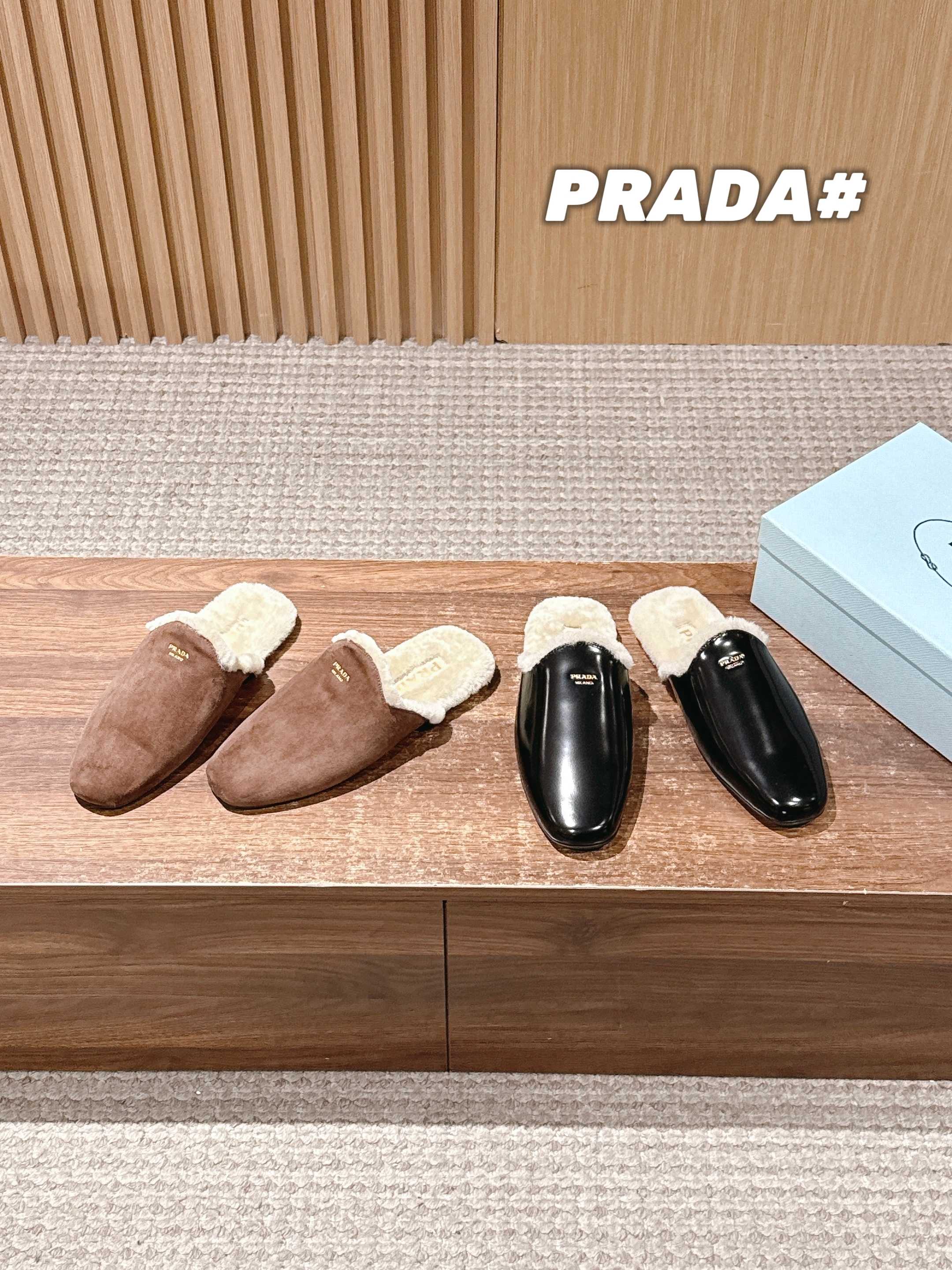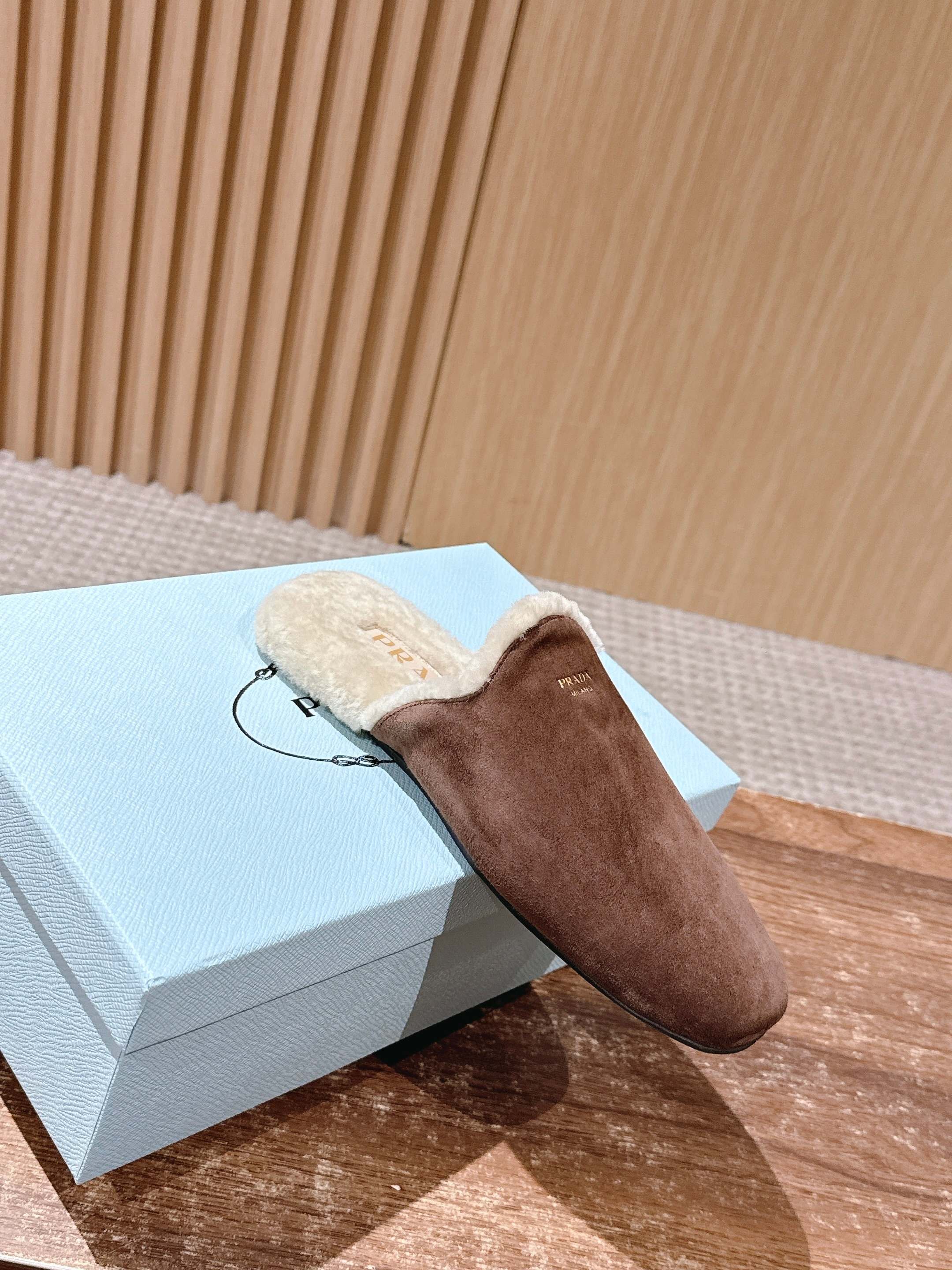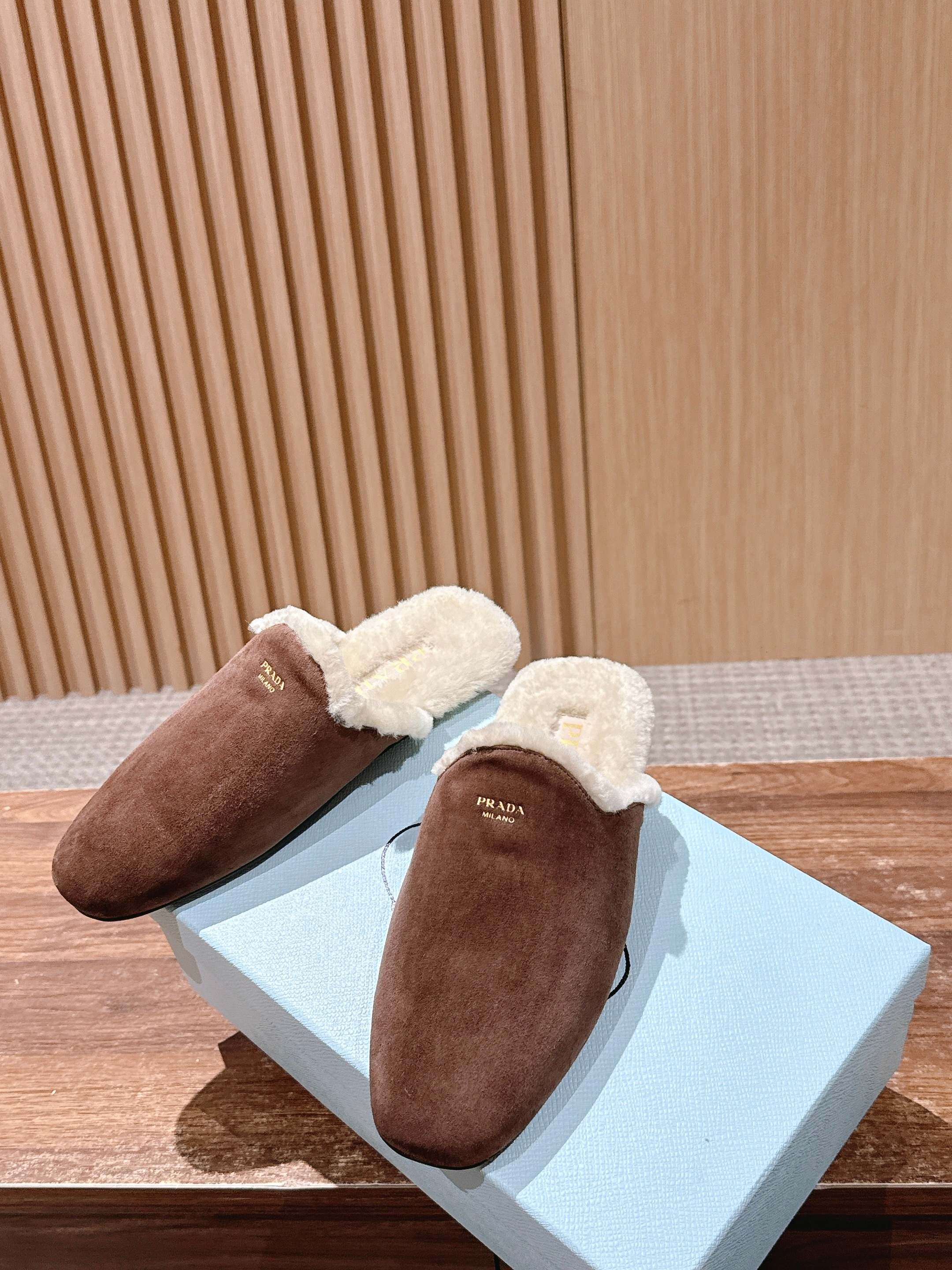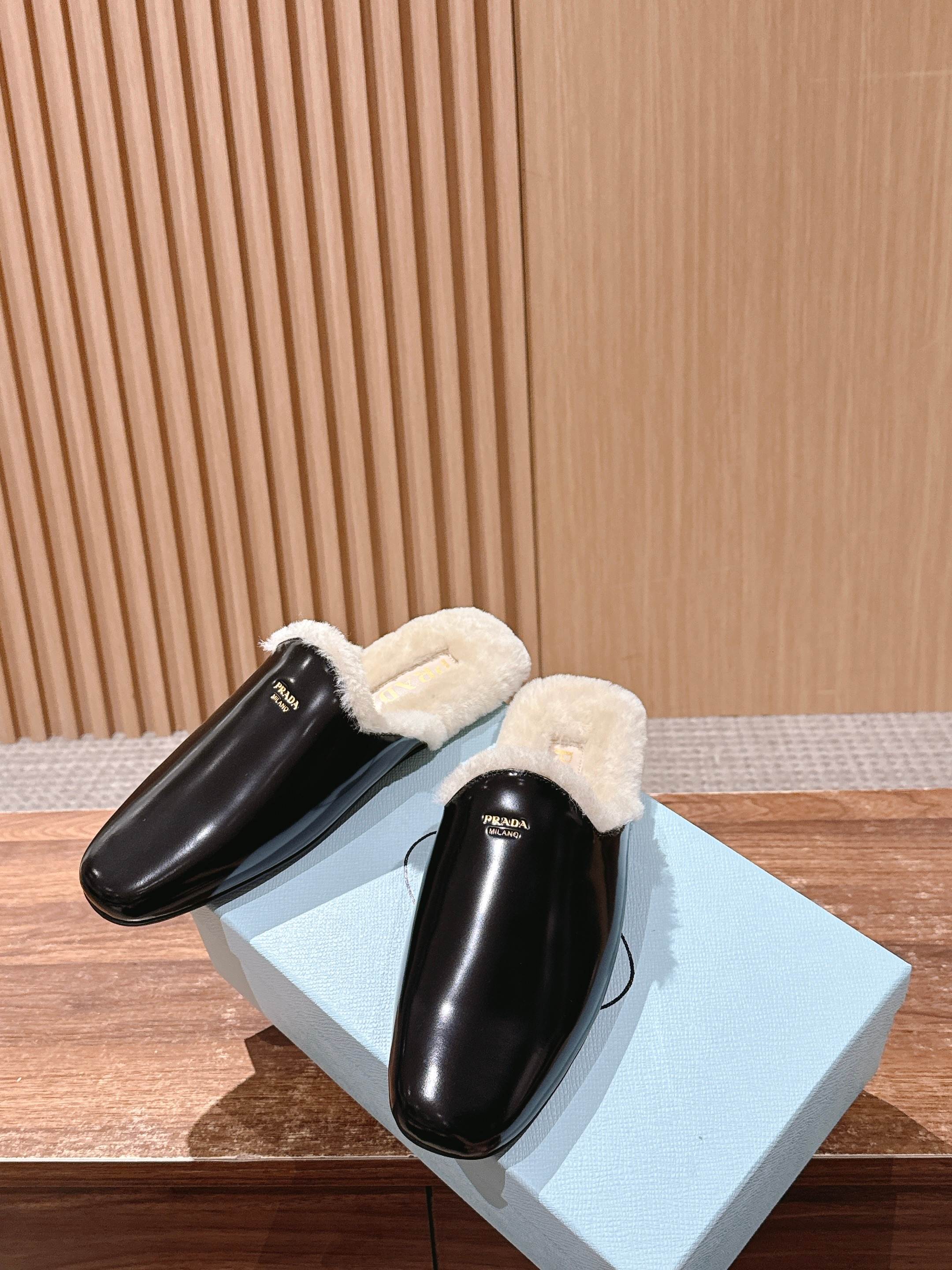PRADA 普拉达秋冬新款毛绒穆勒鞋 融合了奢华质感与舒适休闲感,鞋面采用高级皮革/麂皮材质,鞋口处的毛绒设计既增添了温暖的视觉效果,又提升了穿着的舒适体验,鞋身的PRADA品牌标识彰显品牌格调,整体呈现出复古又时尚的轻奢风格。 作为穆勒鞋,穿着方便易穿脱;毛绒材质在秋冬季节能提供一定的保暖性,适合室内外短时间穿着,兼具美观与实用性。 鞋面:开标珠牛皮/牛反绒 内里:羊毛 大底:橡胶大底 Size:35-39(40/41定制不退换)