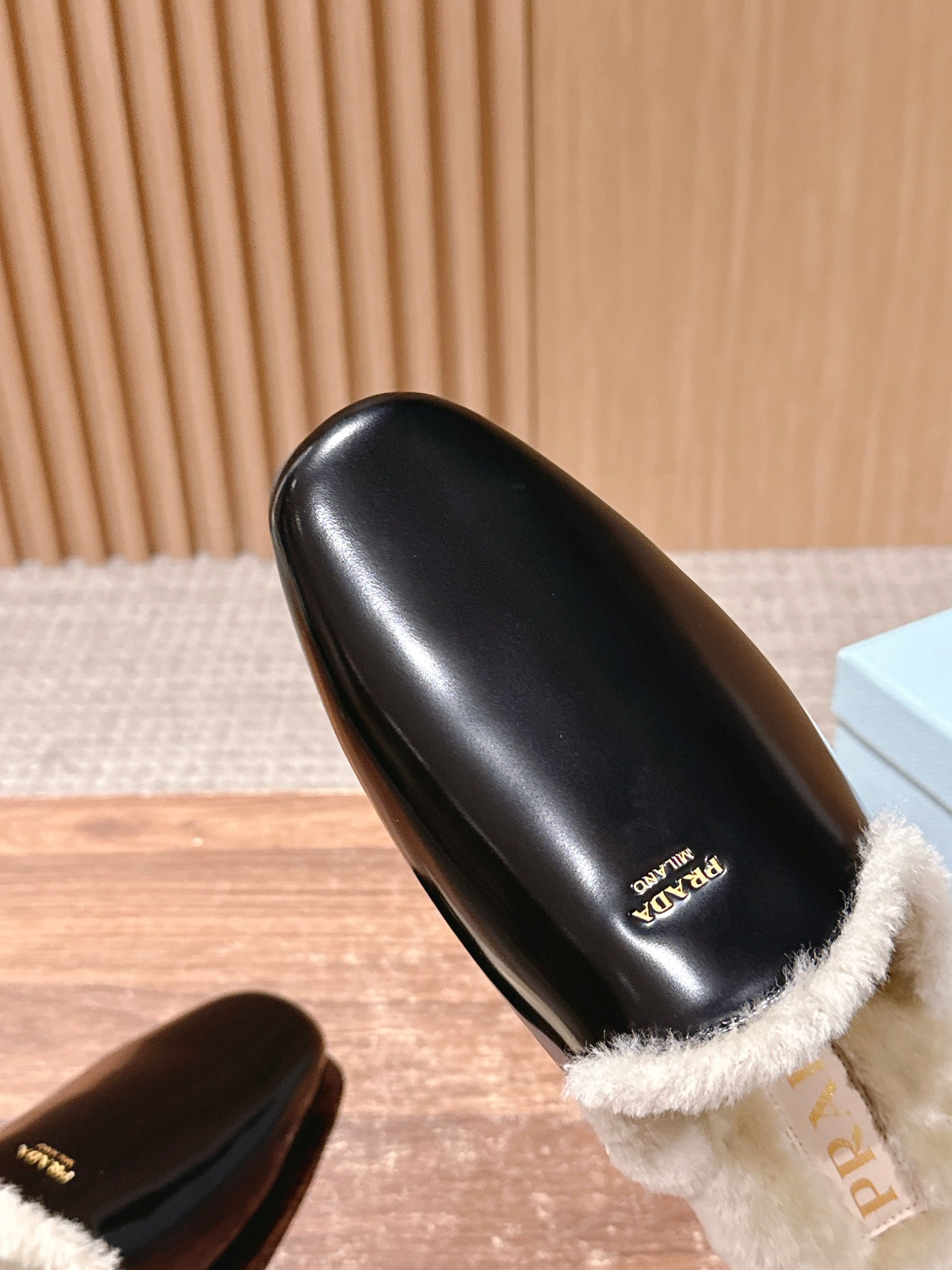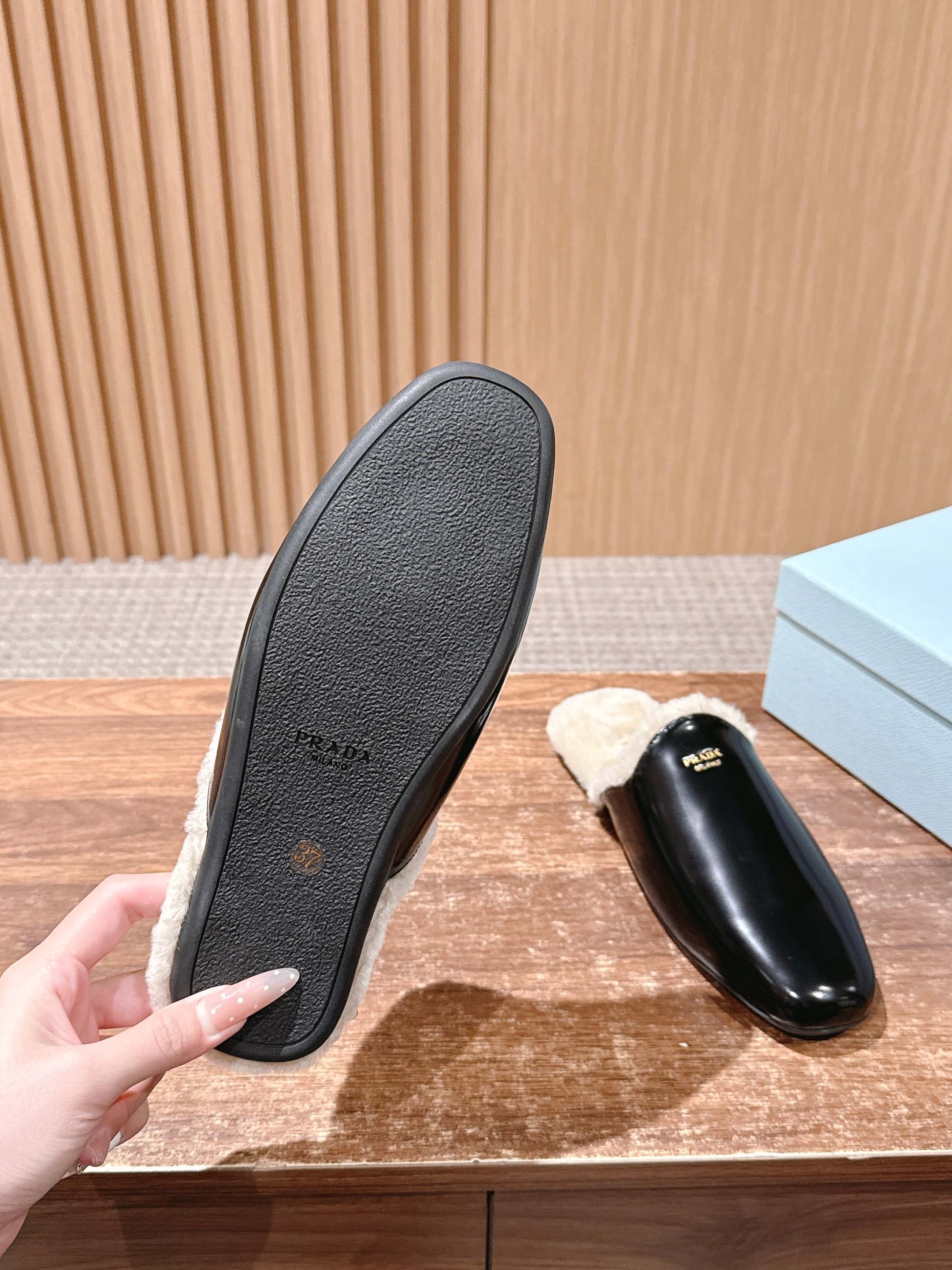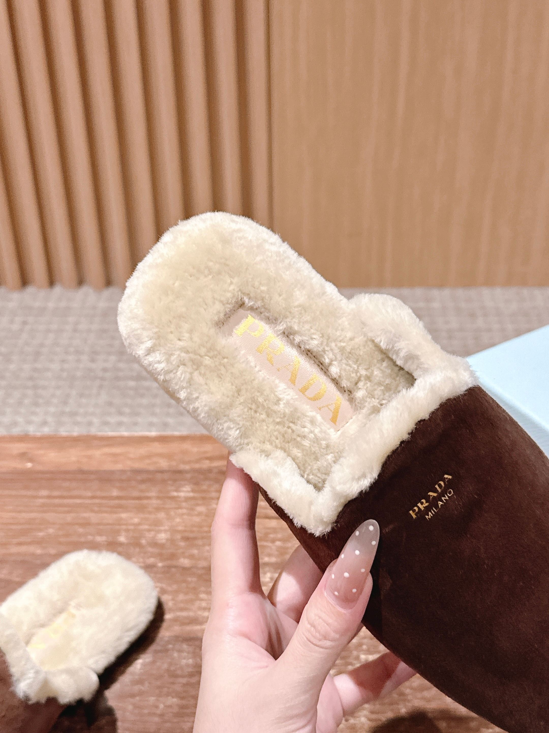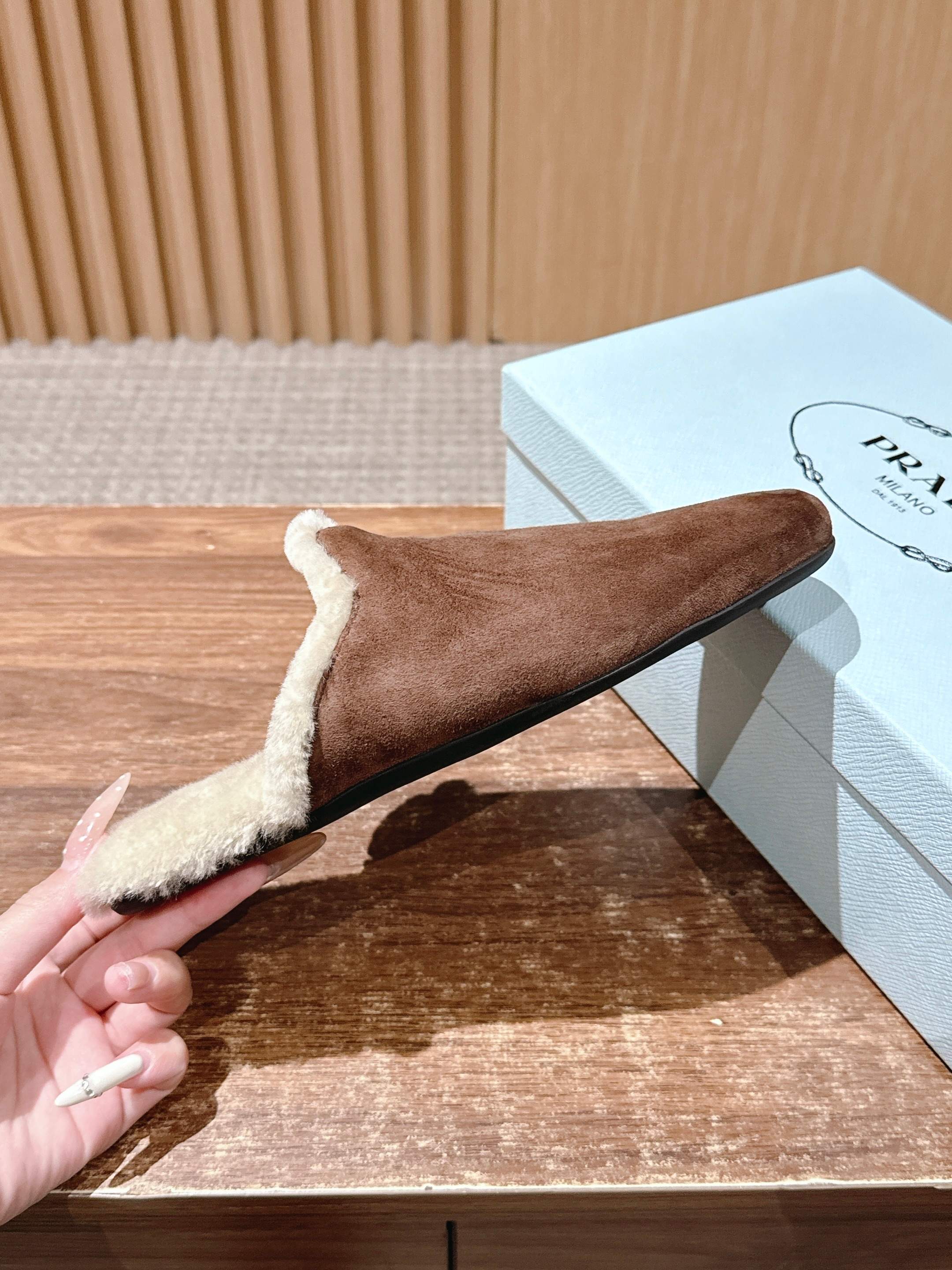 PRADA 普拉达秋冬新款毛绒穆勒鞋 融合了奢华质感与舒适休闲感,鞋面采用高级皮革/麂皮材质,鞋口处的毛绒设计既增添了温暖的视觉效果,又提升了穿着的舒适体验,鞋身的PRADA品牌标识彰显品牌格调,整体呈现出复古又时尚的轻奢风格。 作为穆勒鞋,穿着方便易穿脱;毛绒材质在秋冬季节能提供一定的保暖性,适合室内外短时间穿着,兼具美观与实用性。 鞋面:开标珠牛皮/牛反绒 内里:羊毛 大底:橡胶大底 Size:35-39(40/41定制不退换)