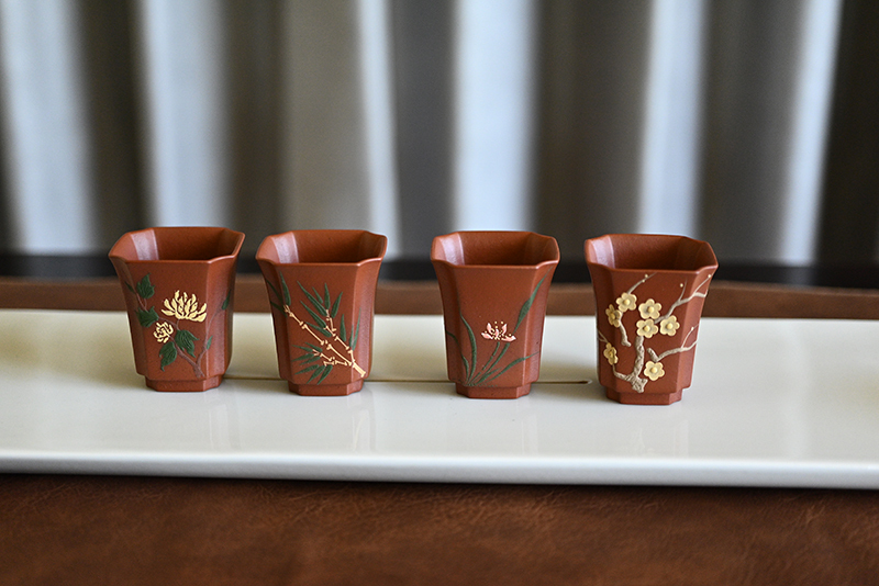 杯身的“梅、兰、竹、菊”彩绘,每只杯子都是一幅画。