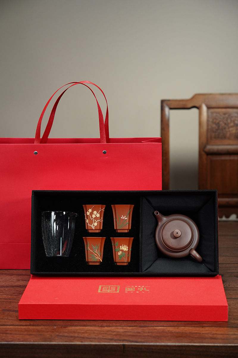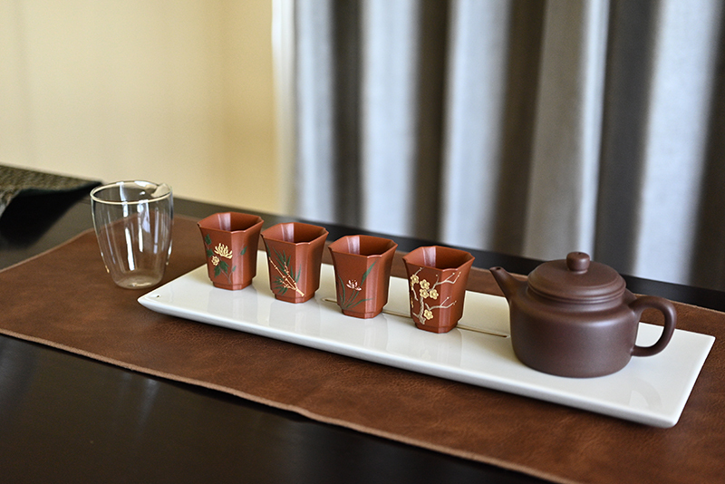 紫泥的德钟壶搭配四只朱泥品茗杯
