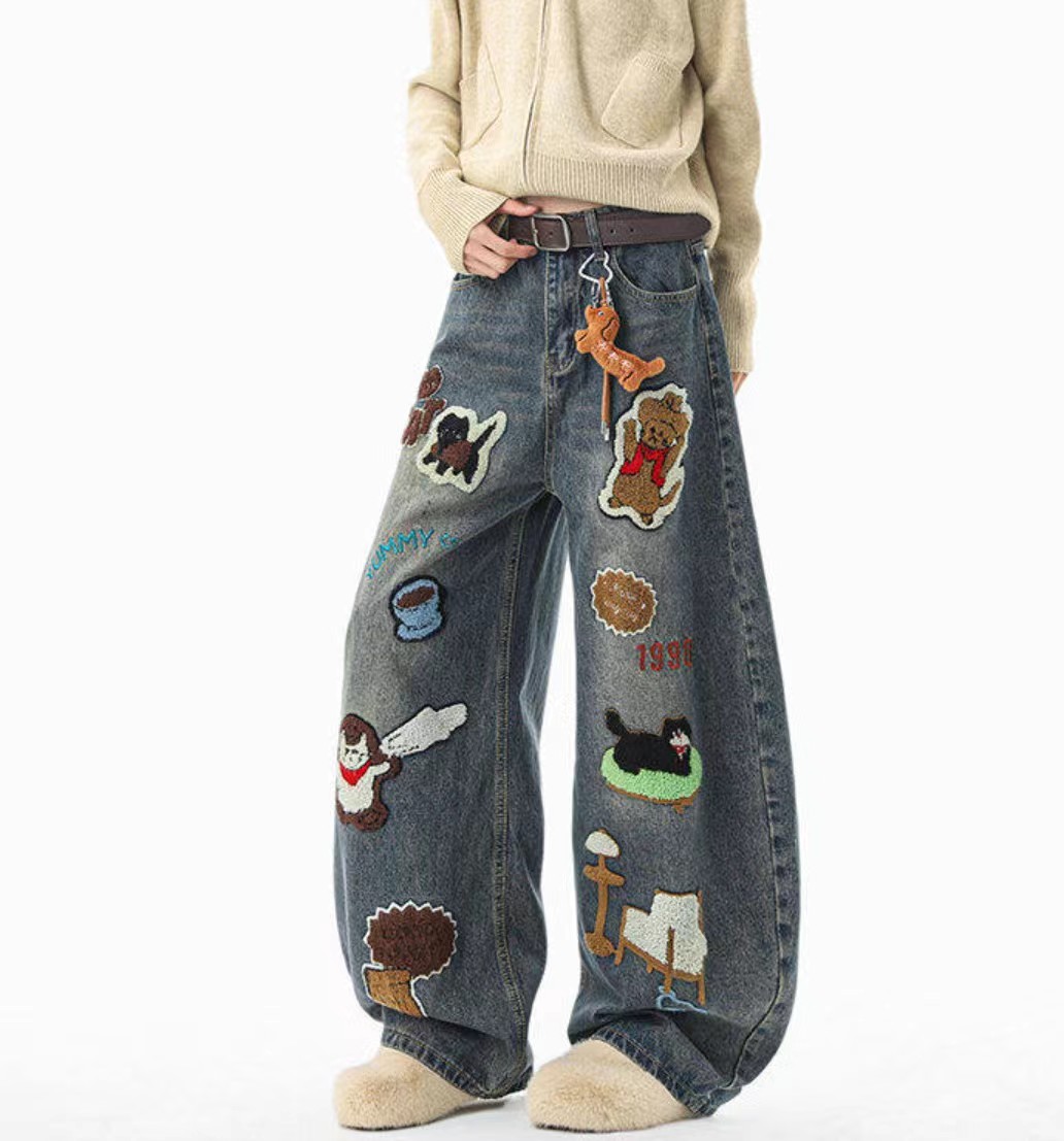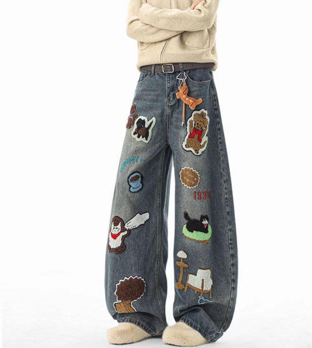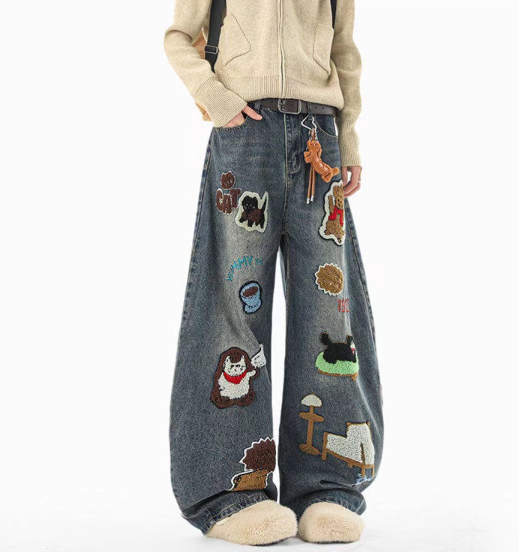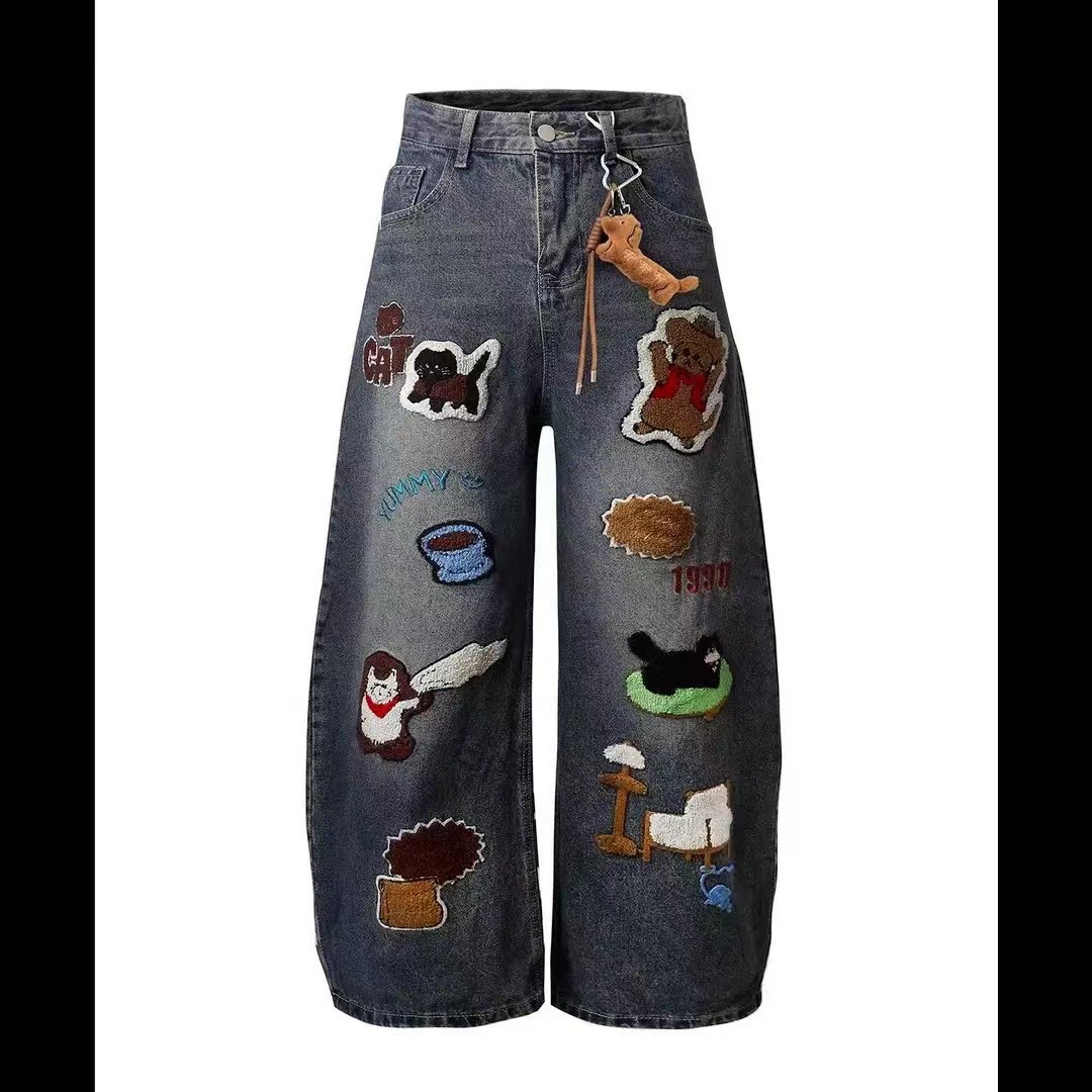F040518春秋季新款情侣款高街vibe风刺绣拼接做旧风水洗牛仔裤长裤