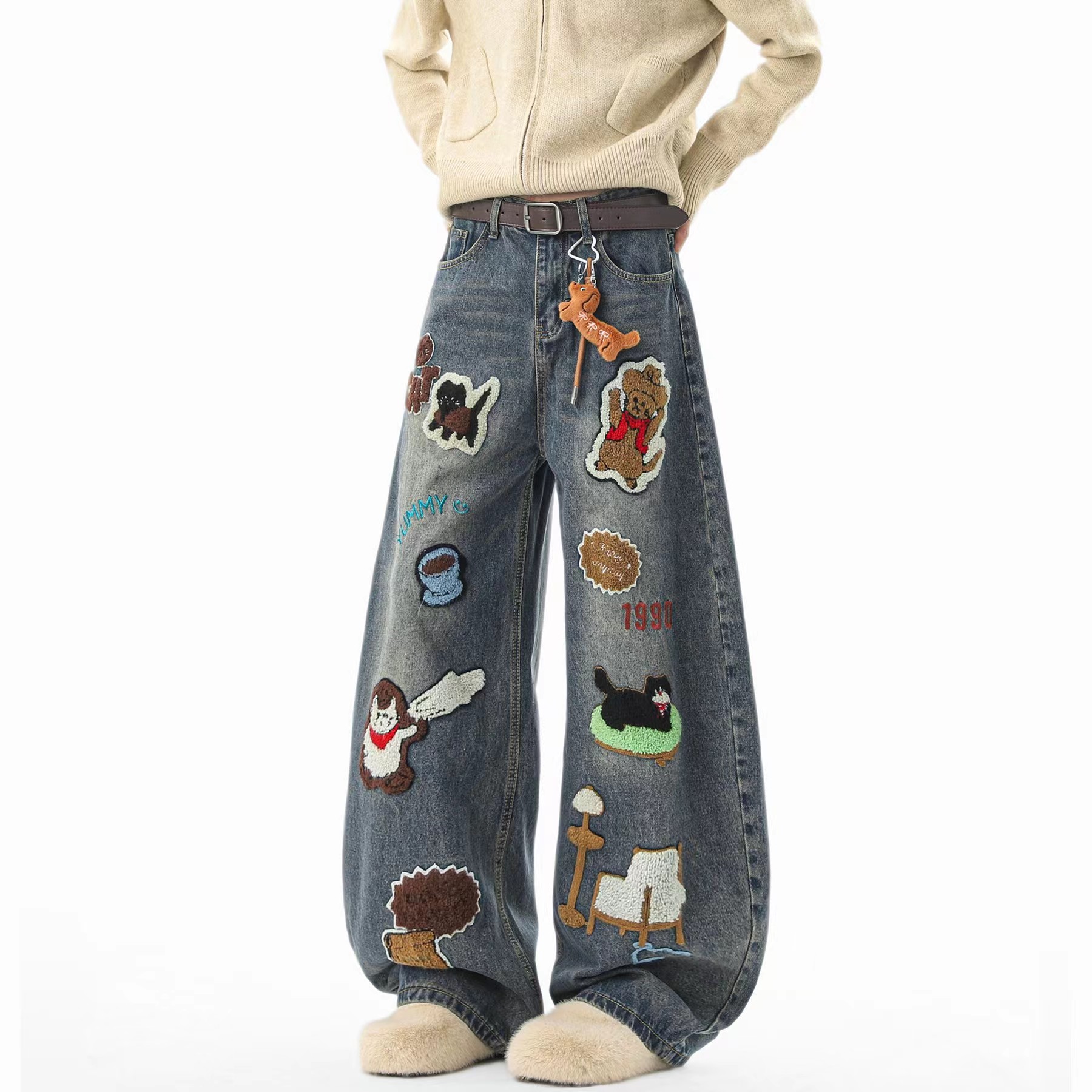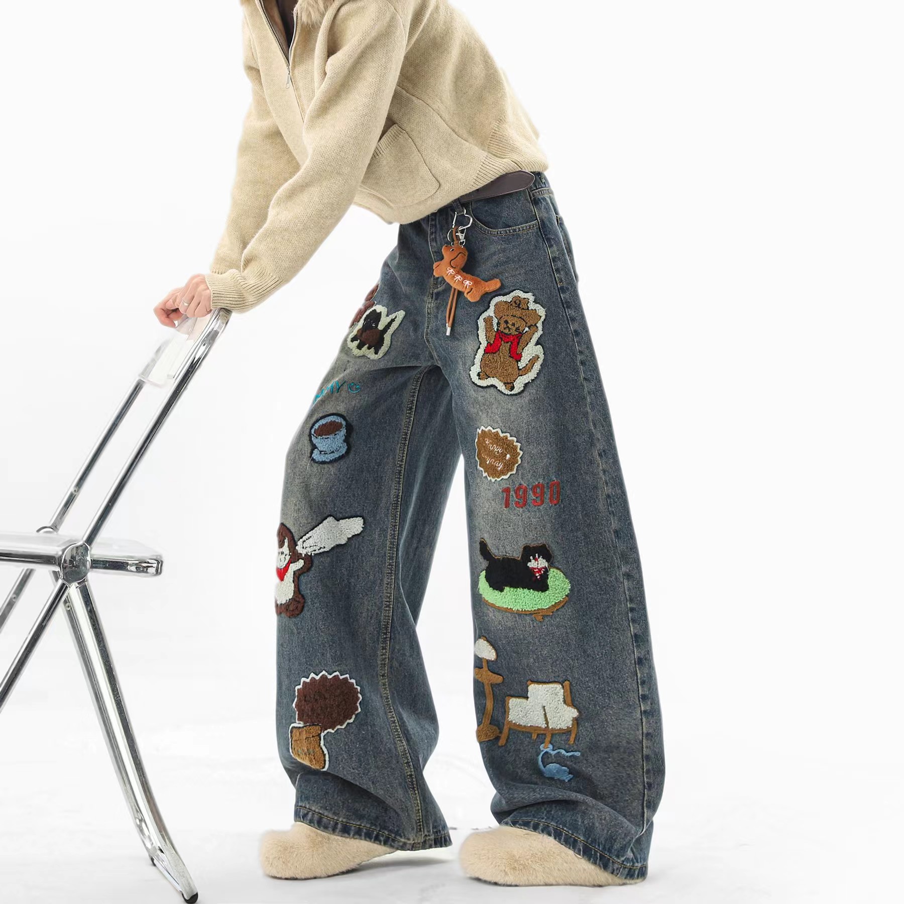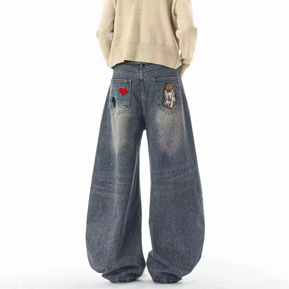 F040518春秋季新款情侣款高街vibe风刺绣拼接做旧风水洗牛仔裤长裤