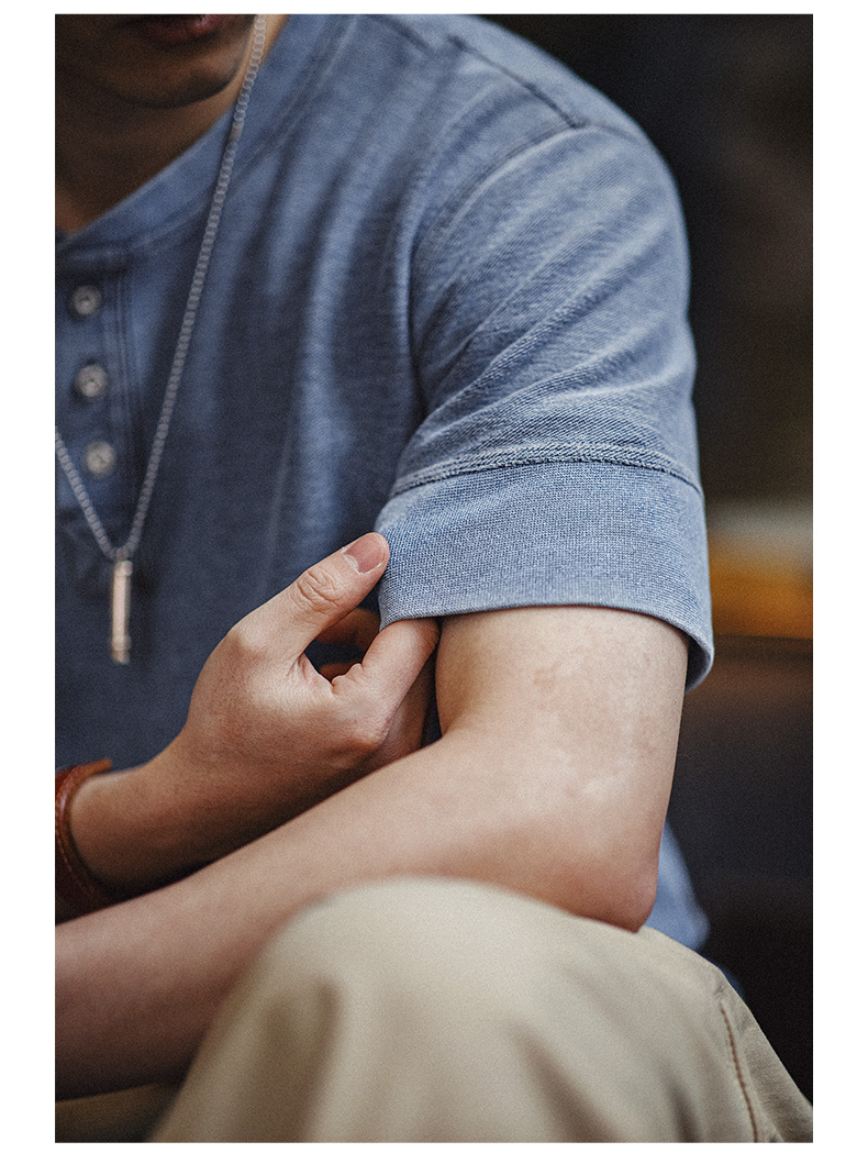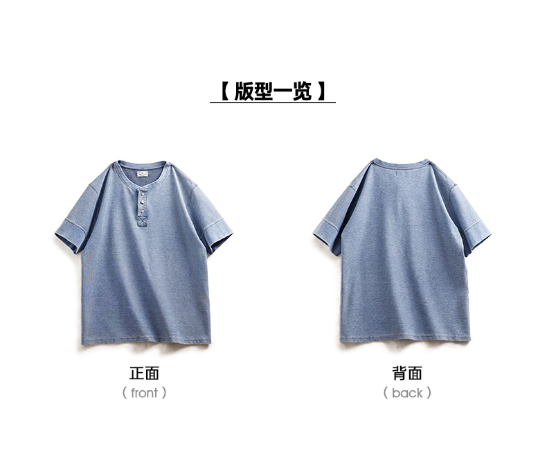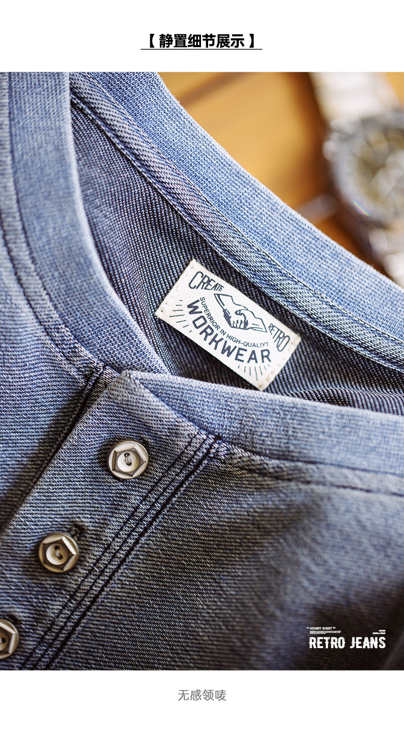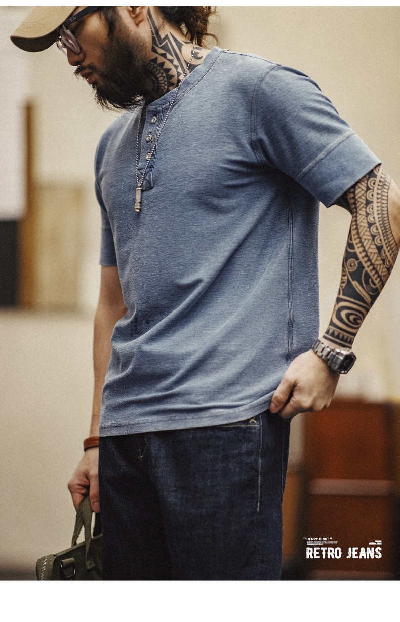 【马登】美式复古OG针织牛仔亨利衫阿美咔叽做旧硬汉短袖T恤男夏