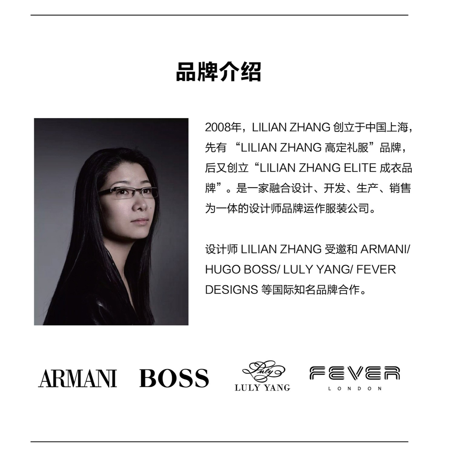 - LILIAN ZHANG ,创立于2008年,为 ARMANI 等国际品牌设计创作时装。 LILIAN ZHANG 坚持原创设计、坚持立体剪裁、坚持颠覆奢侈品价格、坚持简约经典 ,深受时尚女性喜爱。