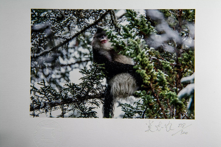 此作品是60名家作品中的其中之一,创造于2006年,西藏芒康鸿拉雪山,一只成年雄性的滇金丝猴端坐在落满积雪的树枝上,向摄影师的方向张望。芒康是滇金丝猴分布的最北端,这种珍稀的大型猴子生活在海拔3000米-4700米的高山针叶林中,这是除人类以外灵长类动物种分布的最高的区域。它们已经适应了这里恶劣的气候和严酷的环境,即使在冰天雪地的冬天,也不下迁到低海拔地带。著名野生动物摄影师奚志农,多年来一直致力于中国野生动物的拍摄和保护,实践着用影像保护自然的信念。滇金丝猴是中国特有的濒危物种,他曾发起轰动全国的保护滇金丝猴的环保运动。