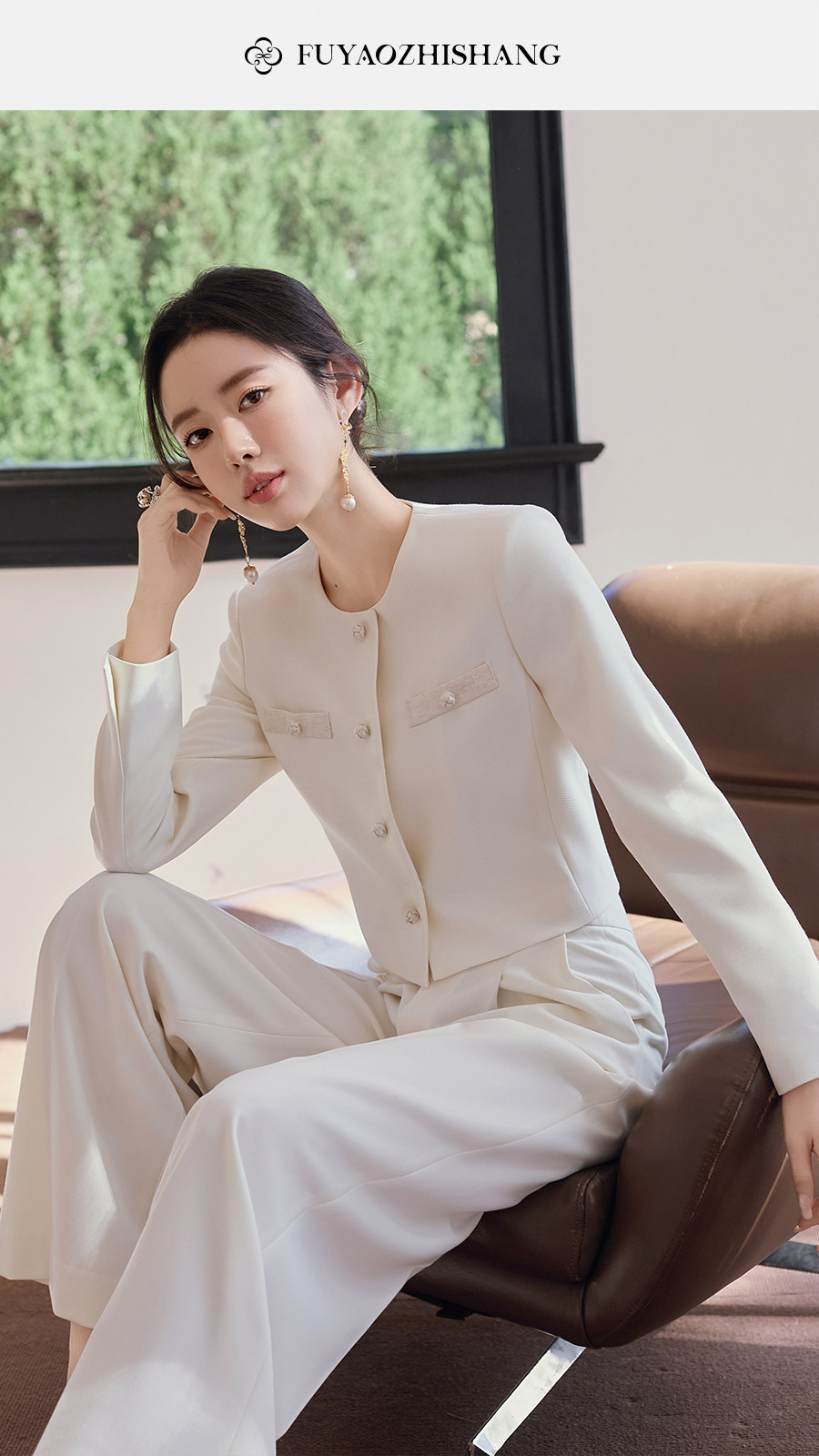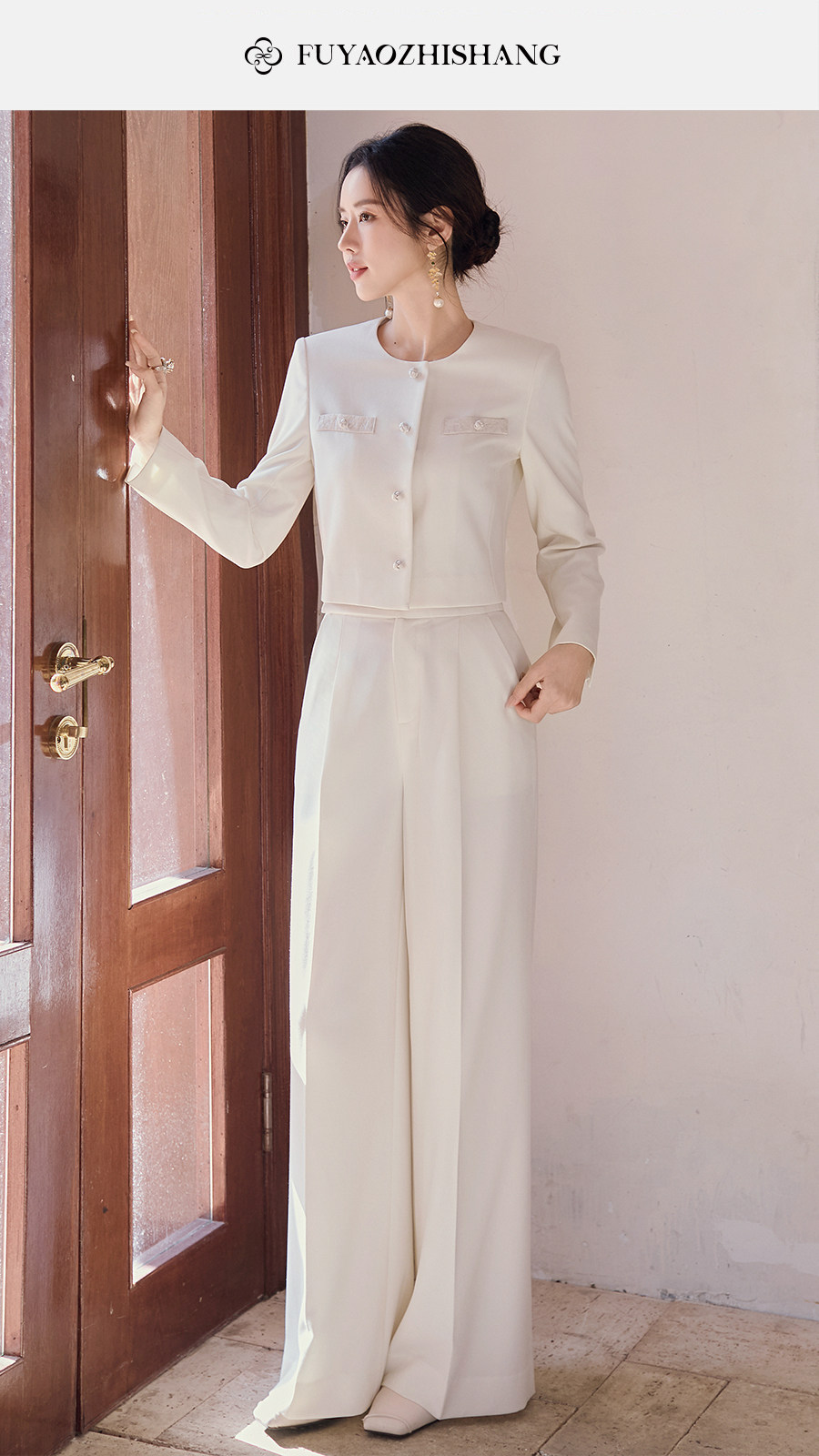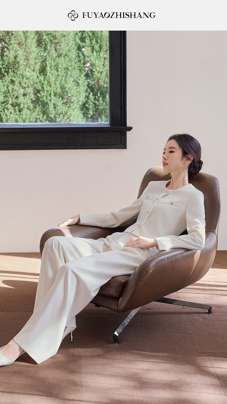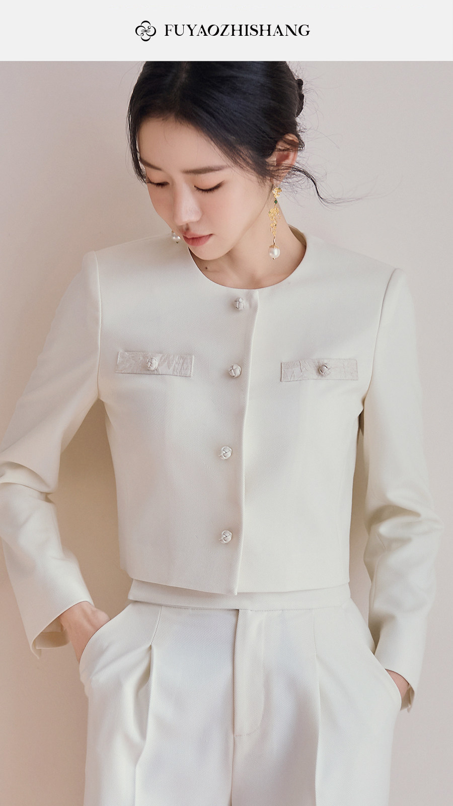 FUYAO扶摇直上 轻熟优雅风白色盘扣时尚套装女职业装两件套短外套