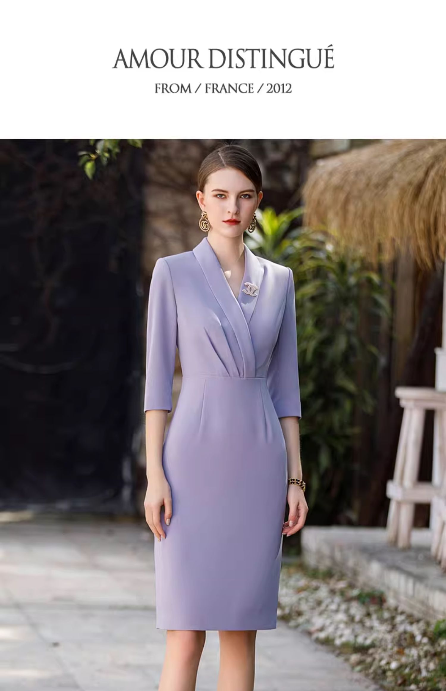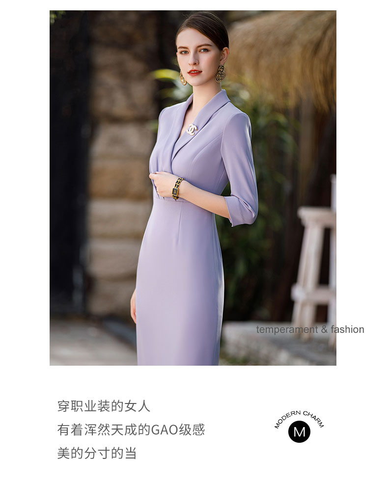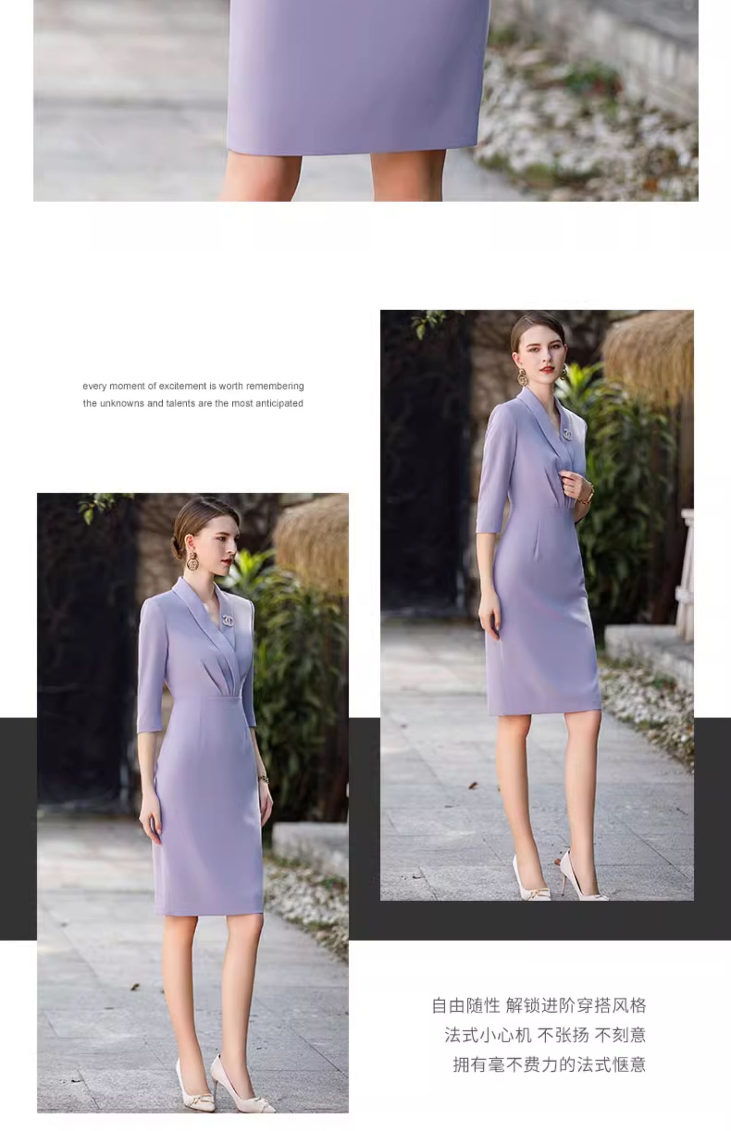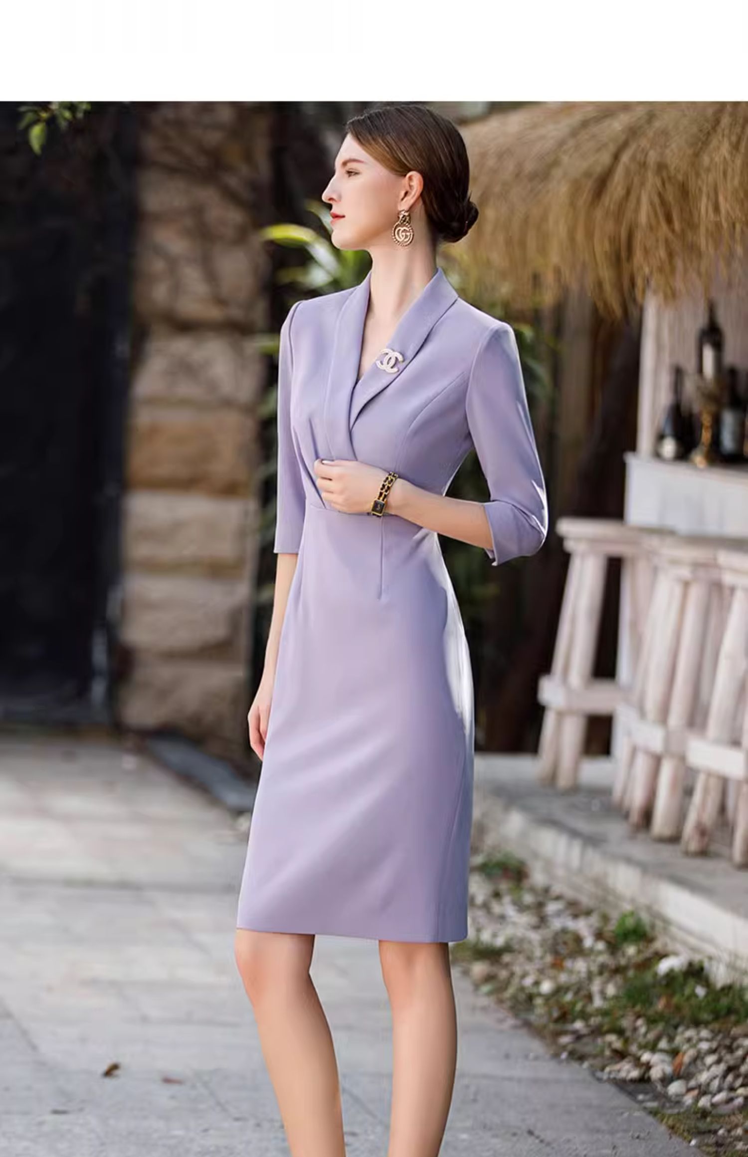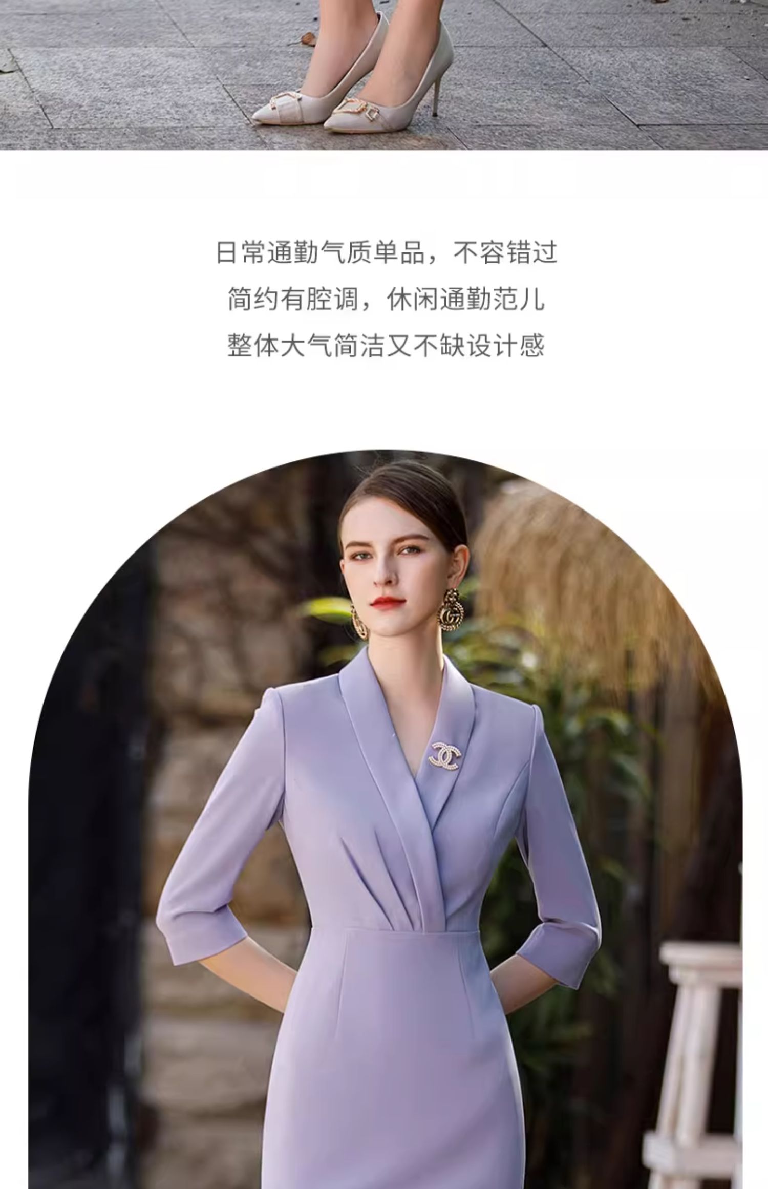 AD洋气紫色职业连衣裙女御姐范V领气质中袖西装裙子职场通勤服装送胸针