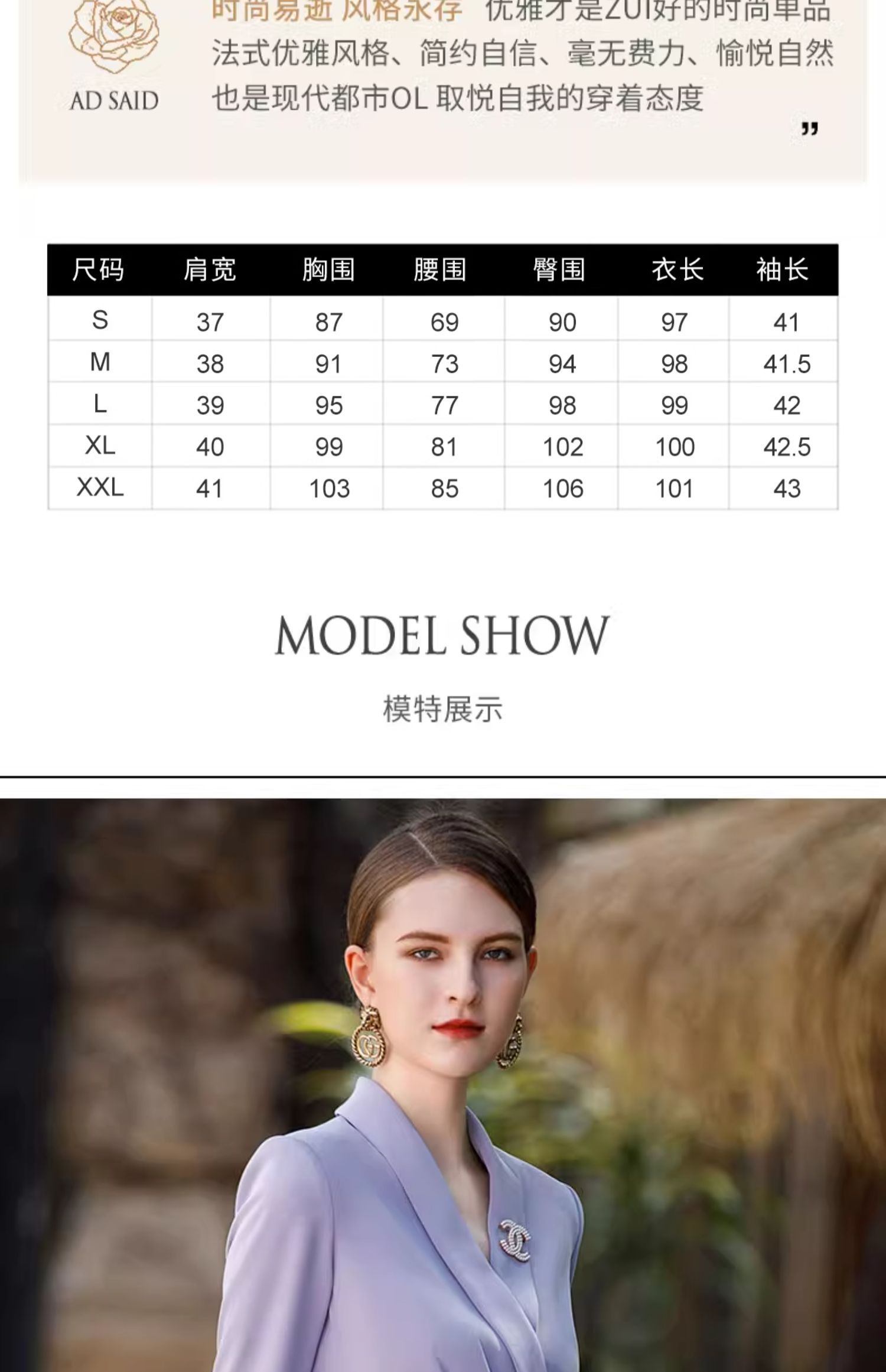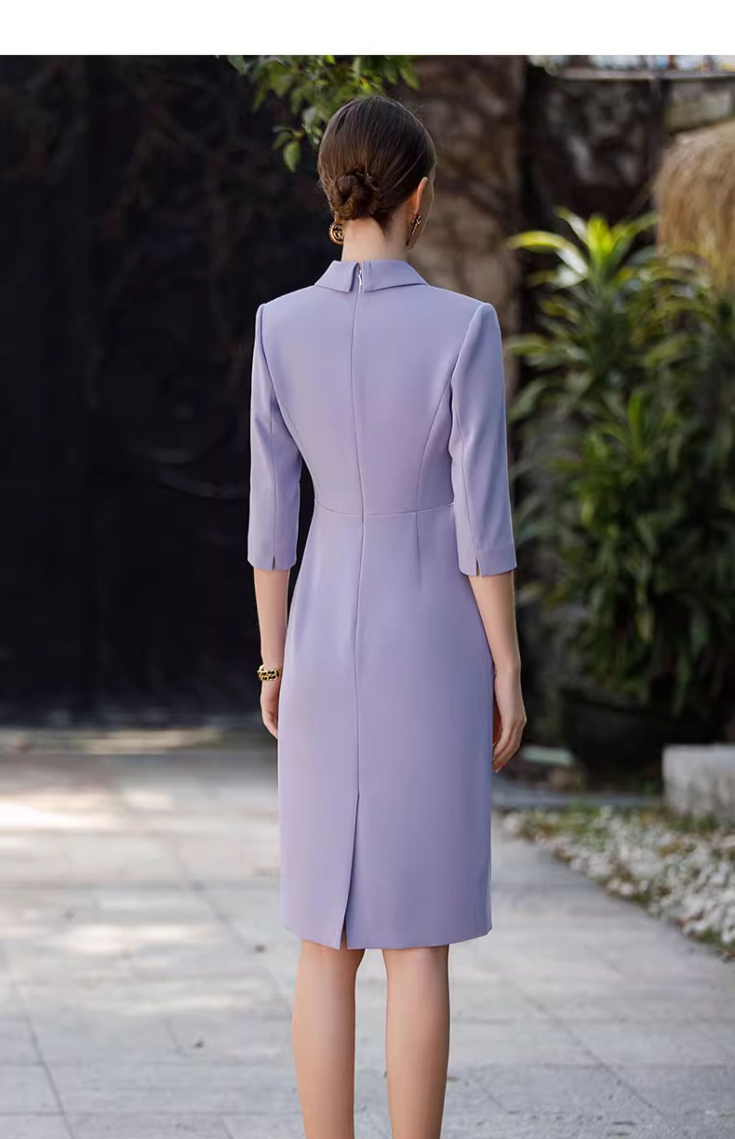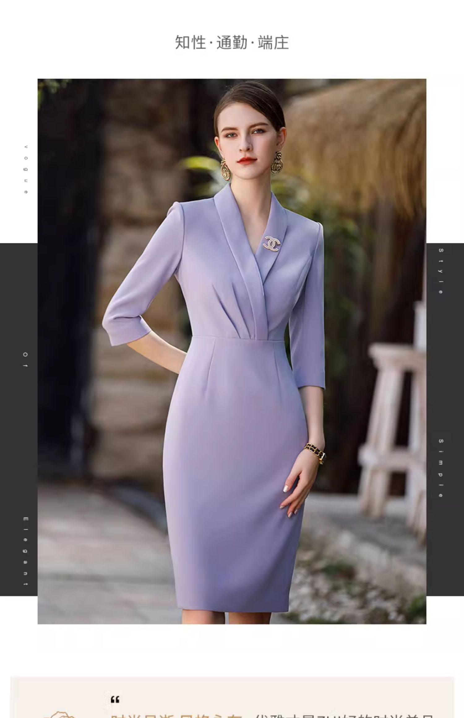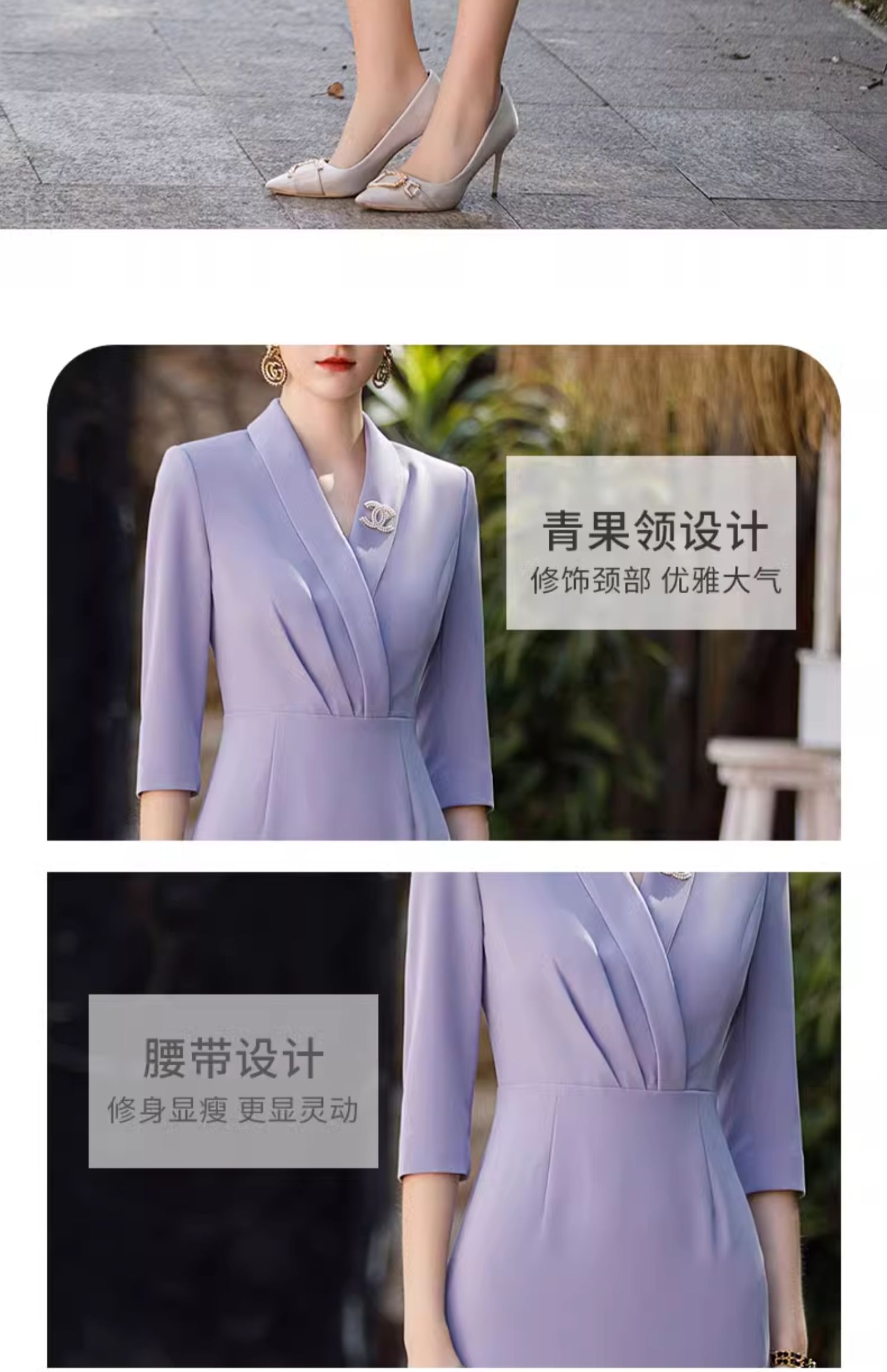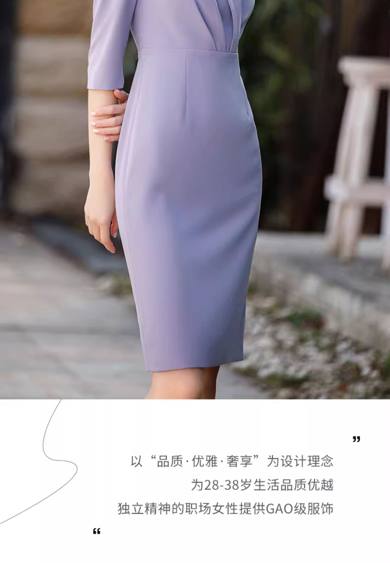 AD洋气紫色职业连衣裙女御姐范V领气质中袖西装裙子职场通勤服装送胸针