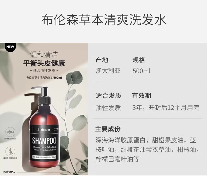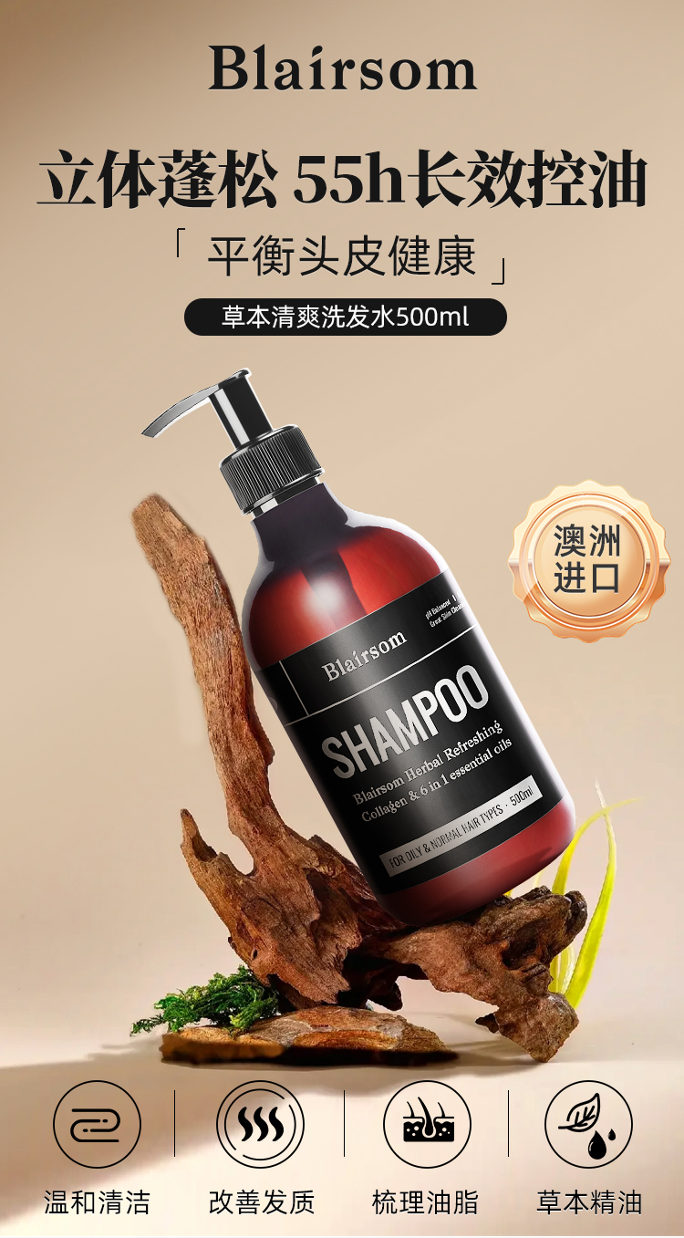 【澳洲原装进口无硅油无香精】Blairsom布伦森草本洗发水长效控油立体蓬松轻松打造高颅顶