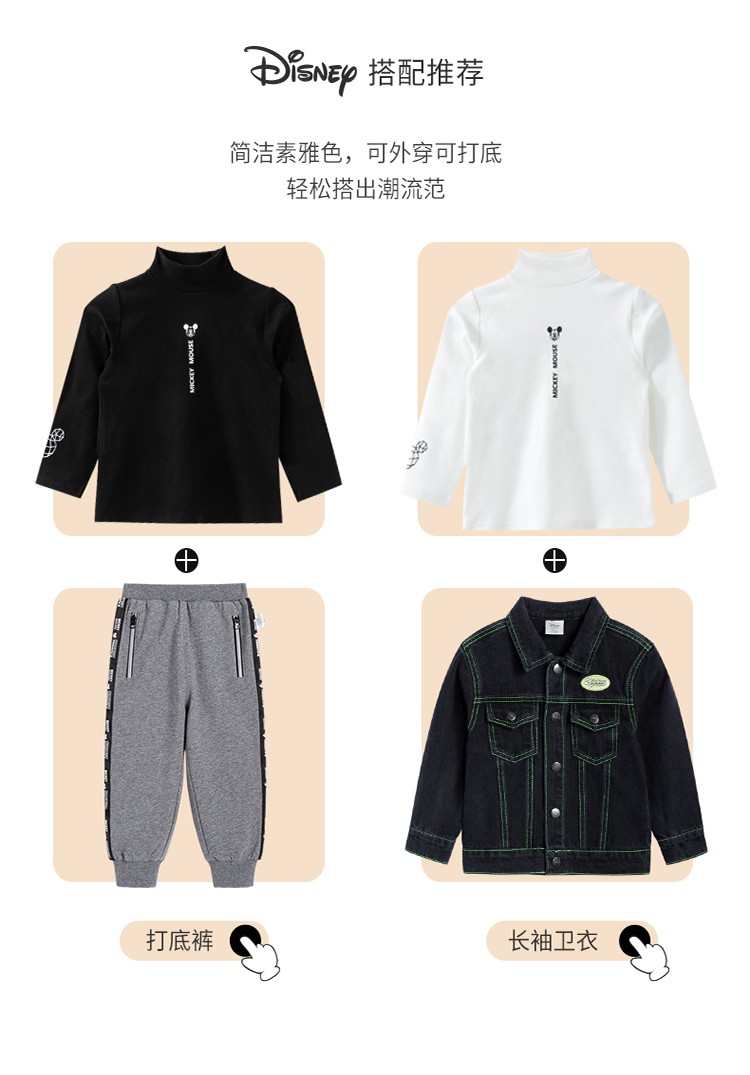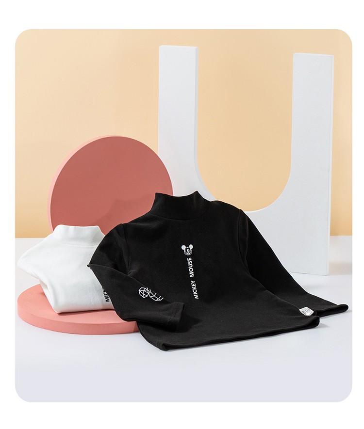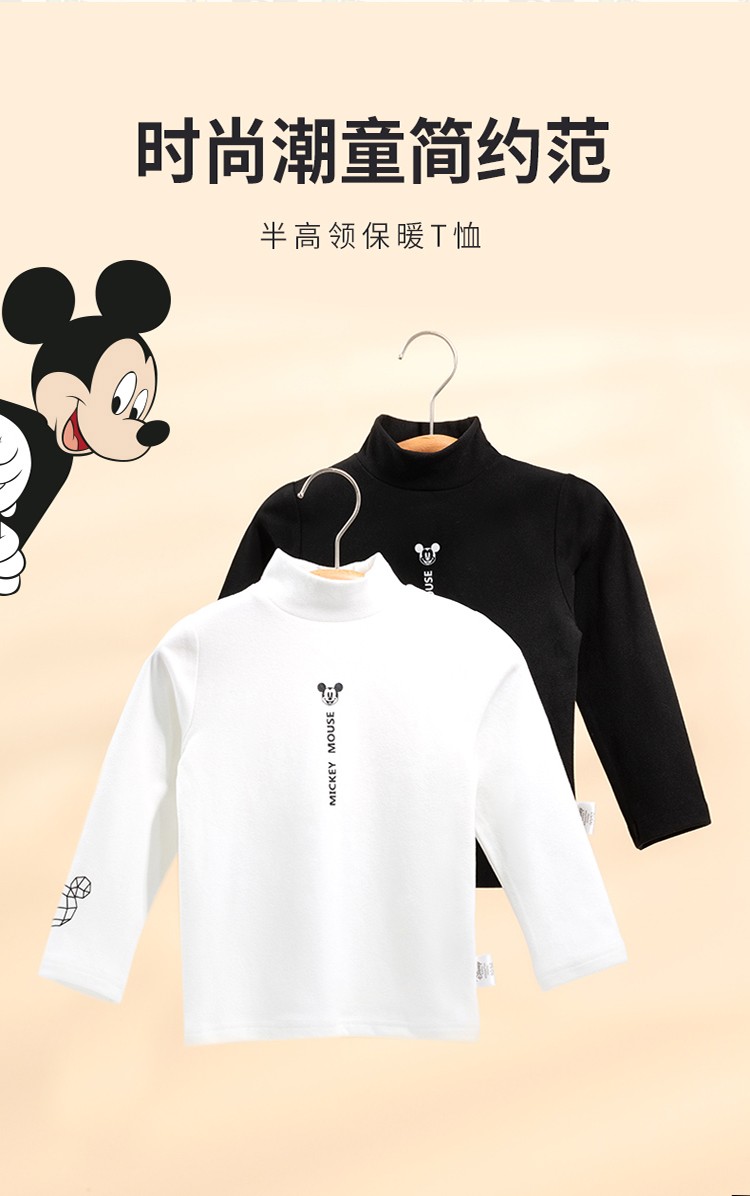 迪士尼童装儿童半高领长袖T恤男女童保暖打底衫纯色韩版卡通上衣223S1737