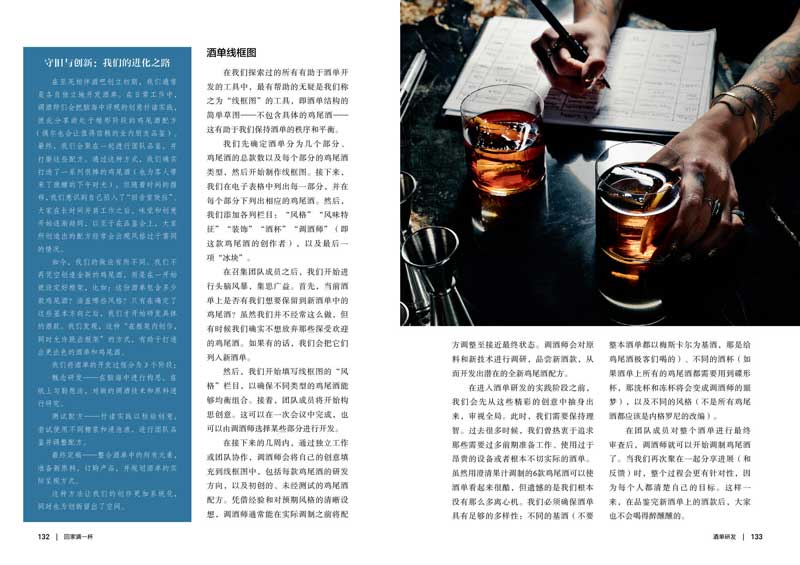 【前言】引言:。。。。。。对我们来说, 这本手册体现了我们对待餐饮服务以及其他一切事物的态度。我们成功的秘诀在于没有秘密。我们已经意识到,当你把所有时间和精力都花在保护你所创作的东西上,而不是专注于创作新的、不同的东西时,会发生什么。你之所以优秀,不在于你拥有什么,而在于开放和执行。这并不适用于每个行业,但对餐饮业来说,绝对是如此。这就是为什么多年前我们决定在第一本书中分享我们所知道的关于鸡尾酒的一切,包括我们所有的配方。我们不断学习、追求进步,并在此过程中分享我们的学习成果,这是我们的核心价值观之一。正因如此,随着我们持续探索和完善鸡尾酒理念和教学方式,我们写下了第二本书。现在,我们写了第三本书,分享了自第一本书出版以来我们学到的所有新知识。我们以前说过,但还是有必要重复一遍:鸡尾酒只不过是一张蓝图,一张列有所有原料和如何组合它们的说明书而已。同样,酒吧也只是一间有几把椅子和很多酒瓶的房间而已。但是,人可以让鸡尾酒变得鲜活起来。而一群人怀着热忱待客之心团结在一起,就能使一家酒吧鲜活起来。我们希望你能从这本书中分享的经验和配方中获得启发,让它们鲜活起来。