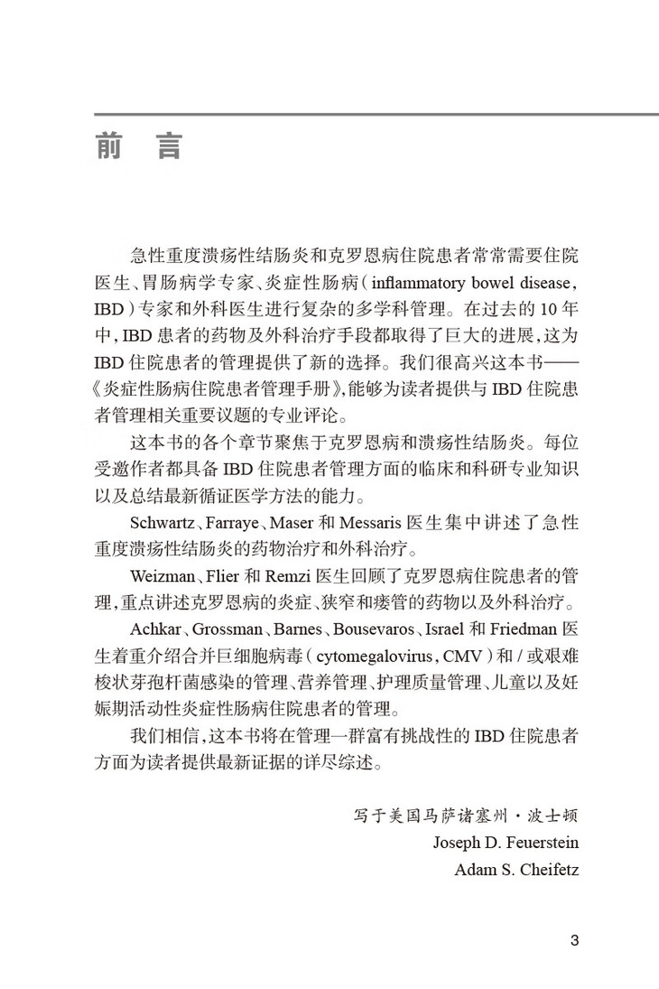 本书全面概述了炎症性肠病患者管理,特别是IBD患者住院期间的管理规范,对初诊、复发、外科手术后以及合并机会性感染等不同病程的IBD住院患者管理经验进行了总结,为我国广大IBD医师、护士和研究人员对住院IBD患者实施更好的综合管理措施有借鉴意义,有助于提升我国IBD患者住院期间的诊疗质量。1.原著介绍:Joseph D. Feuerstein,Adam S.Cheifetz,两位主编为哈佛医学院教授。 2.国际市场:本书2022年新书,亚马逊排名暂无。 3.国内需求和市场: 炎症性肠病(inflammatory bowel disease, IBD)是一类病情反复、迁延不愈的胃肠道炎症性疾病,近年来我国IBD的发病率和流行率不断上升,已成为我国消化系统疾病的热点和难点之一。IBD的临床表现复杂多样,可累及全身多系统,病程迁延且易复发,存在诊断延迟、治疗困难等难点,给患者及社会带来沉重的负担。IBD患者往往因病情反复或治疗需要多次入院,住院期间需要多学科团队协助诊疗,加强对患者的综合管理。本书通过对国外IBD患者住院期间的管理经验进行总结,有助于提升我国IBD综合诊治水平,积累多学科协作经验,对改善IBD患者预后和生活质量、减轻患者及社会负担有着重要意义。 4.国内读者定位:我国广大IBD医师、护士和研究人员。