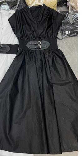 HJ2S90_漆黑色_连衣裙_夏季_V 领小飞袖双扣宽腰封收腰显瘦气质 A 字大摆长裙_高级女装_BERNIEELEN 伯妮斯茵