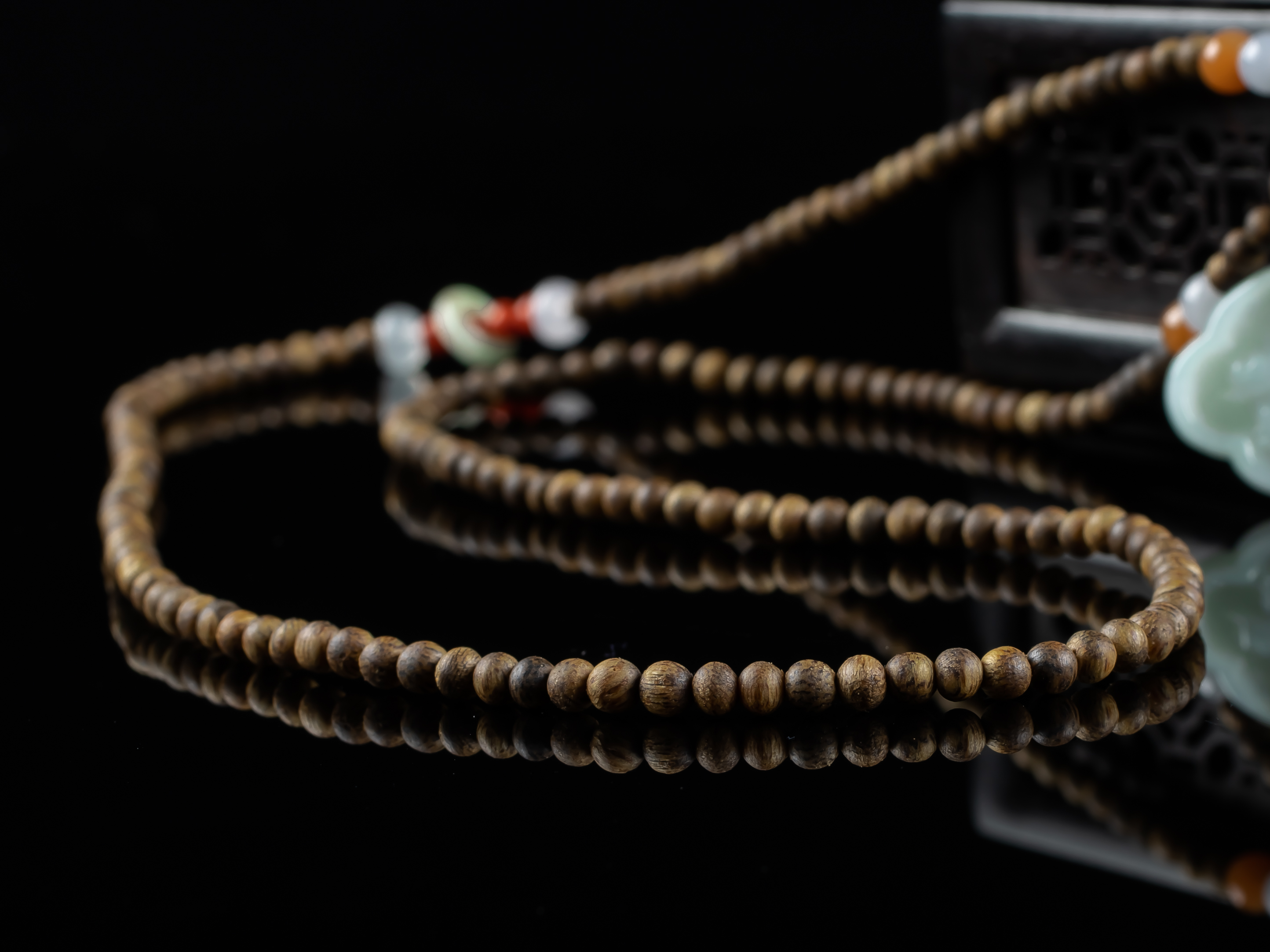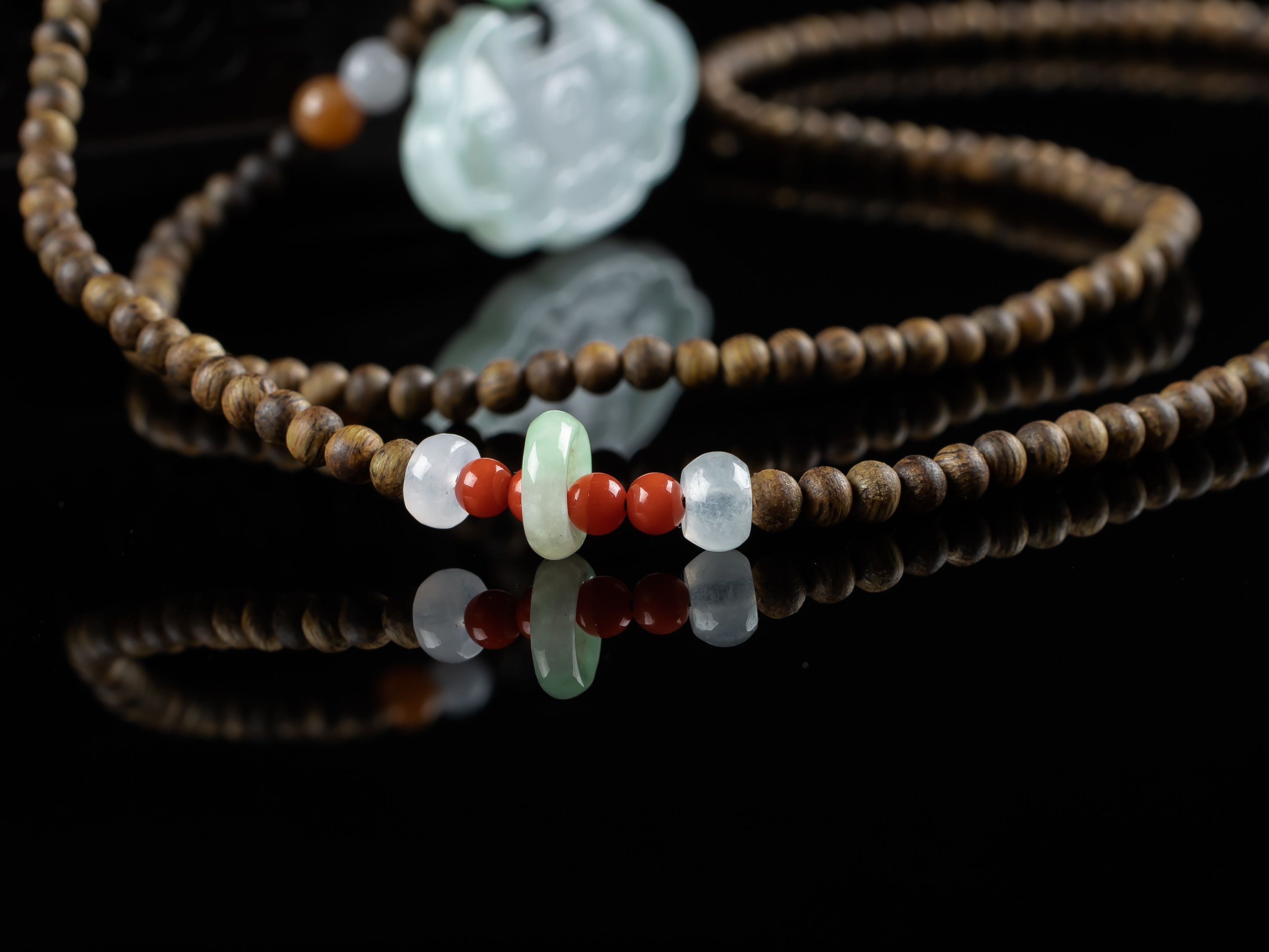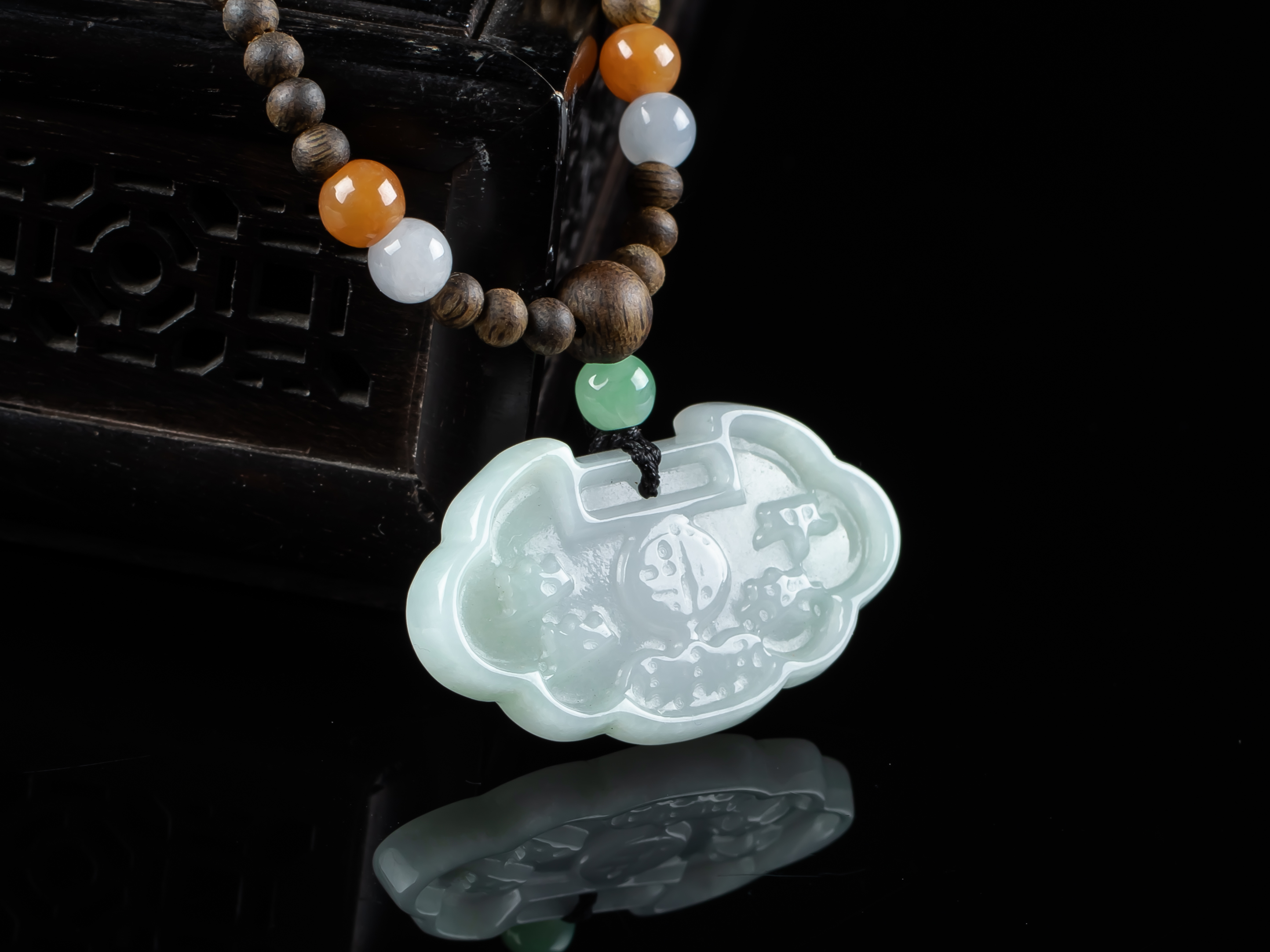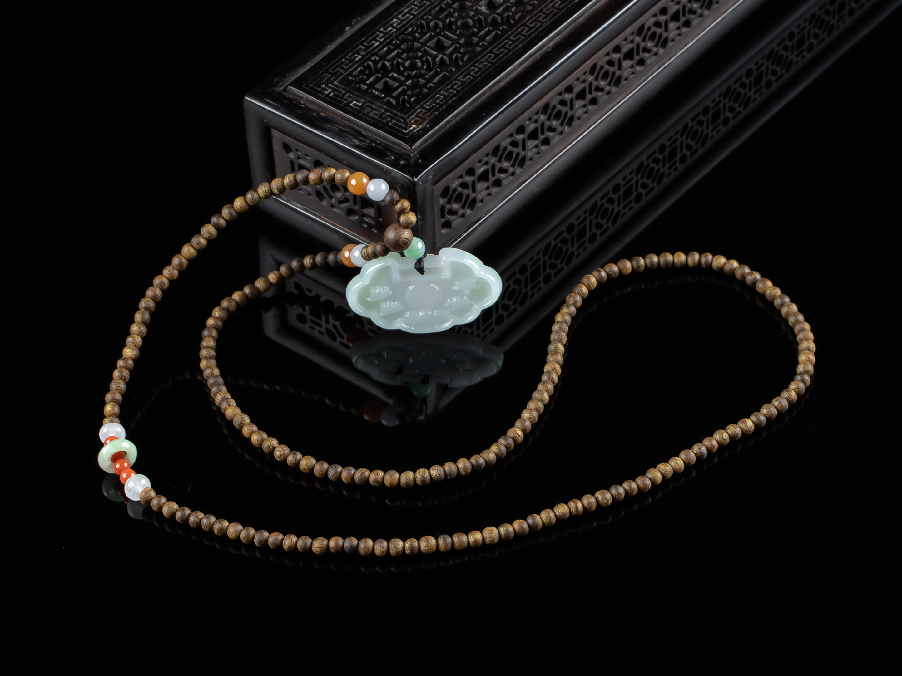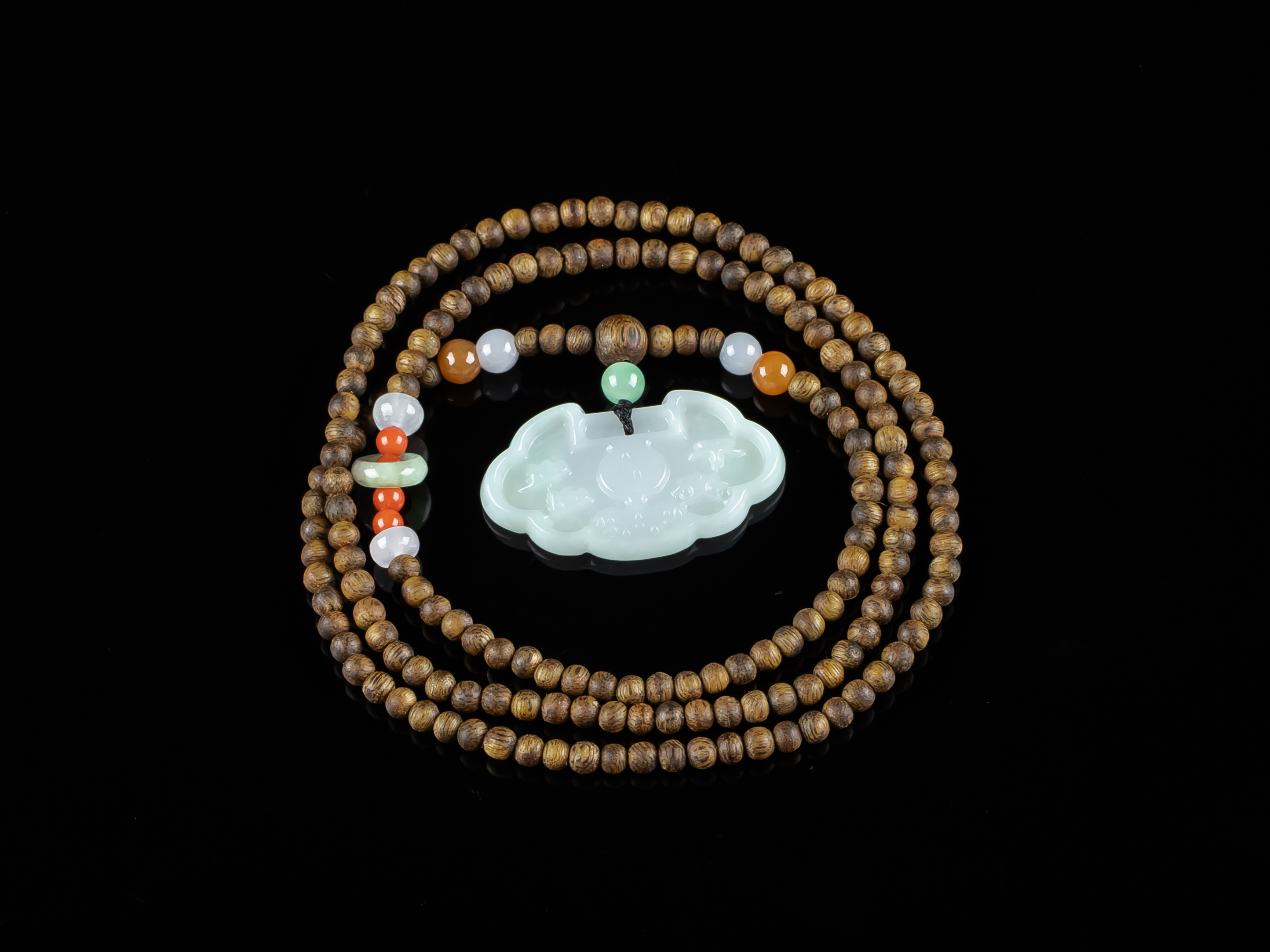 原创沉香+翡翠岁岁平安锁挂件,天然沉香圆珠3.7mm,原色原味,香味清甜自然,配珠:翡翠、南红。平安锁36.3*20.9*4mm,细糯种带底色的质地,干净完美无瑕,正面雕刻岁岁平安,背后一刀切工艺,款式精巧。
