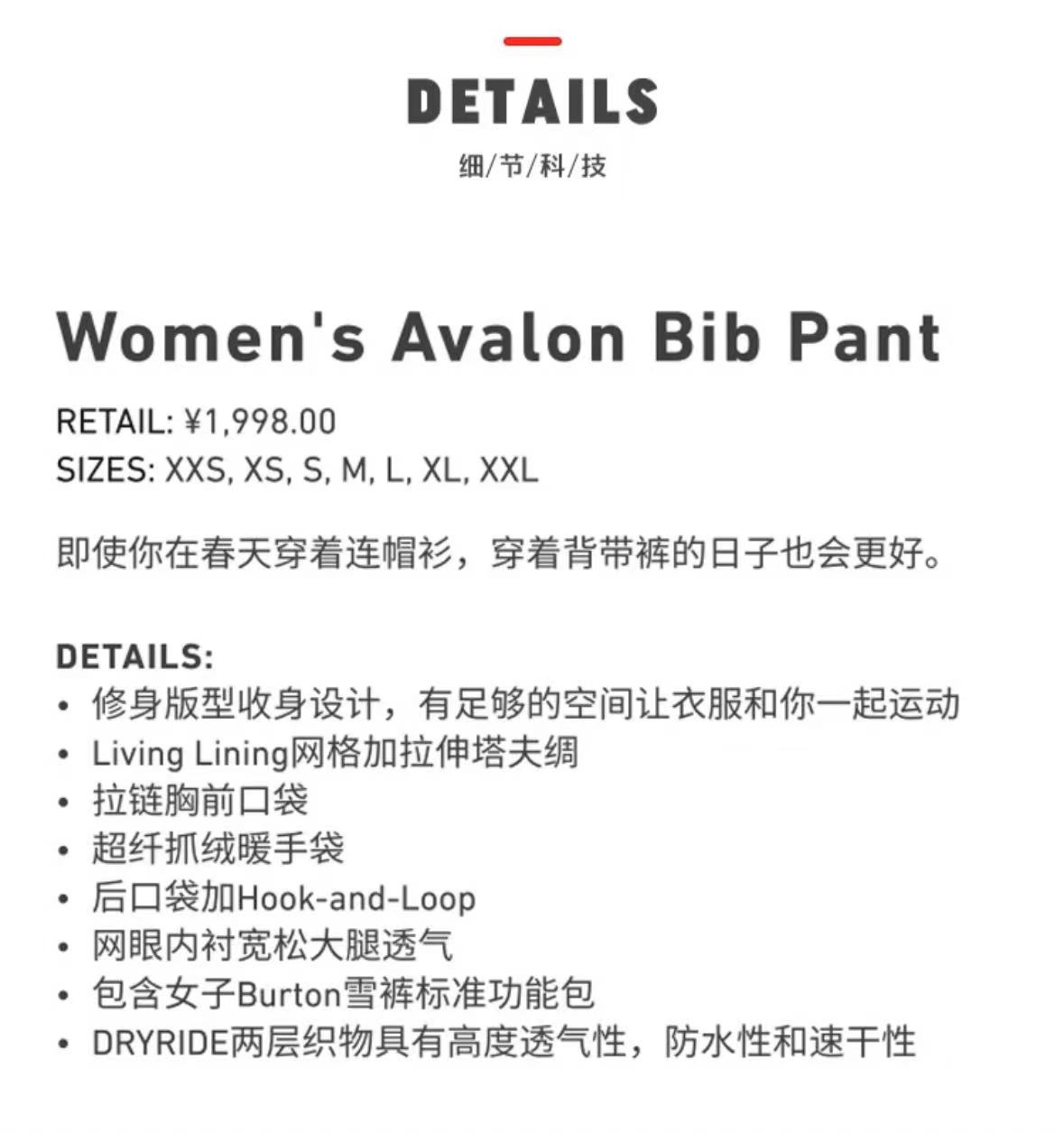 【断码六折】BURTON Avalon Bib 防水女款单板双板滑雪裤背带裤171431