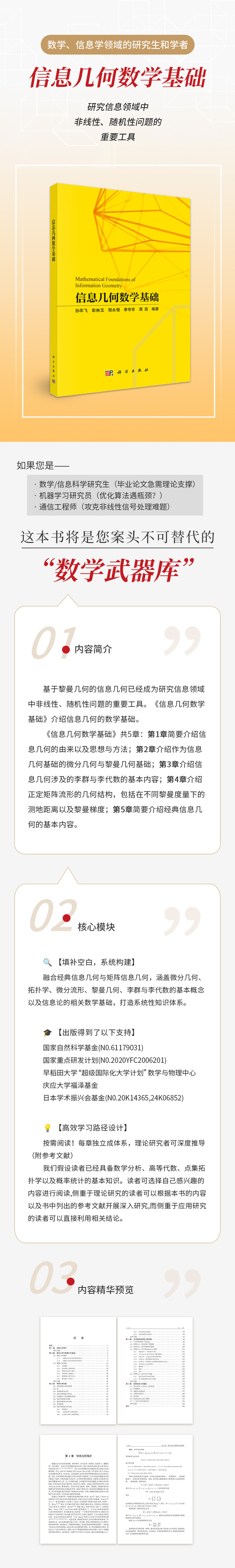 基于黎曼几何的信息几何已经成为研究信息领域中非线性、随机性问题的重要工具。本书介绍信息几何的数学基础。全书共5章:第1章简要介绍信息几何的由来以及思想与方法;第2章介绍作为信息几何基础的微分几何与黎曼几何基础;第3章介绍信息几何涉及的李群与李代数的基本内容;第4章介绍正定矩阵流形的几何结构,包括在不同黎曼度量下的测地距离以及黎曼梯度;第5章简要介绍经典信息几何的基本内容。