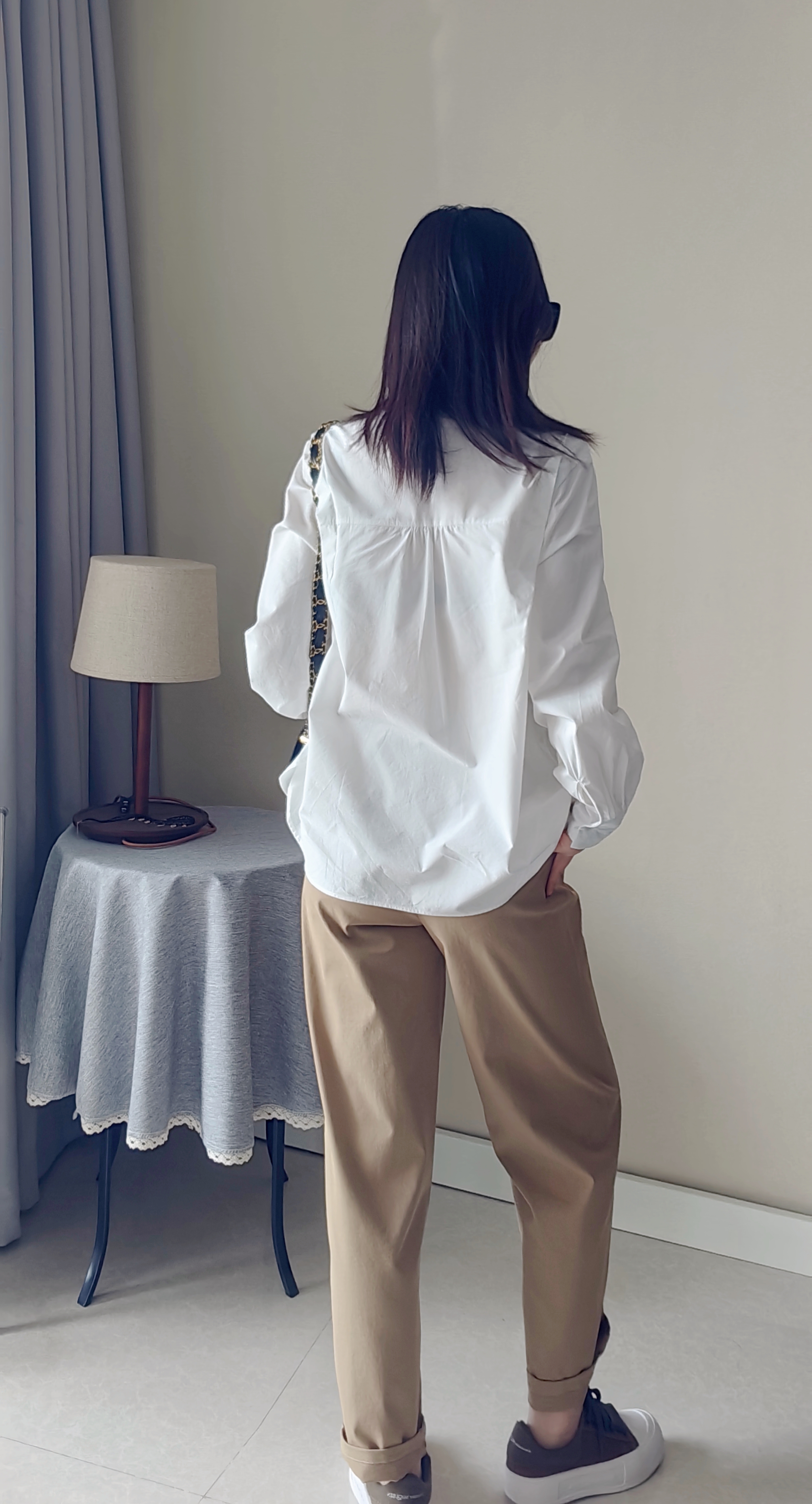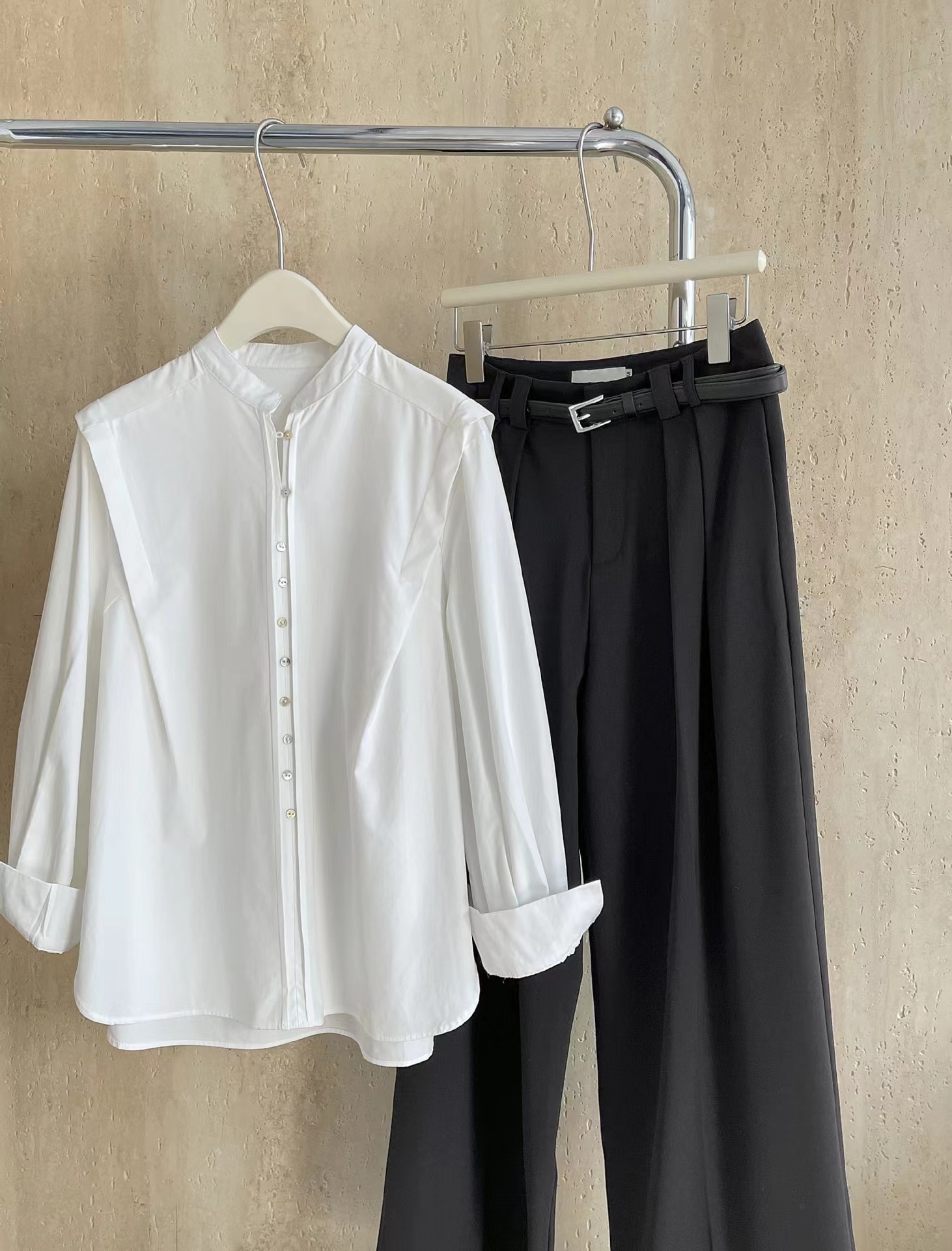 领口圆领设计,沉稳简约,凸显颈部线条,长袖袖口锁边平整,剪裁细致