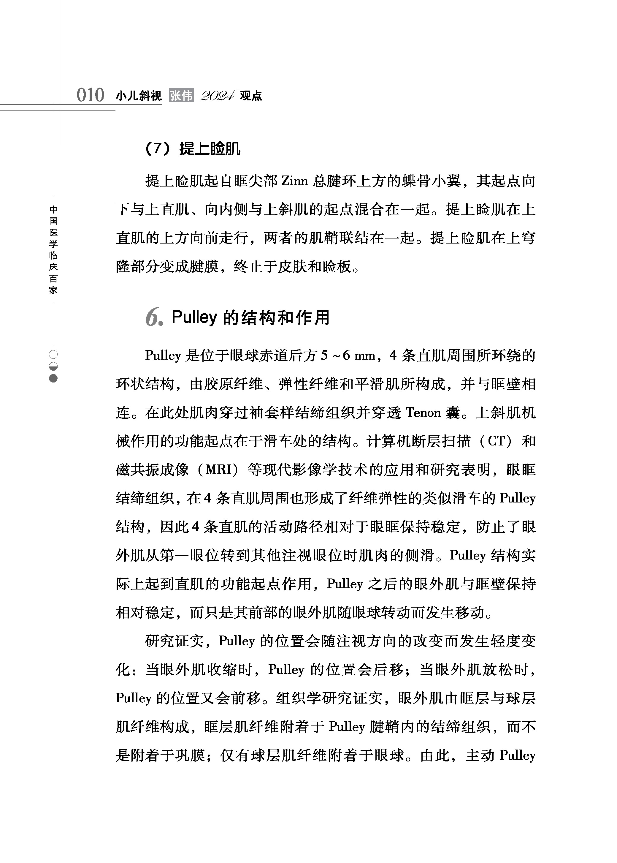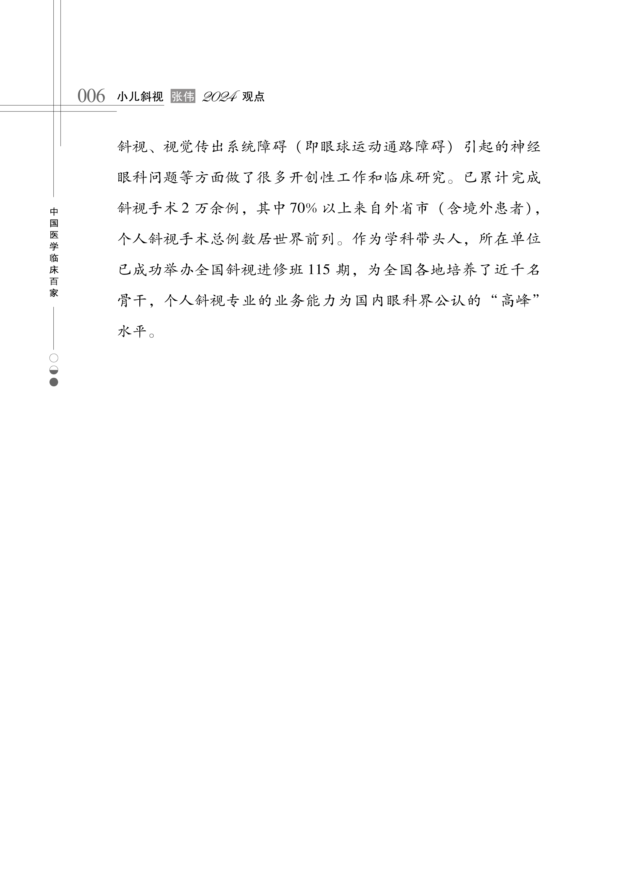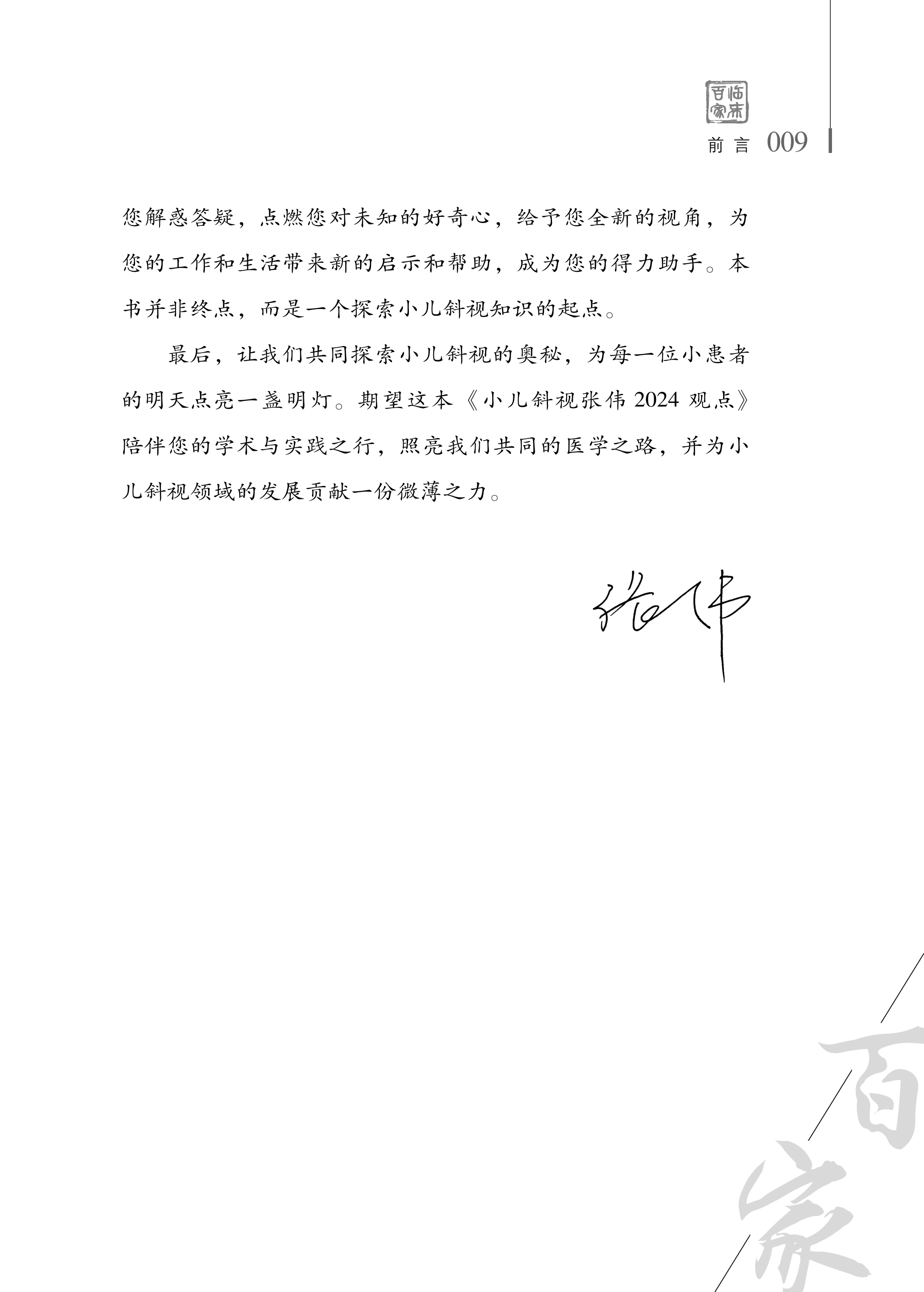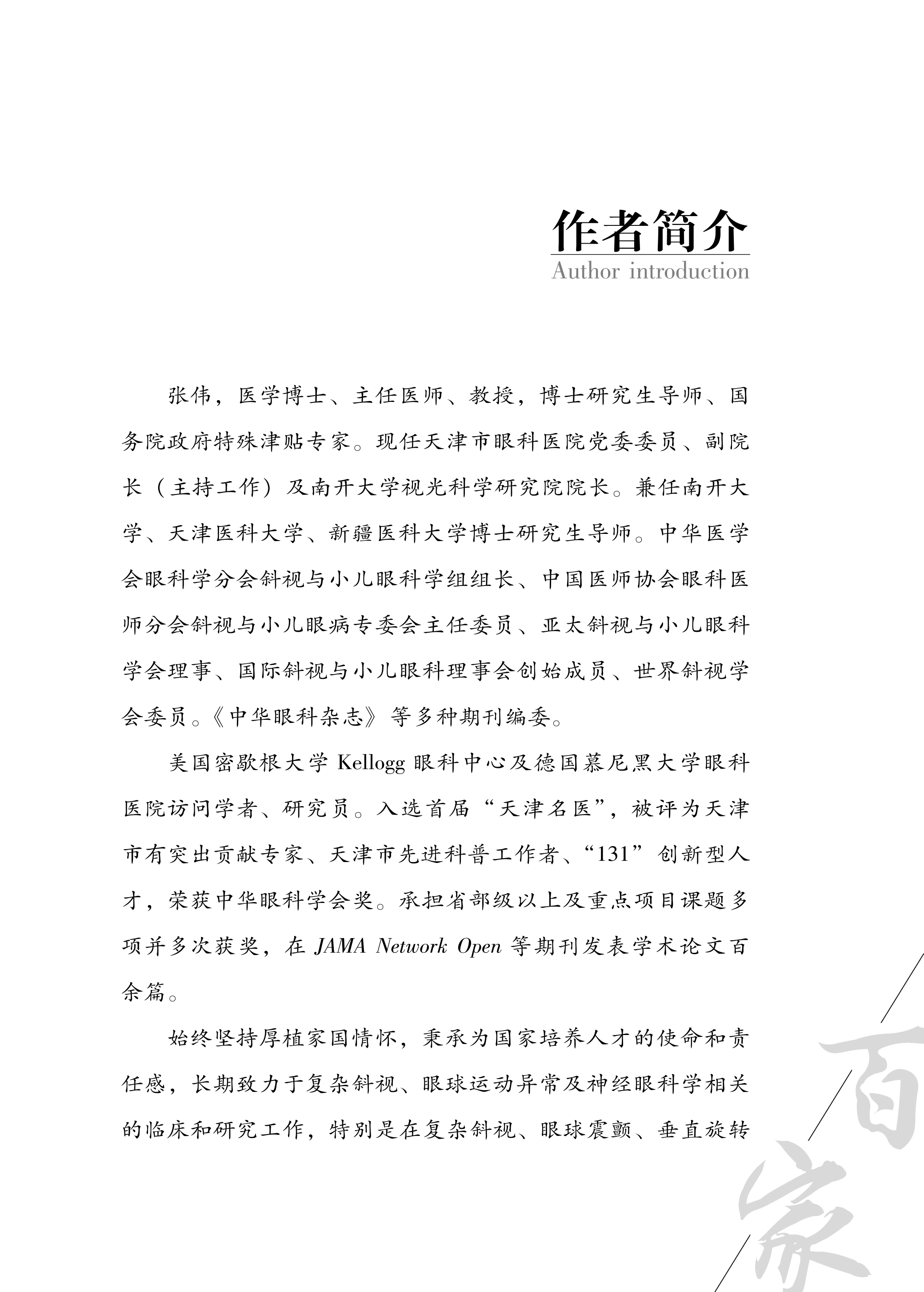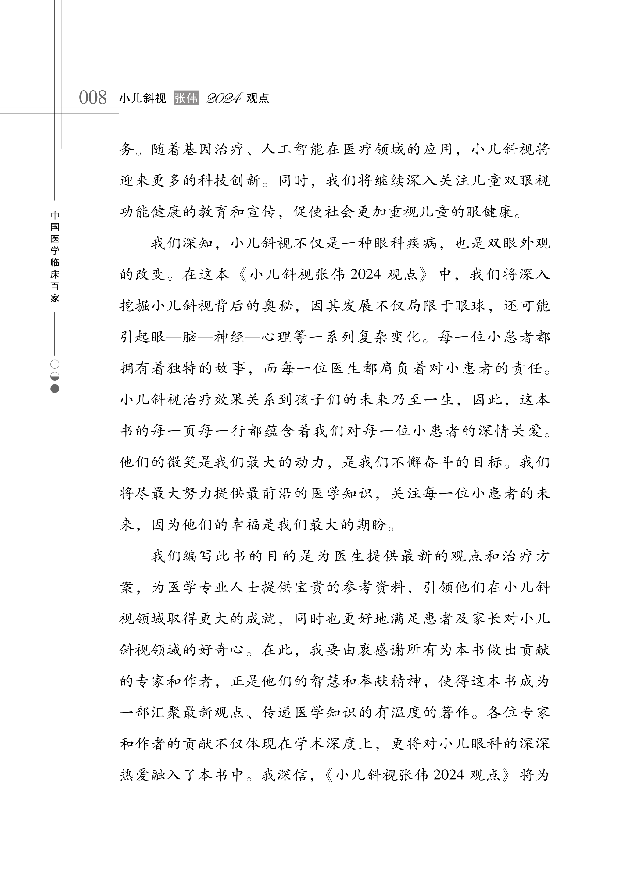 我们编写此书的目的是为医生提供最新的观点和治疗方案,为医学专业人士提供宝贵的参考资料,引领他们在小儿斜视领域取得更大的成就,同时也更好地满足患者及家长对小儿斜视领域的好奇心。在此,我要由衷感谢所有为本书做出贡献的专家和作者,正是他们的智慧和奉献精神,使得这本书成为一部汇聚最新观点、传递医学知识的有温度的著作。各位专家和作者的贡献不仅体现在学术深度上,更将对小儿眼科的深深热爱融入了本书中。我深信,《小儿斜视张伟2024观点》将为您解惑答疑,点燃您对未知的好奇心,给予您全新的视角,为您的工作和生活带来新的启示和帮助,成为您的得力助手。本书并非终点,而是一个探索小儿斜视知识的起点。