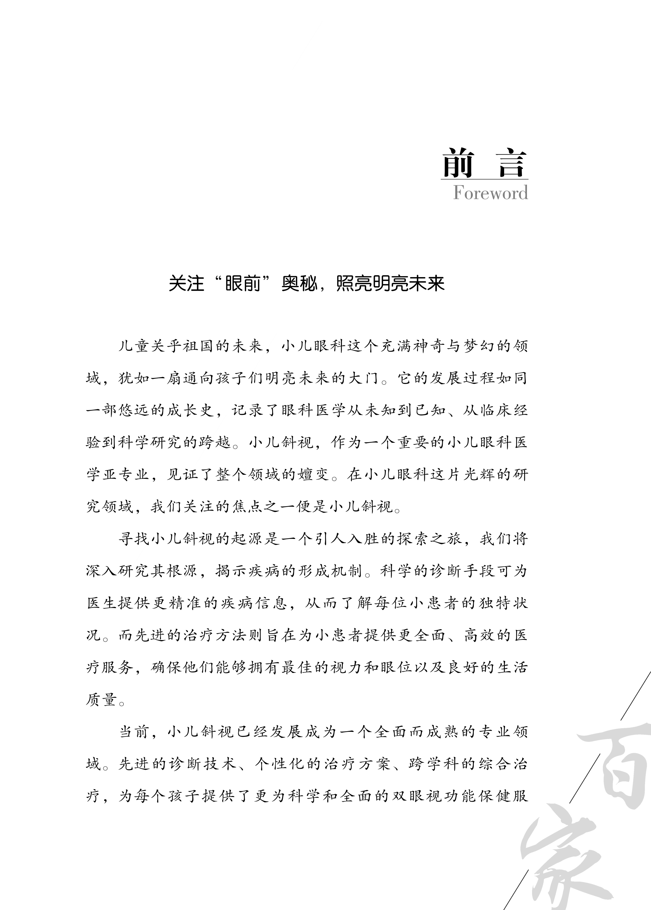 儿童关乎祖国的未来,小儿眼科这个充满神奇与梦幻的领域,犹如一扇通向孩子们明亮未来的大门。它的发展过程如同一部悠远的成长史,记录了眼科医学从未知到已知、从临床经验到科学研究的跨越。小儿斜视,作为一个重要的小儿眼科医学亚专业,见证了整个领域的嬗变。在小儿眼科这片光辉的研究领域,我们关注的焦点之一便是小儿斜视。