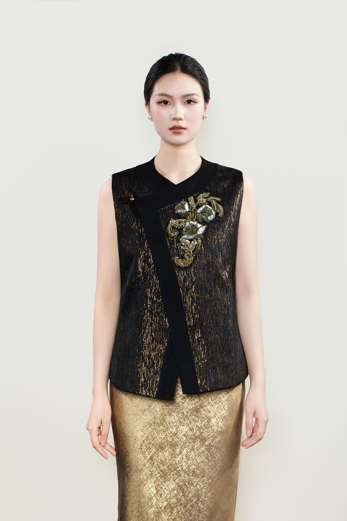 盛唐婧 |米杏色新中式国风提花上衣