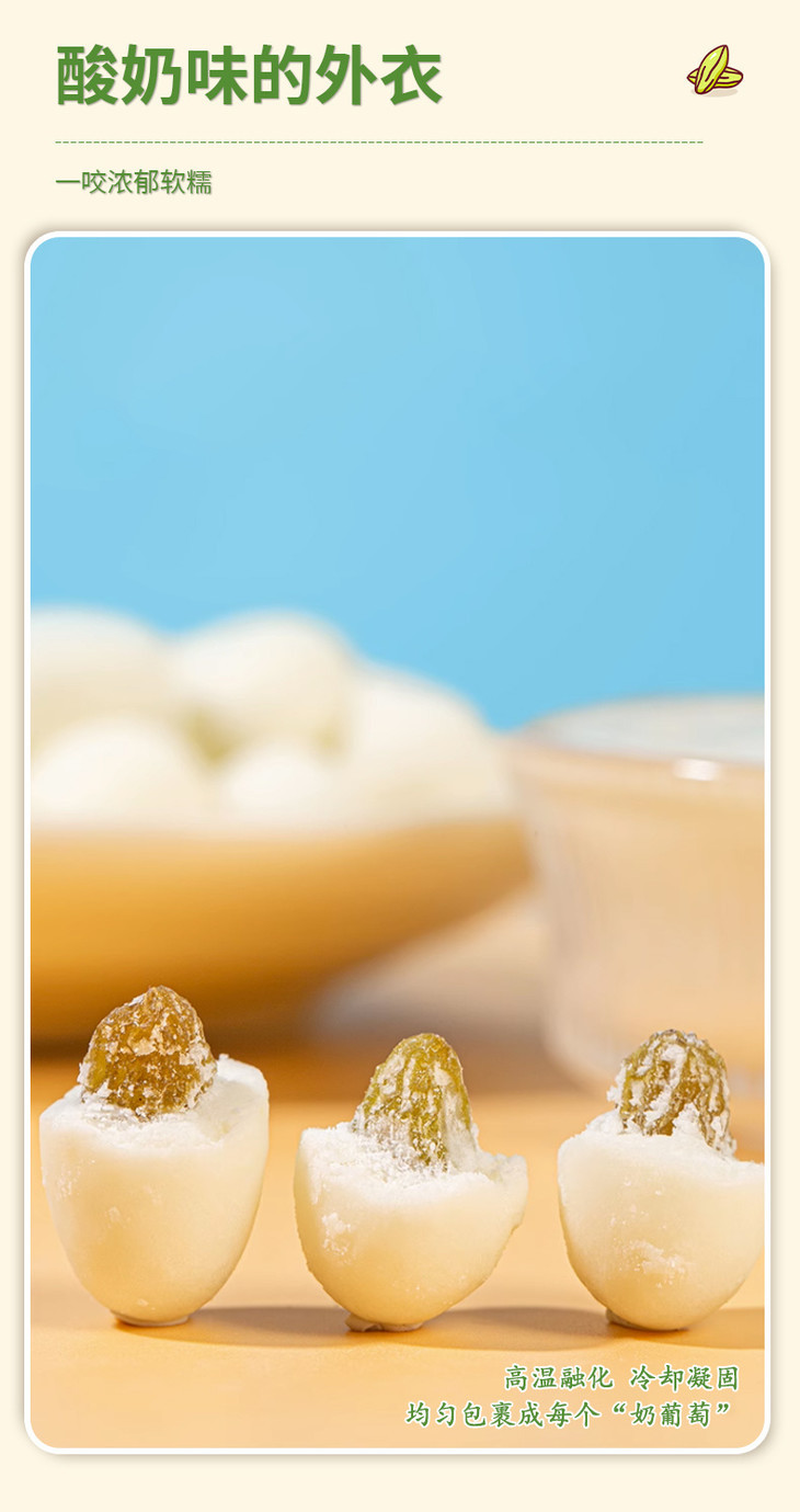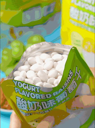 👉 打开袋,浓浓的酸奶味扑面而来 太好闻了吧!!! 😋 轻含在嘴,小奶球1秒开启“丝滑融化”模式 刚融化在舌尖,奶味就霸占了整个口腔 牙齿一路切入,香软奶层包着软糯的葡萄干 弹!软!糯!甜! 😱 家人们,谁懂啊,真的太美妙了~