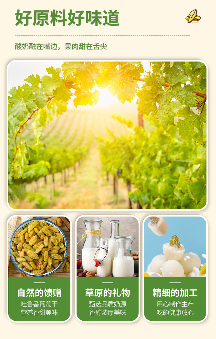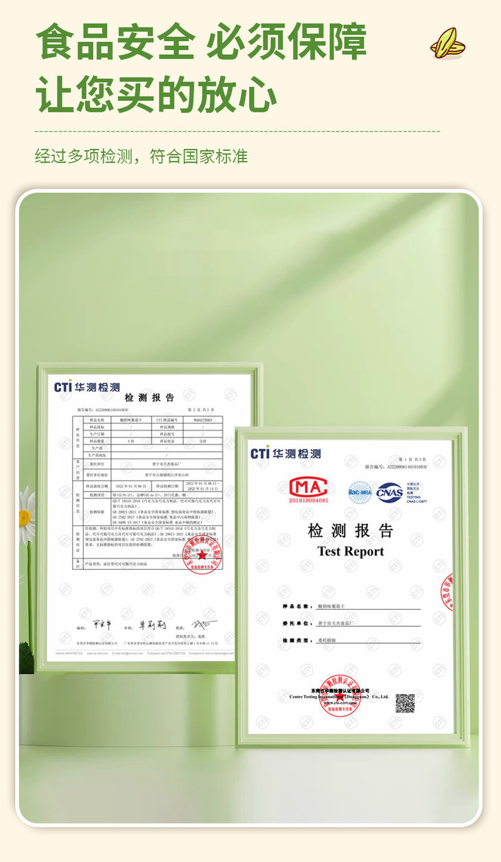 ❌ 市面上卖的酸奶味葡萄干品质参差不齐 味道上的差距也很大 ✅ 嘎巴嘴家的这款选材很挑剔 ✅ 并经过了专业机构的严格检测 配料安全,奶香浓郁,越嚼越香,体重无负担!