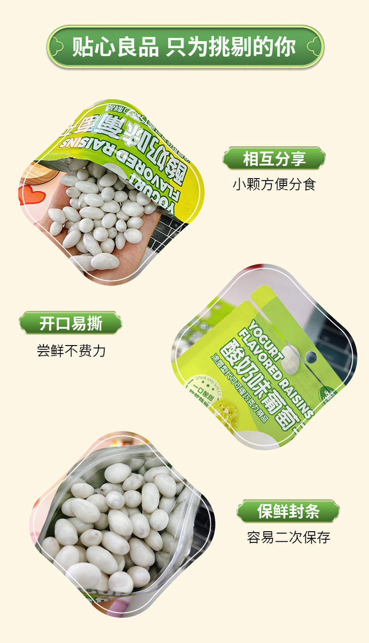 🍇 酸奶味葡萄干的点睛之笔当然少不了酸奶🥛 🥛 精选高品质酸奶粉,富含蛋白质维生素 粉质细腻,浓郁奶香扑面而来 白砂糖也是经过严格控制的量 不会过甜,还能天然保质 ✅ 历经多道工序做成山楂味葡萄干后 保留了原料该有的功效不会随着加工的过程而流失 营养美味又健康,完全不会甜腻