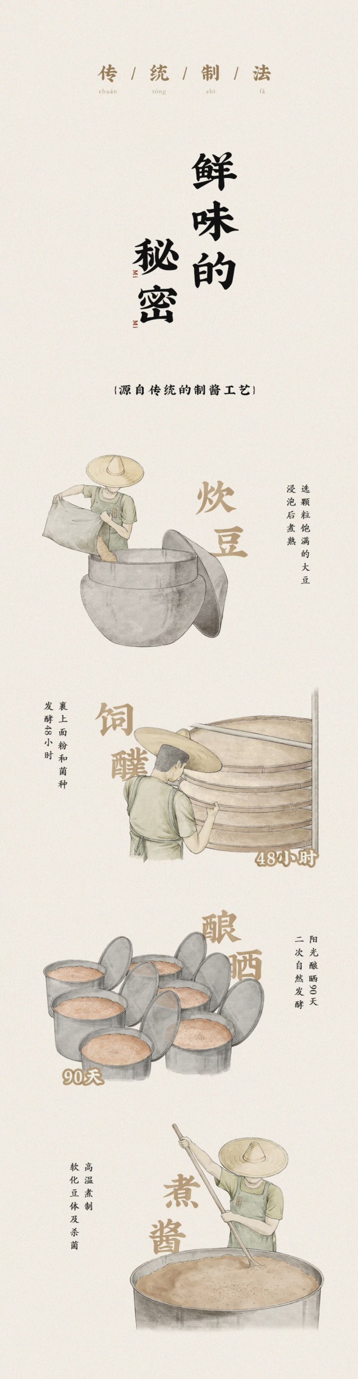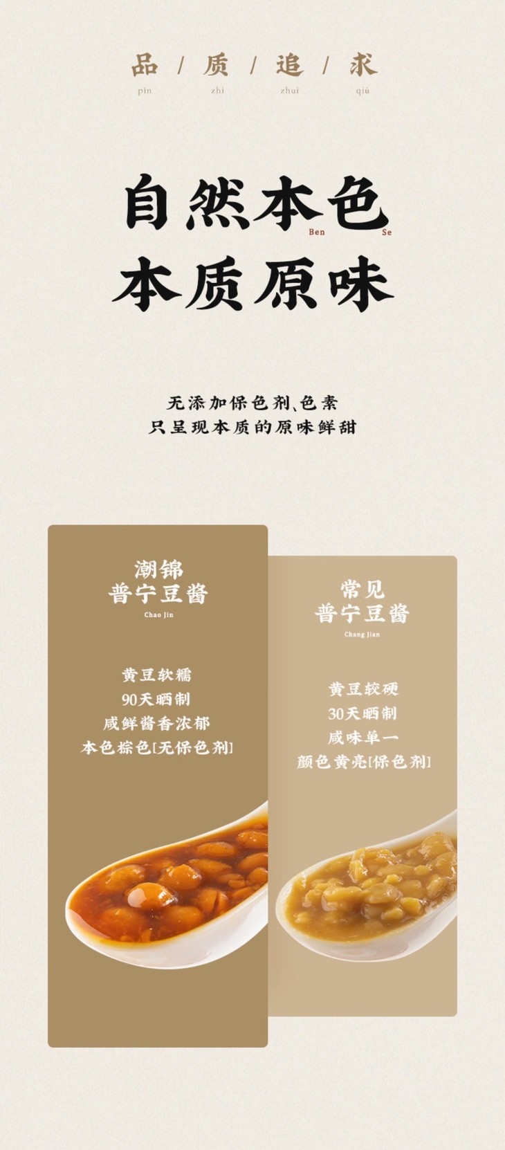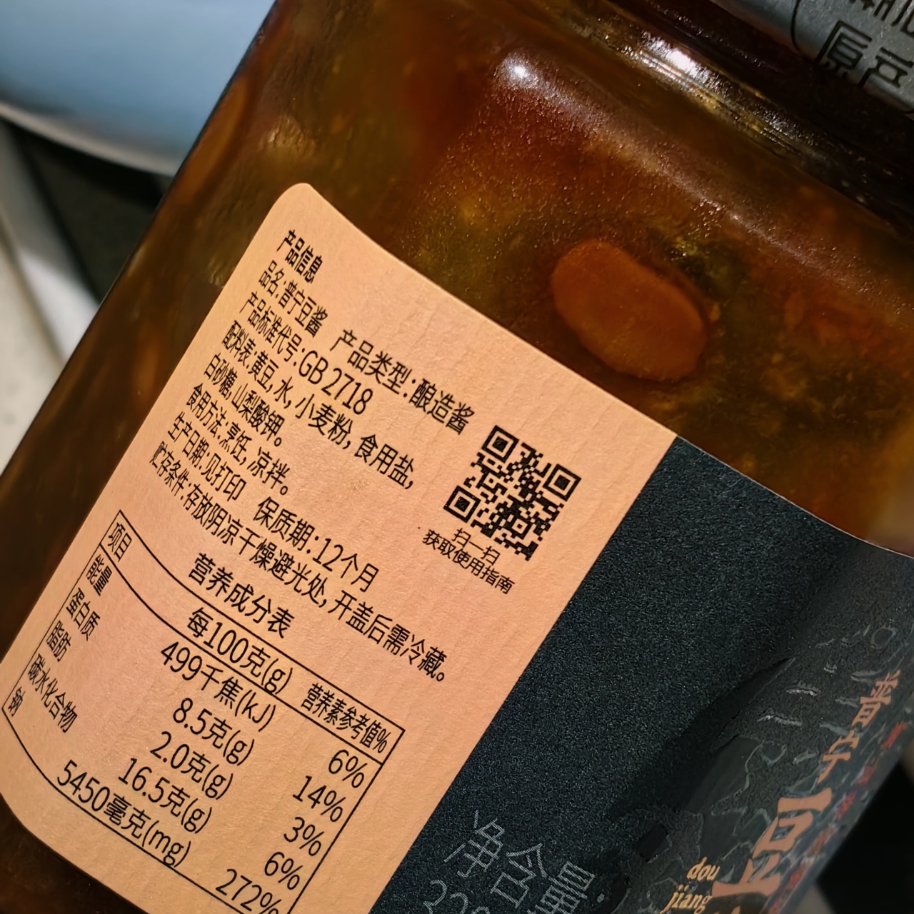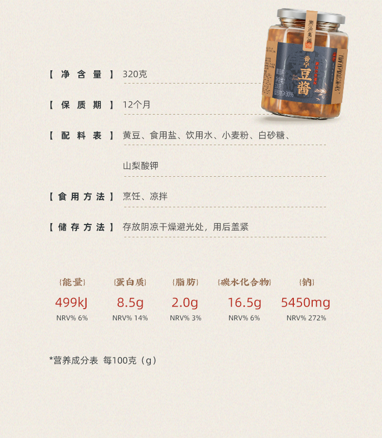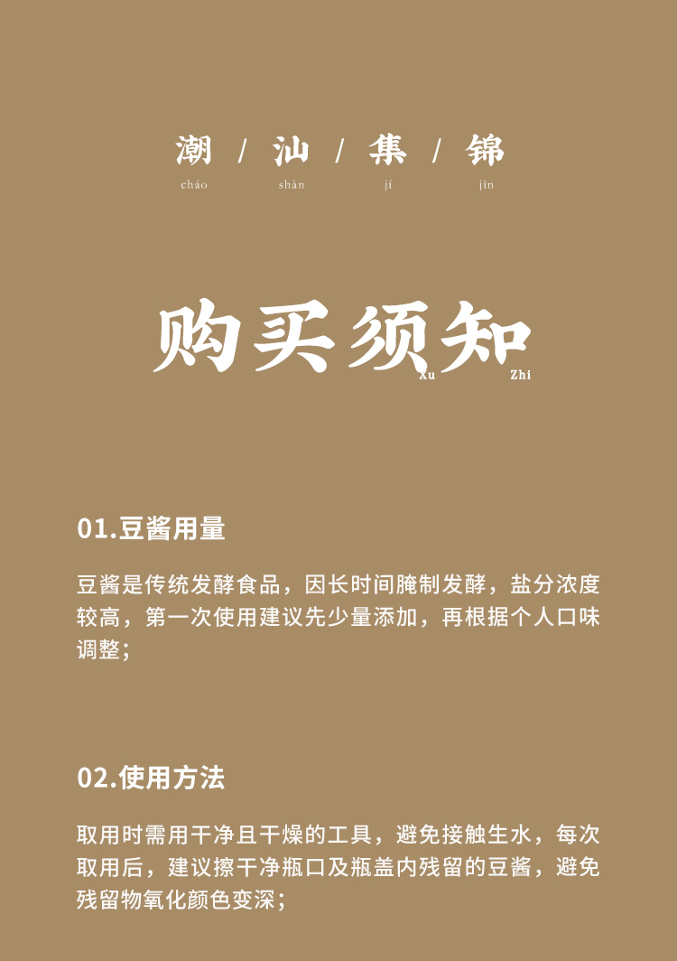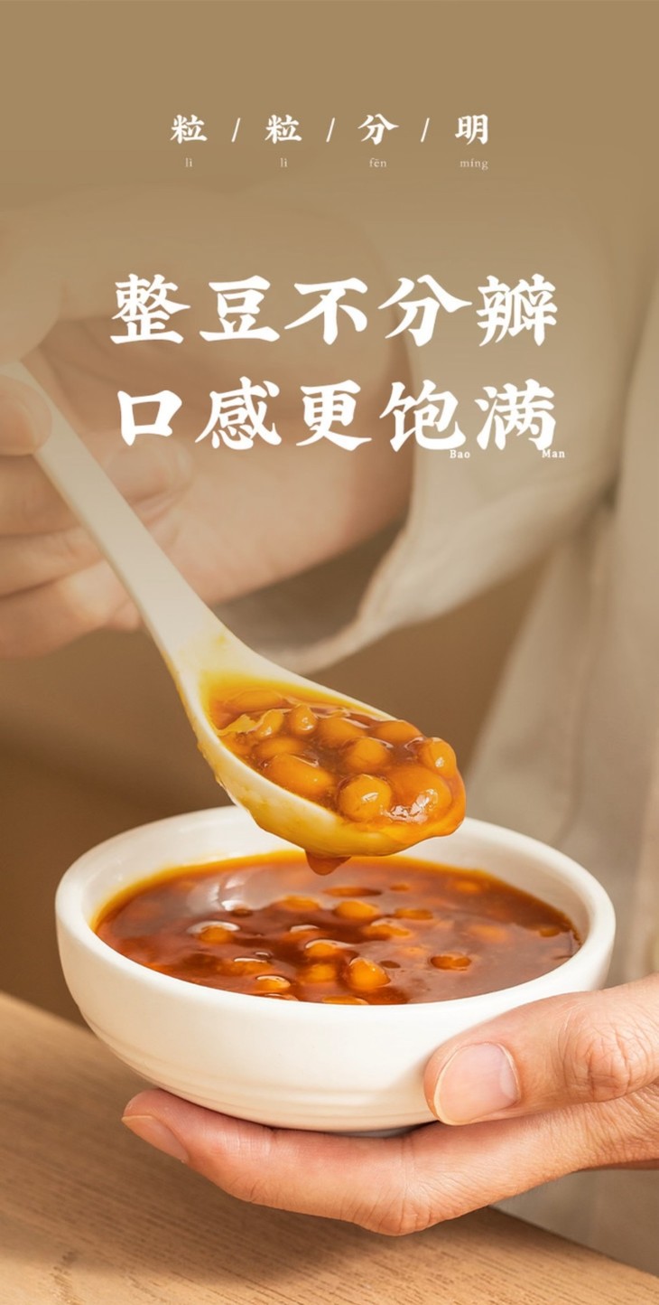 温馨小提示:豆酱作为咸味替代品,首次使用建议先少量添加,再根据个人口味调整;豆酱在封闭环境下可能持续发酵,开盖后有较浓的发酵豆香味,并非变质腐坏,不影响食用;豆酱中有白点和黑点,是豆子在长时间日晒发酵后,分解形成的浓度较高的氨基酸,容易结晶形成高温难溶的白点,部分氨基酸和大豆的种脐部位会在高温蒸煮过程偶尔会聚结形成深色颗粒,皆为正常现象,请放心食用。