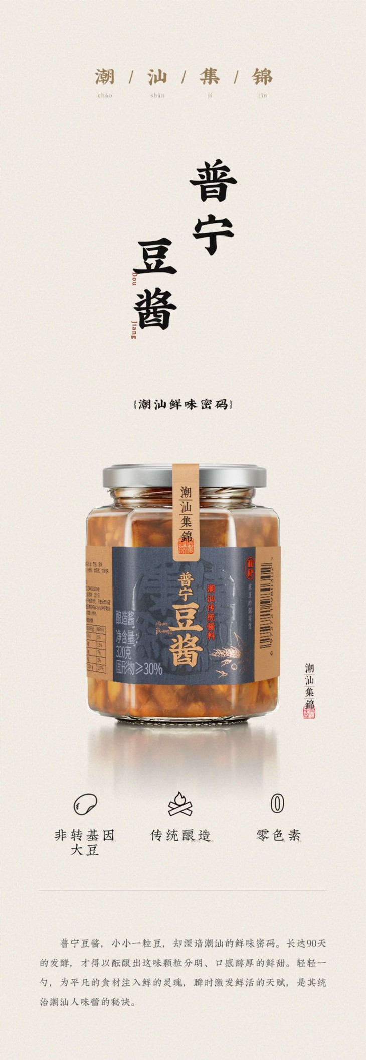 普宁豆酱,一瓶有320g,其实不小,因为很咸,每次真用不了许多。相较于其它,潮汕集锦的普宁豆酱是没有添加保色剂的,而且发酵了90天,就是自然棕黄色,不是白的哦!大大颗的黄豆粒,咸香味美,还带着一丝黄豆本身的鲜甜,超赞!