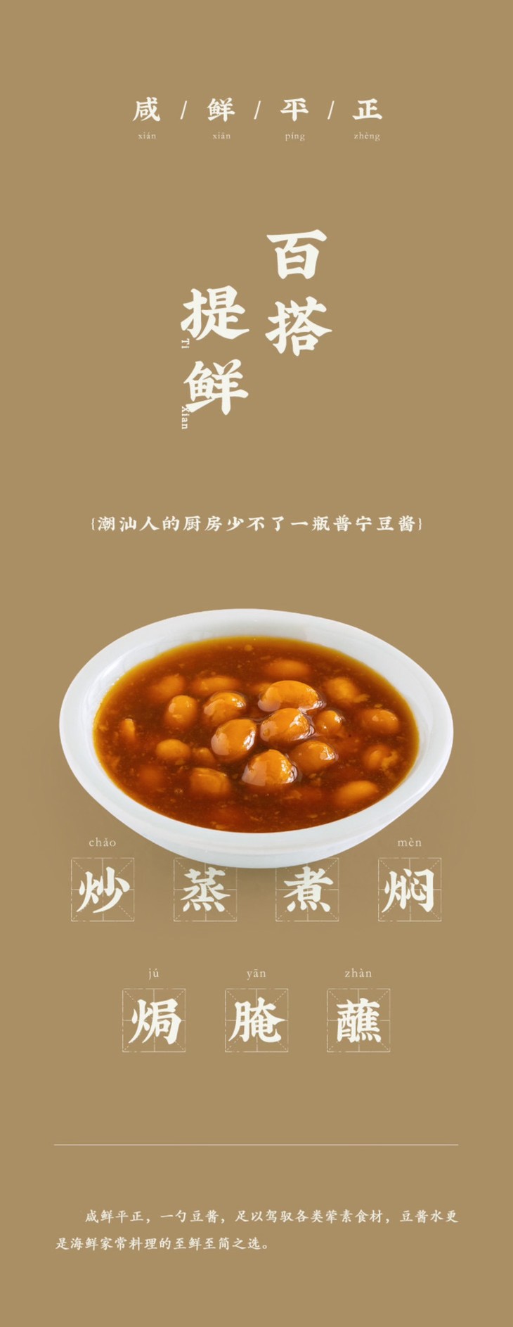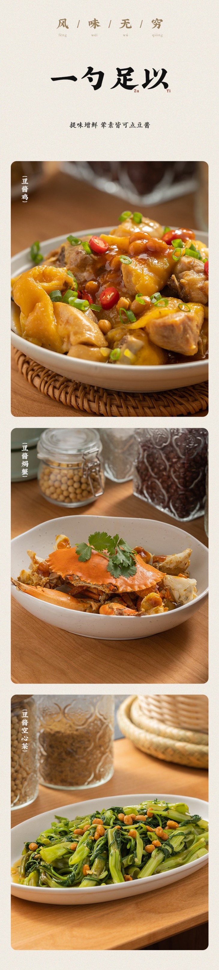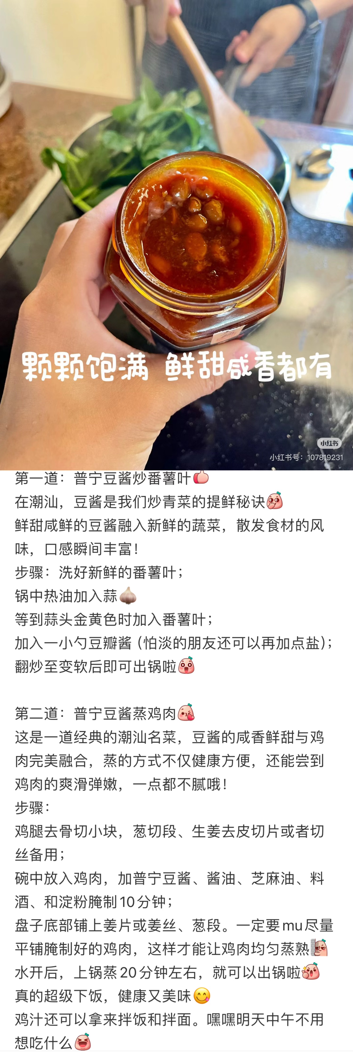 做法就更是多种多样了,主打一个百搭!可蒸肉,炒素菜,配海鲜,豆酱的魅力,在于直接蘸一蘸就是点睛,烹调起来更是别有一番风味!无论是潮汕人钟爱的鱼饭,还是清甜的豆腐淋豆酱,或者经典的白切鸡,豆酱的咸鲜能放大菜品的鲜甜,只要你喜欢,什么都好吃!我之前炒饭时就来上一丢丢,哇,瞬间有惊艳到,最近还尝试做了蒸排骨,也是配一脸!我最最喜欢的其实是配海鲜粥和炒空心菜,简单是灵魂!