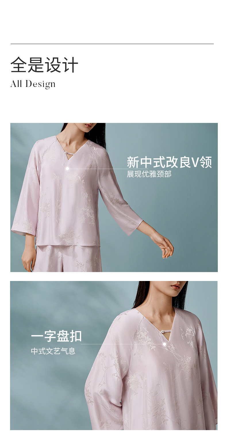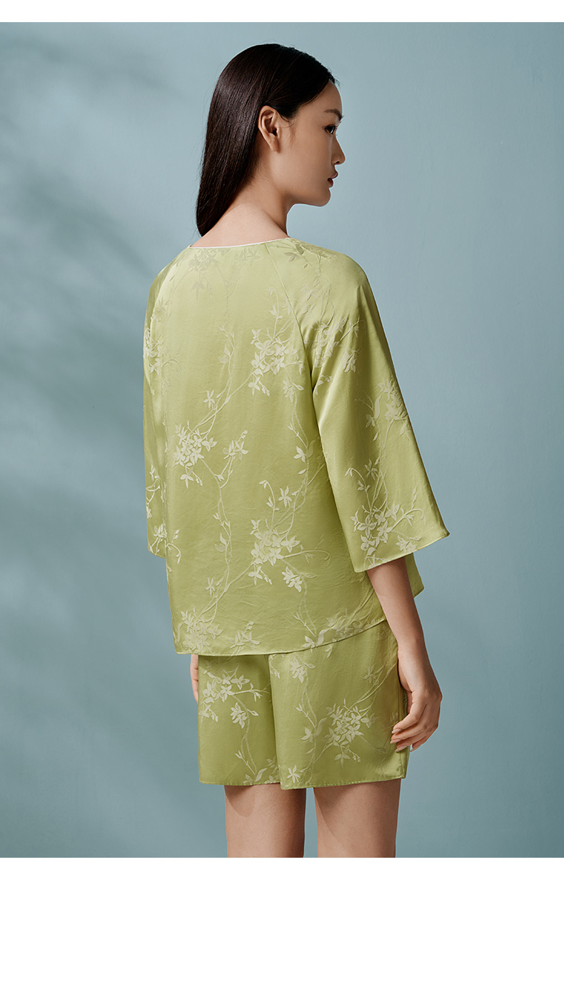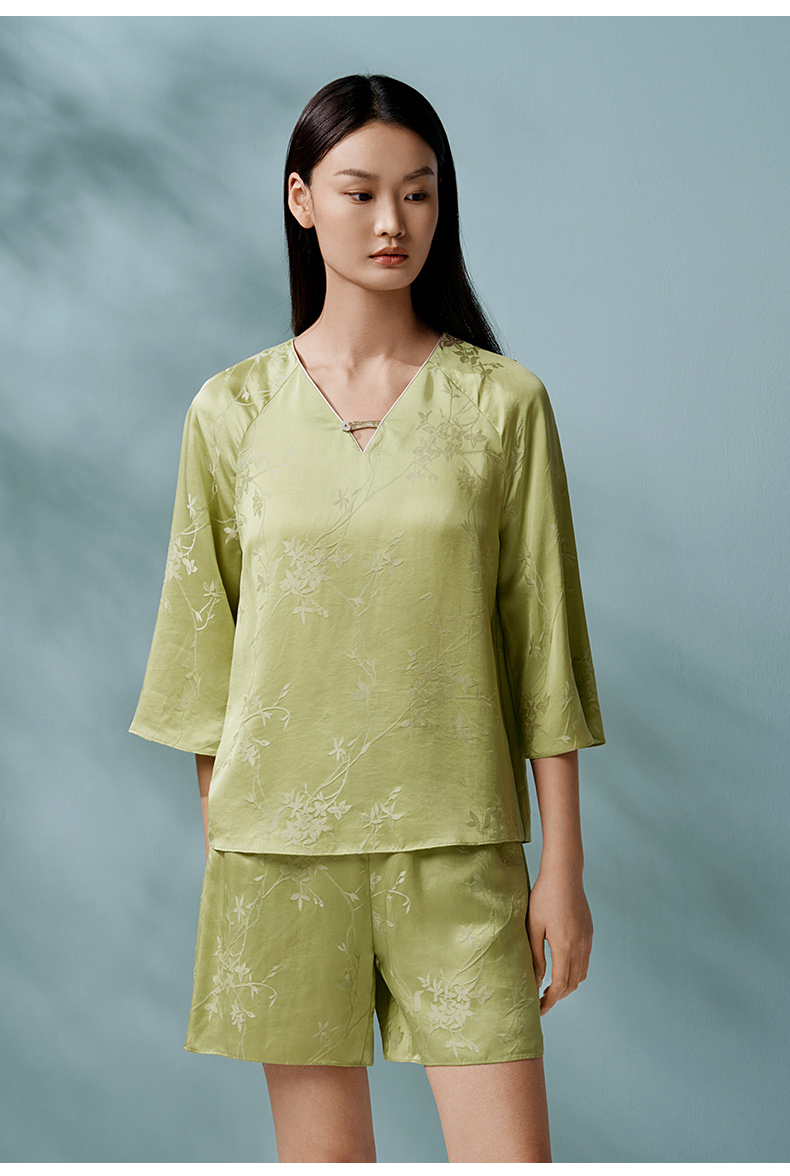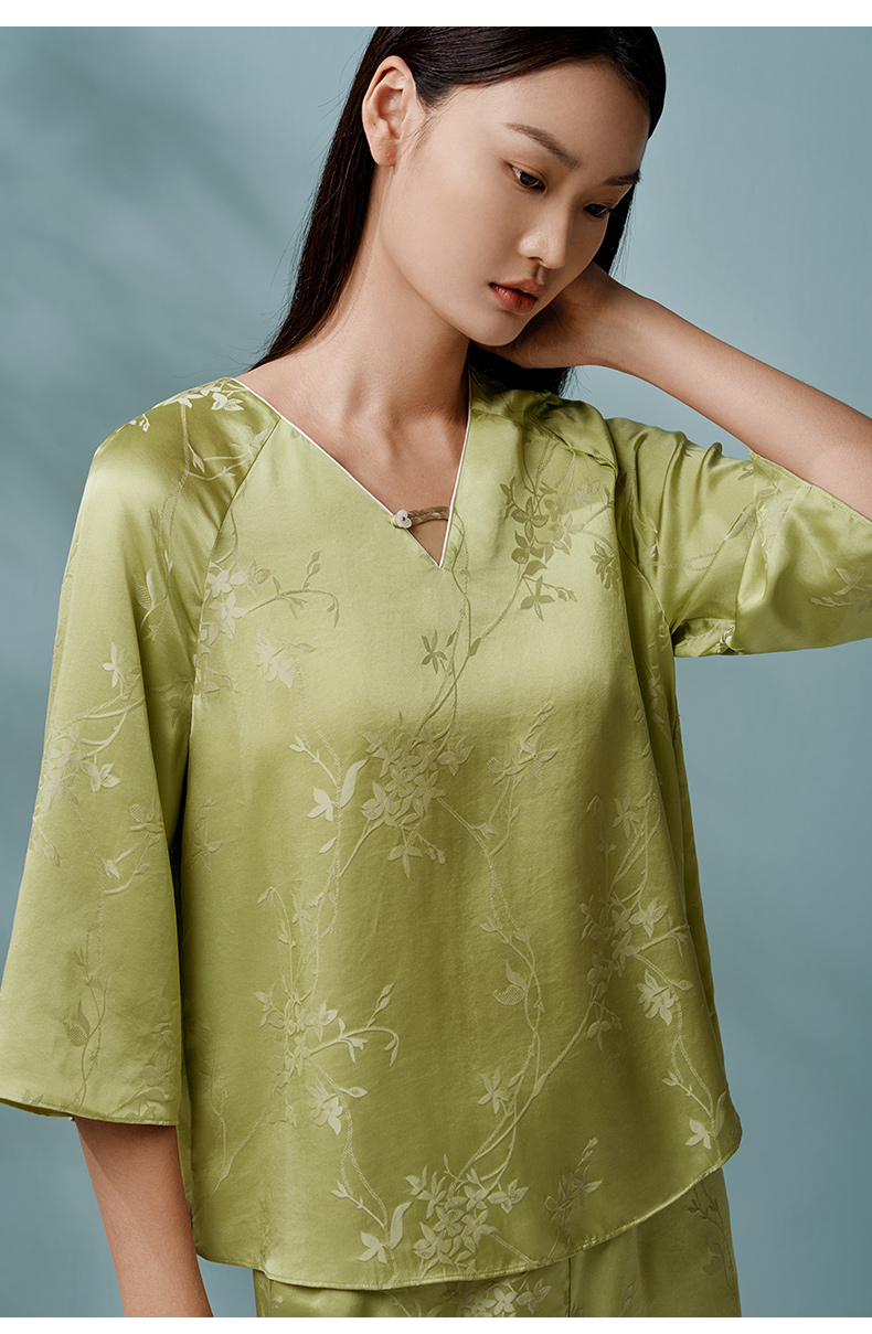 【绿绮花韵】新中式重磅桑蚕丝提花真丝睡衣女春夏家居服衣裤套金三塔 YSFFA204