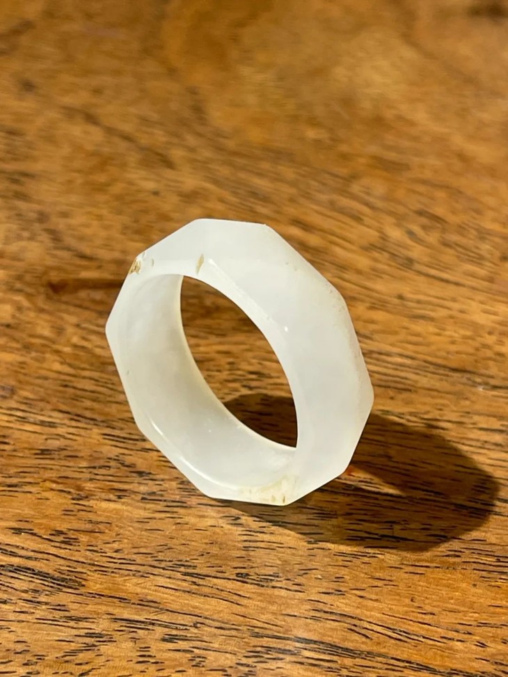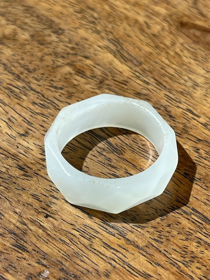 这是一只和田籽料白玉雕刻成菱格面老戒指,此色泽纯白略有褐色斑纹、质地细腻近羊脂白的指环,宽板型之戒面以宝石切割面设计雕琢成多角菱格面,老包浆皮壳浑厚,玉质细腻温润,非常难得的老白玉戒指。